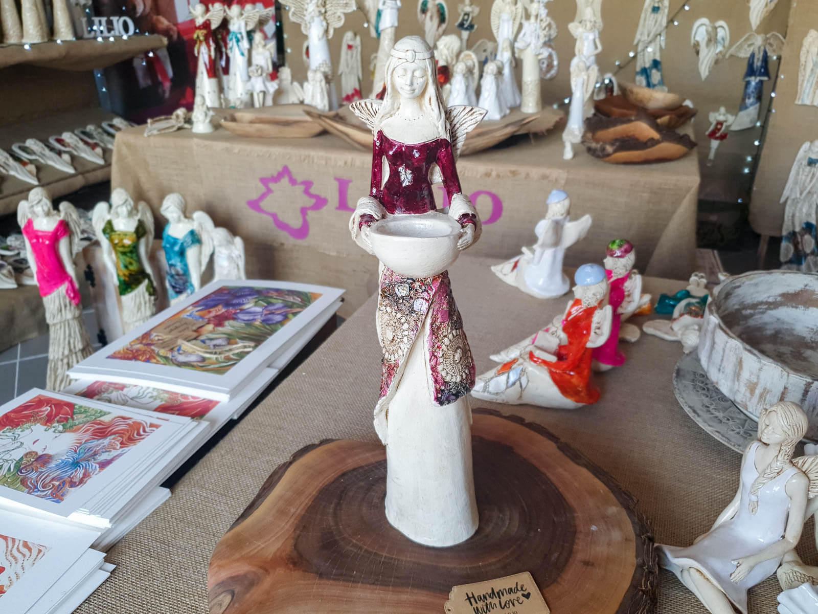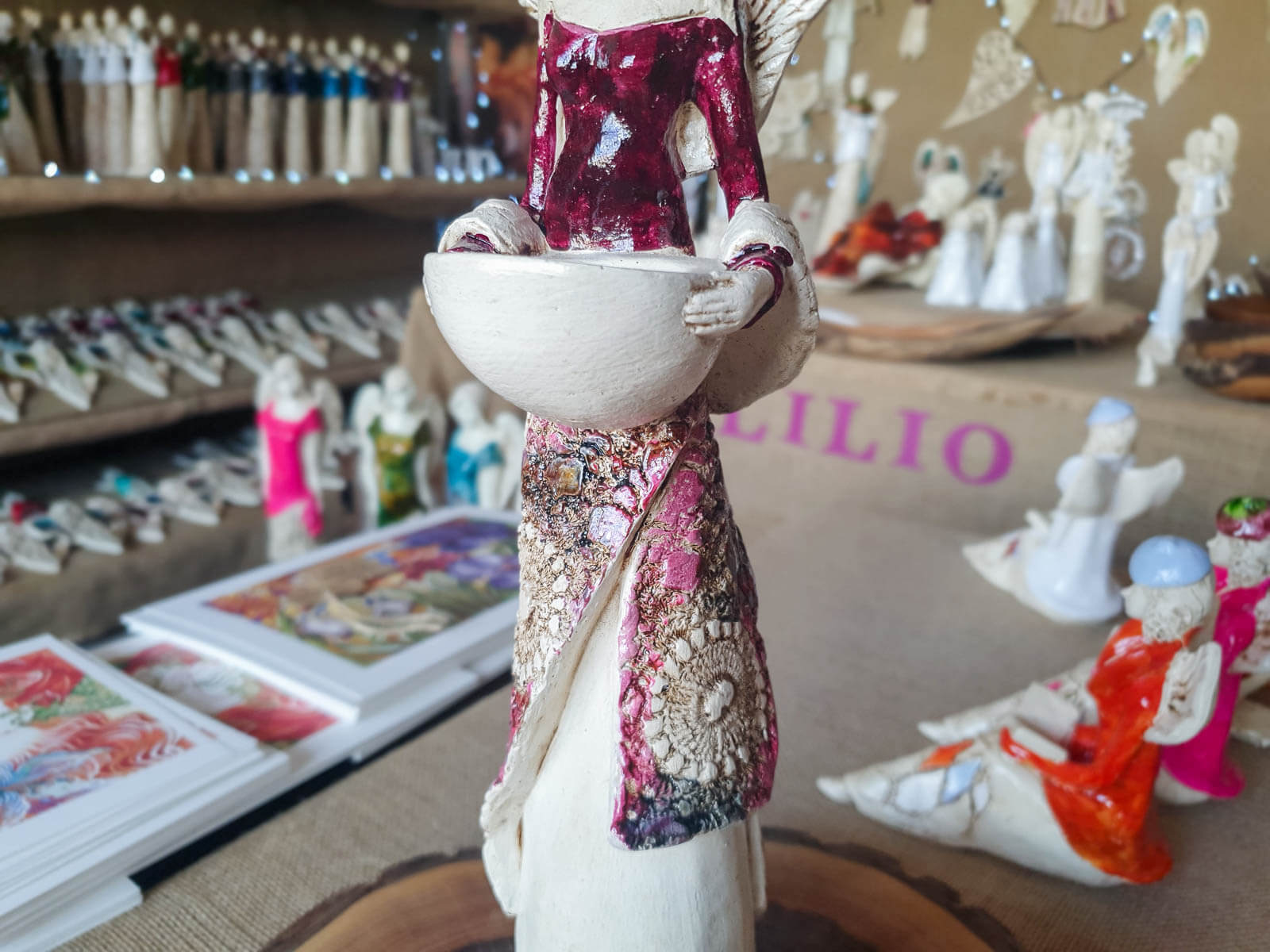 Anioł Florence w burgundowej sukni. Florence jest piękną kobietą, która ma na sobie długą suknię oraz jasne włosy sięgające za ramiona. Suknia posiada na górze dłuższą narzutkę w kolorze turkusowym z beżowymi ozdobami znajdującymi się przy jej końcu. Spod narzutki widnieje beżowa halka. Florence lubi biżuterię, ponieważ ma koralikowy naszyjnik oraz opaskę na głowie z okrągłą ozdobą. Jej skrzydła są małej wielkości uniesione do góry. W rękach trzyma wazę, do której można włożyć małą świeczkę i sprawić romantyczny klimat. Figurka wykonana jest z gipsu ręcznej produkcji. Należy do figurek stojących, dzięki czemu można ją gdziekolwiek postawić. Niezależnie od miejsca na pewno będzie przyciągać każdego uwagę. Anioł Florence idealnie nadaje się na prezent dla kobiety lub babci.