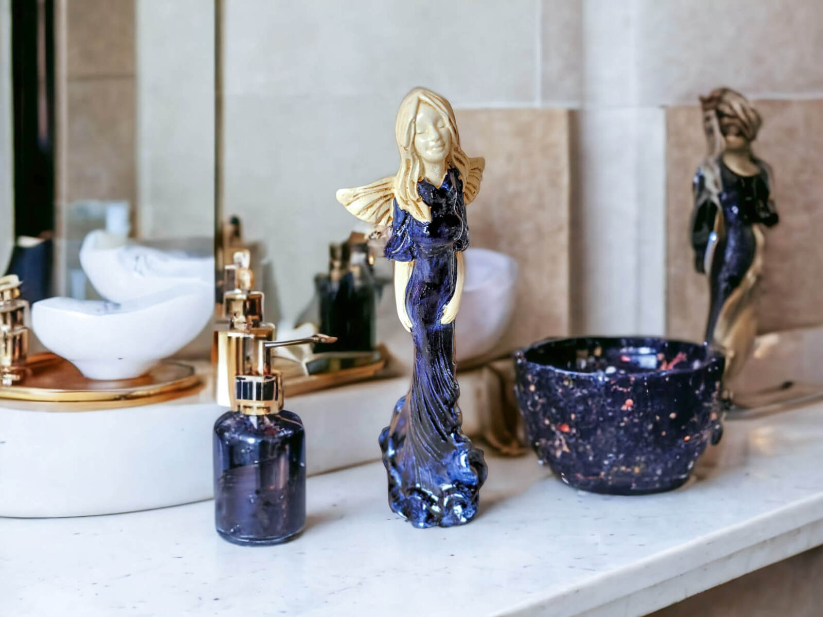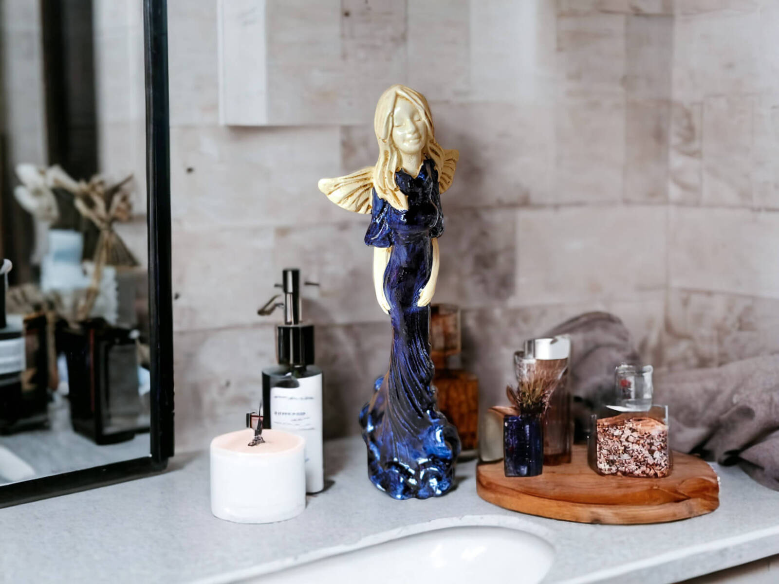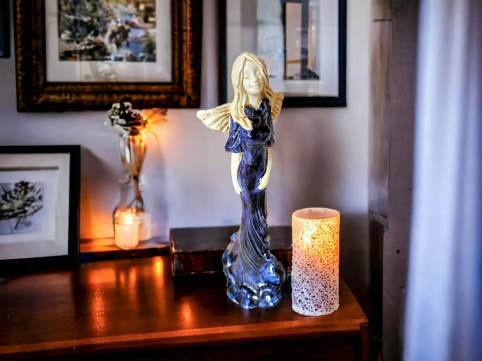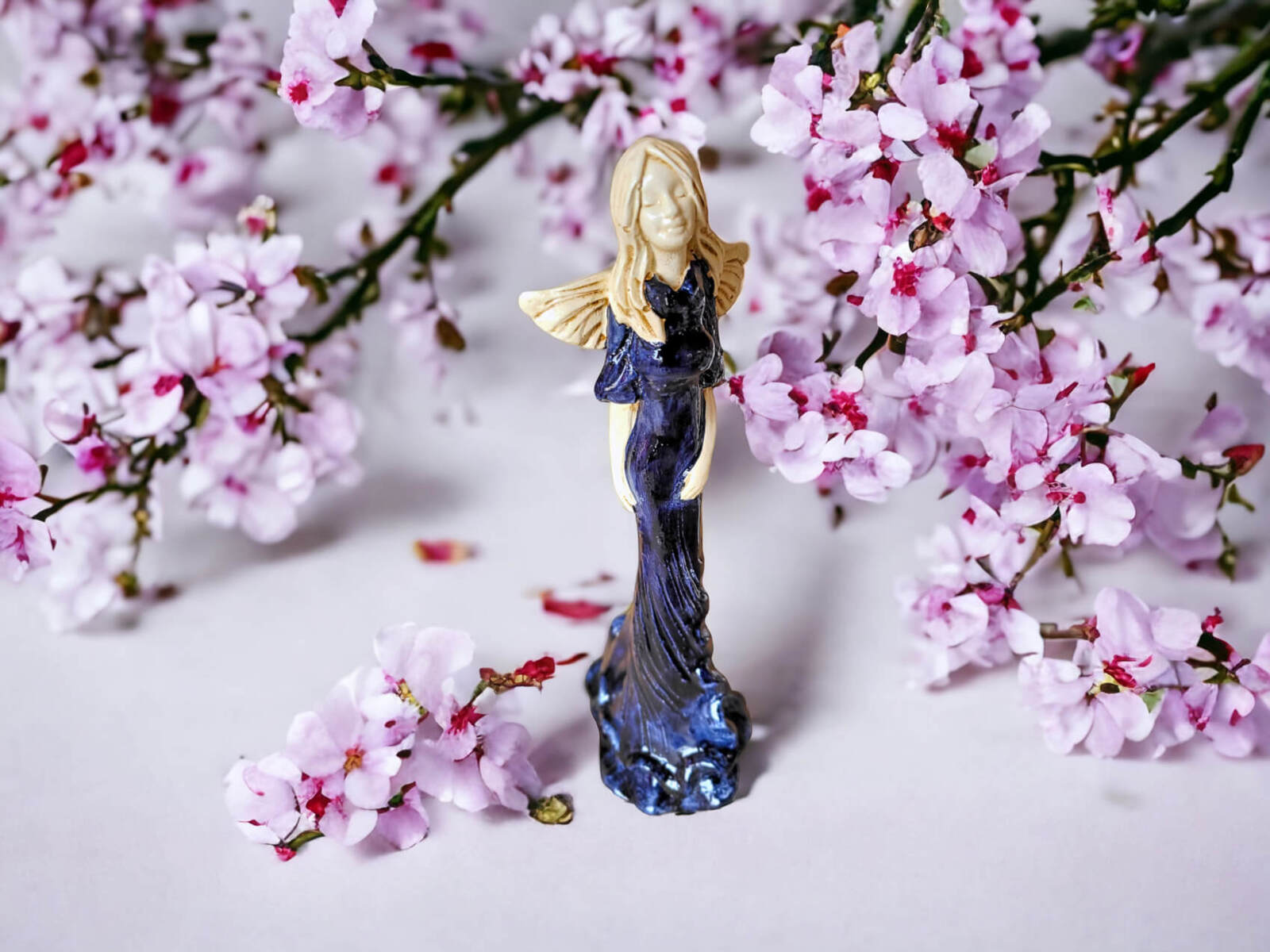 Anioł Margaret w ciemno granatowej sukni to ręcznie wykonana figurka. Jej imię wywodzi się od greckiego słowa ,,margerites” co oznacza ,,perła”. Gosia to skromna dziewczyna pełna wdzięku i uroku osobistego. Jest zawsze uśmiechnięta i optymistycznie nastawiona do życia. Urokiem i subtelnością przyciąga do siebie dużo adoratorów. Małgorzata pięknie prezentuje długą, jasno-granatową suknię. Ma delikatne skrzydełka. Idealnie nadaje się na prezent dla kobiet. Świetnie sprawdzi się jako ozdoba w każdym wnętrzu.