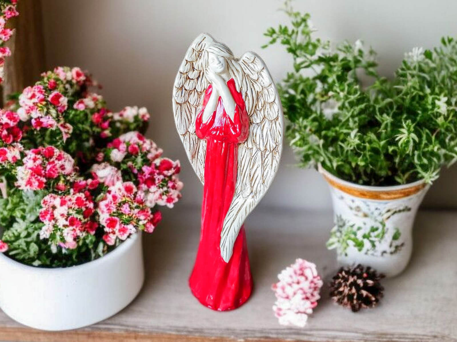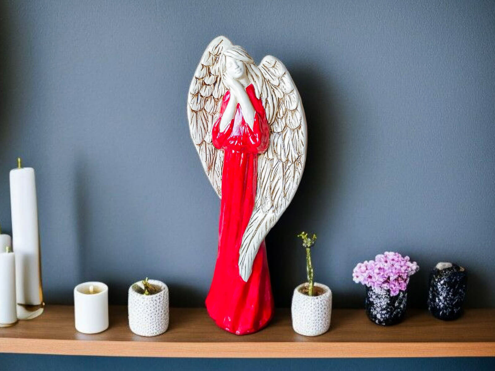 Anioł Gabriel w intensywnie czerwonej szacie to nie tylko piękna, ręcznie wykonana figurka – to symbol odwagi, miłości i duchowej obecności, który wnosi do każdego wnętrza energię i głębokie przesłanie. Stworzony z pasją przez polskich rzemieślników, każdy egzemplarz to unikalne dzieło – idealne na prezent, który ma znaczenie.