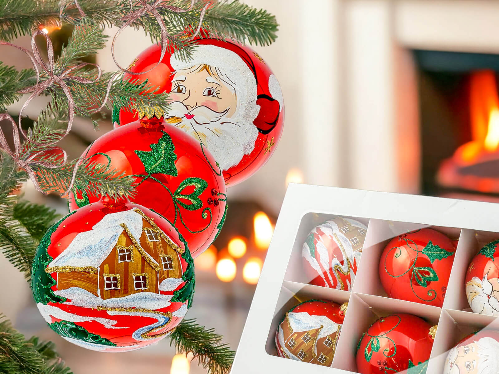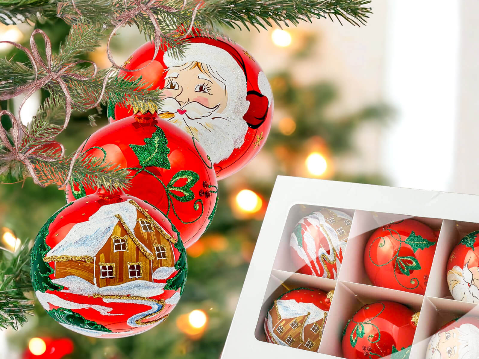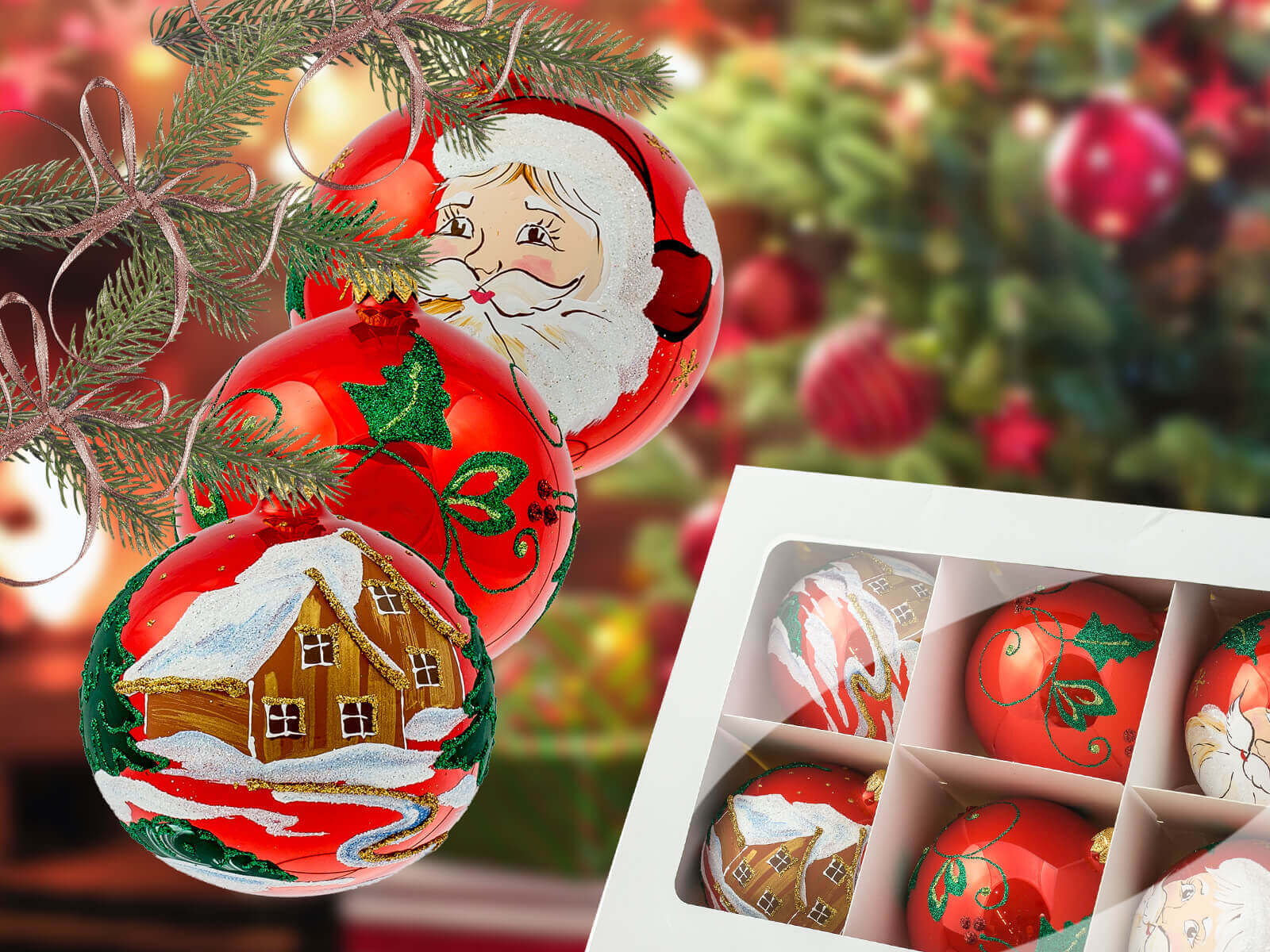 Czerwony błysk stanowi energetyczne tło dla złoto-zielonych zdobień, które ozdabiają chatki, Mikołaja i kosodrzew na powierzchni każdej z bombek. Precyzyjnie ręcznie nanoszone złote detale nadają bombkom wyjątkowego blasku, tworząc efektowny zestaw, który z pewnością przyciągnie uwagę i stworzy wyjątkową atmosferę podczas świąt.
