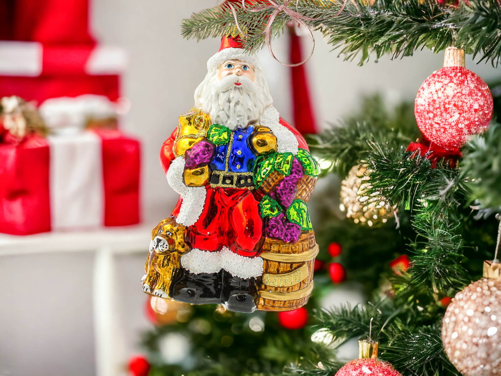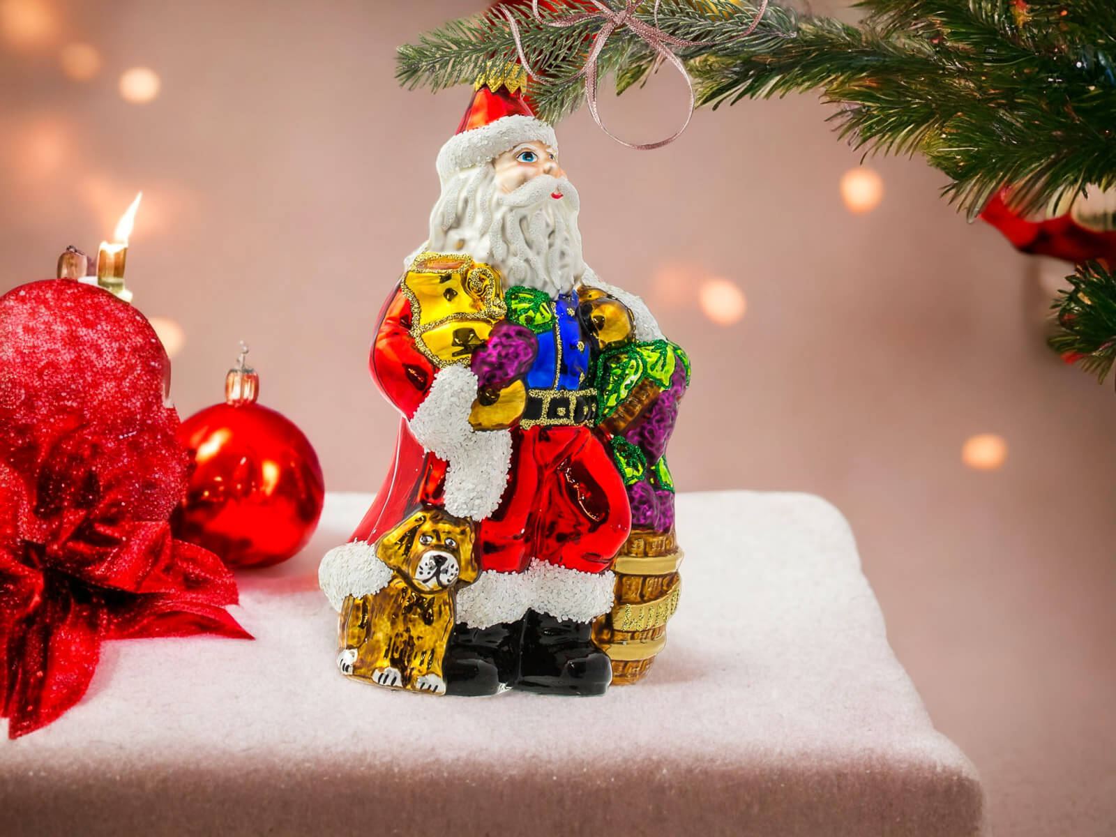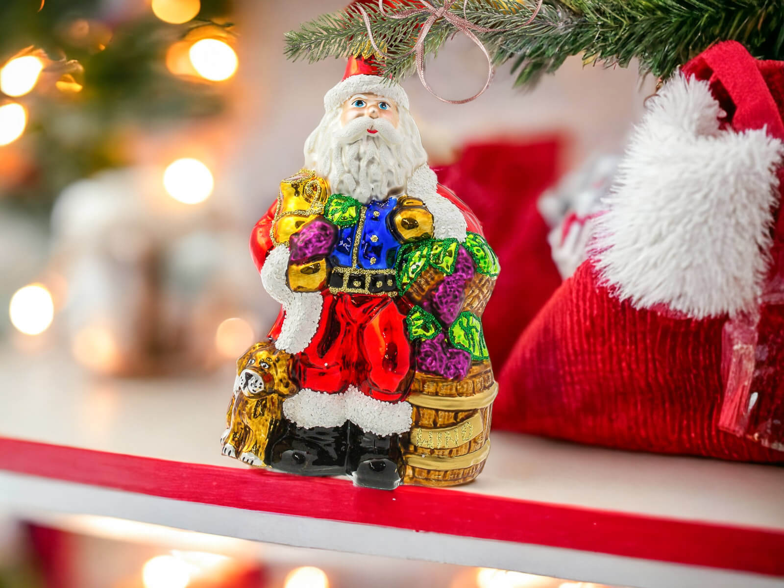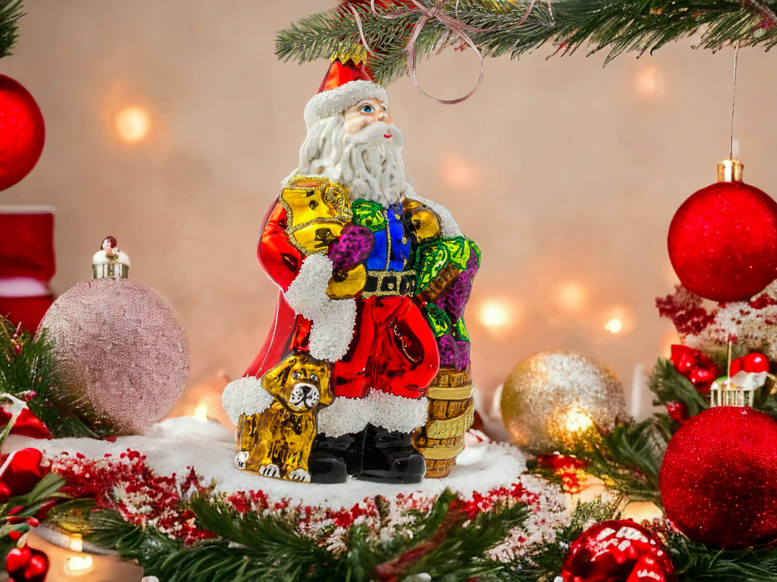 Każdy szczegół tej bombki wykonany jest z wyjątkową dbałością i precyzją – od wyrazistego uśmiechu Świętego Mikołaja, przez śnieżnobiałą brodę, aż po mieniące się detale na worku pełnym prezentów i lśniące w oczach psa. Każda bombka jest tworzona ręcznie, co sprawia, że nie ma dwóch identycznych egzemplarzy. Artystyczne wykonanie i delikatne, ręczne malowanie nadają każdej ozdobie indywidualny charakter. Mikołaj, stojąc w świątecznym anturażu pełnym przyjaznych kolorów i detali, tworzy atmosferę ciepła i radości, przyciągając wzrok i wzbudzając uśmiech zarówno u dzieci, jak i dorosłych.