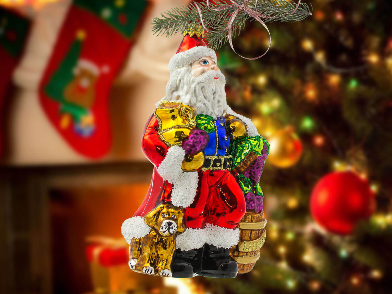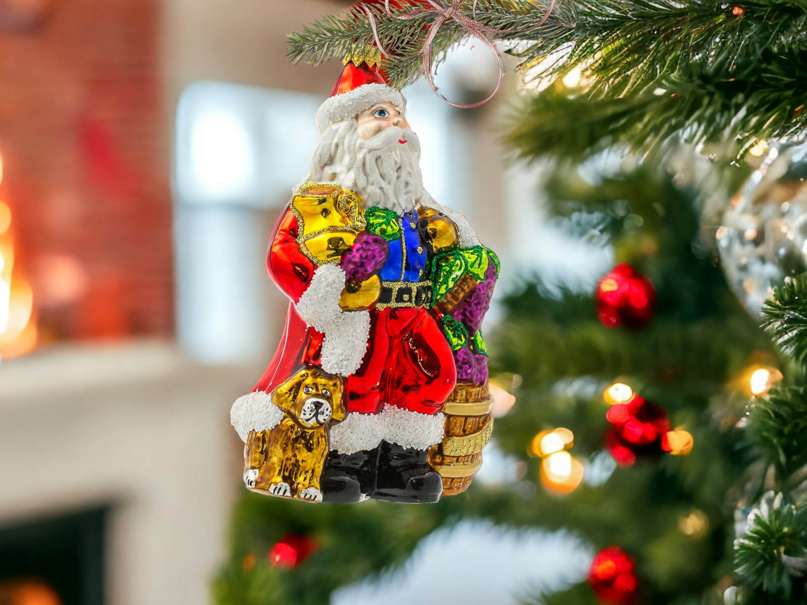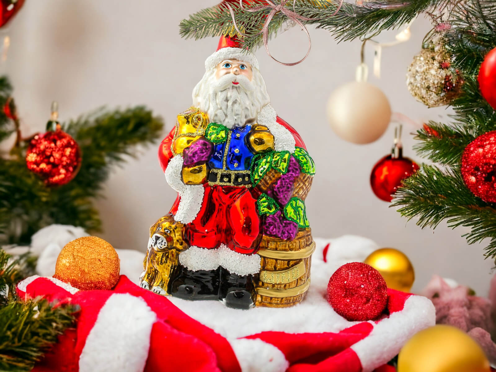 Każdy szczegół tej bombki wykonany jest z wyjątkową dbałością i precyzją – od wyrazistego uśmiechu Świętego Mikołaja, przez śnieżnobiałą brodę, aż po mieniące się detale na worku pełnym prezentów i lśniące w oczach psa. Każda bombka jest tworzona ręcznie, co sprawia, że nie ma dwóch identycznych egzemplarzy. Artystyczne wykonanie i delikatne, ręczne malowanie nadają każdej ozdobie indywidualny charakter. Mikołaj, stojąc w świątecznym anturażu pełnym przyjaznych kolorów i detali, tworzy atmosferę ciepła i radości, przyciągając wzrok i wzbudzając uśmiech zarówno u dzieci, jak i dorosłych.