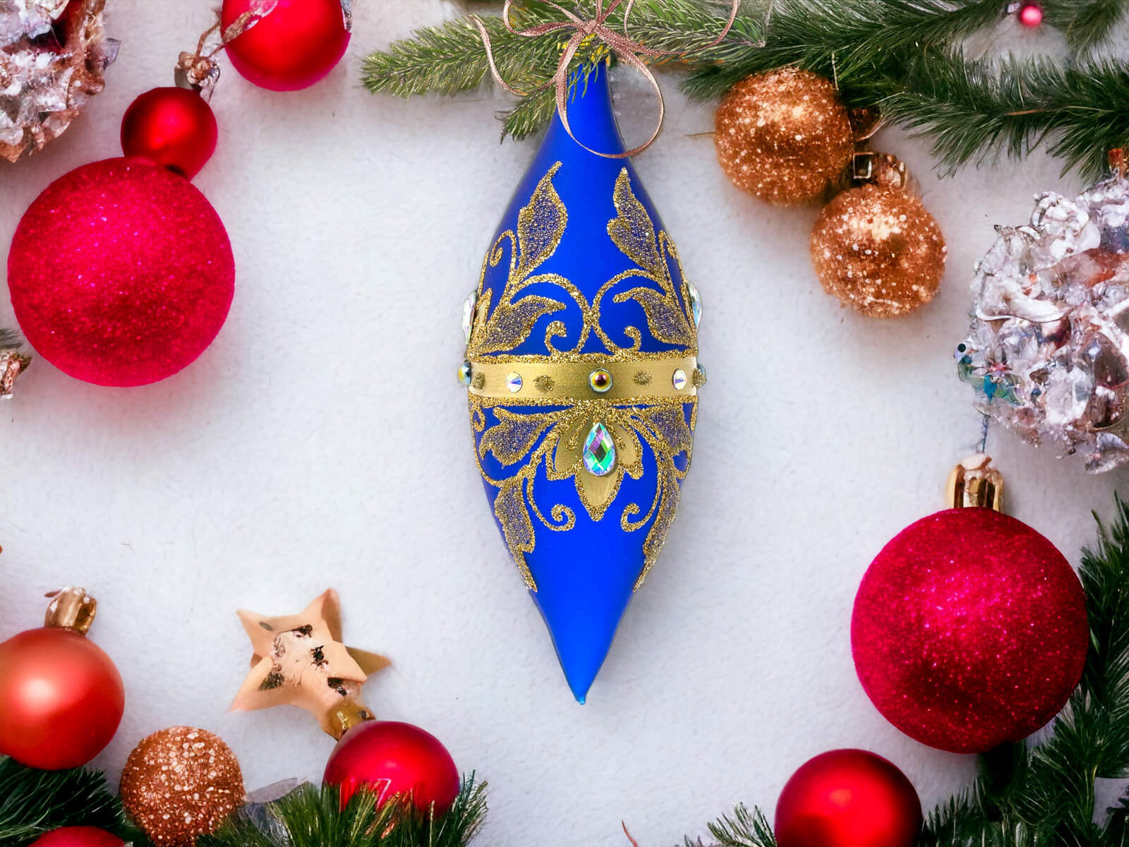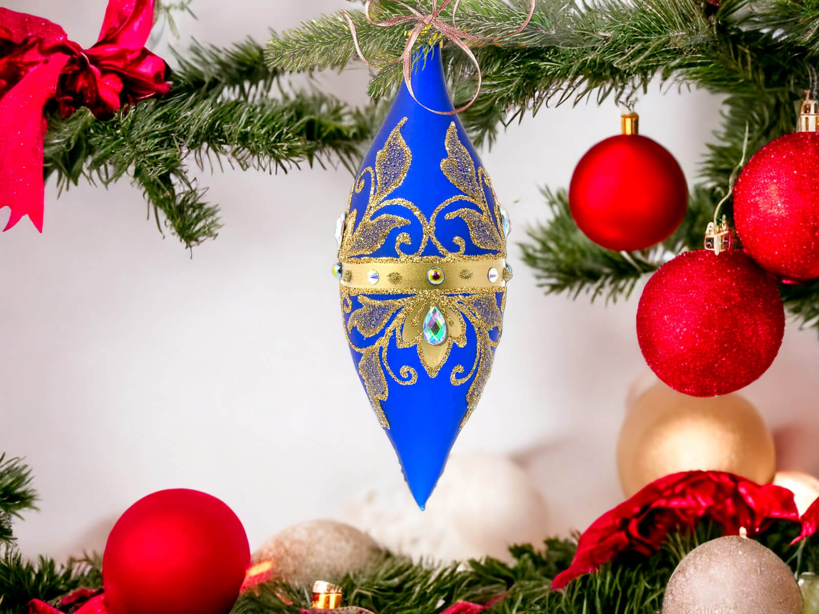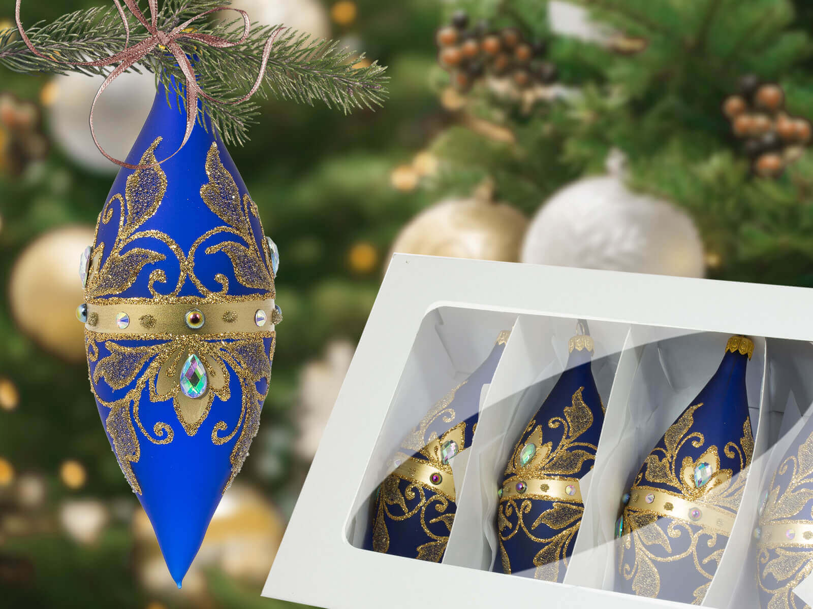 Komplet Szklanych Bombek Sople Królewskie Złote na Szafirowym Macie to wyjątkowy zestaw szklanych bombek, które zabiorą Cię w podróż po królewskim świecie świąt. Każda z czterech bombek to unikalne arcydzieło, stworzone ręcznie i malowane w Polsce z najwyższą precyzją.