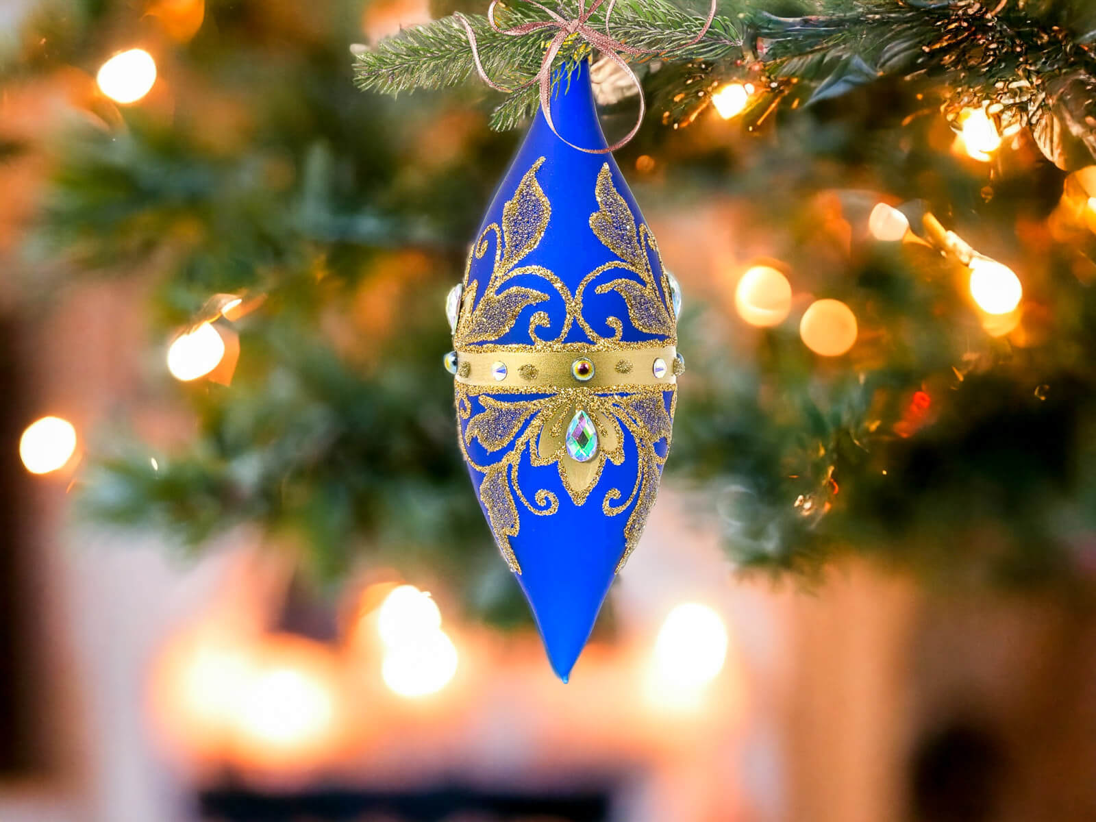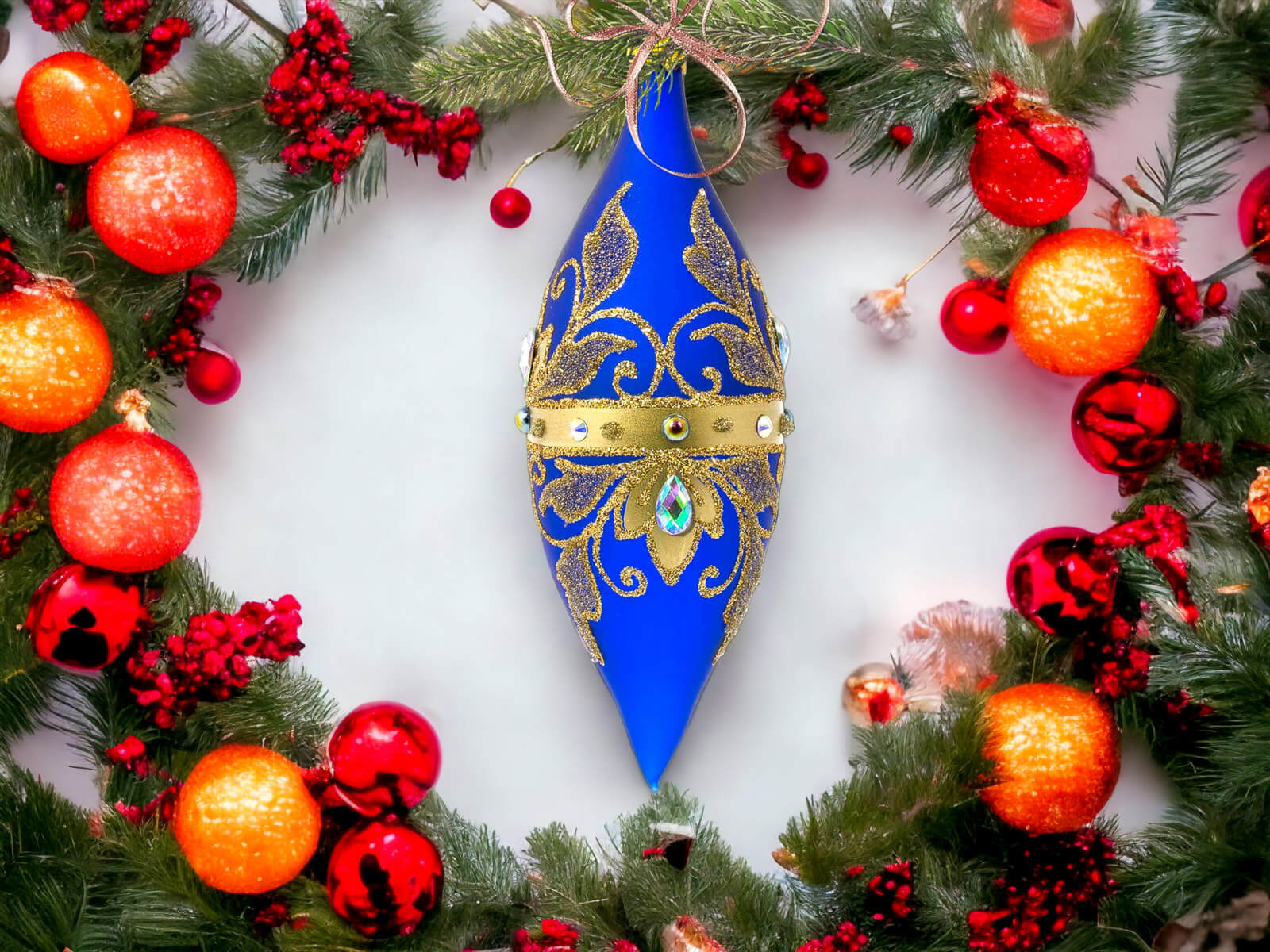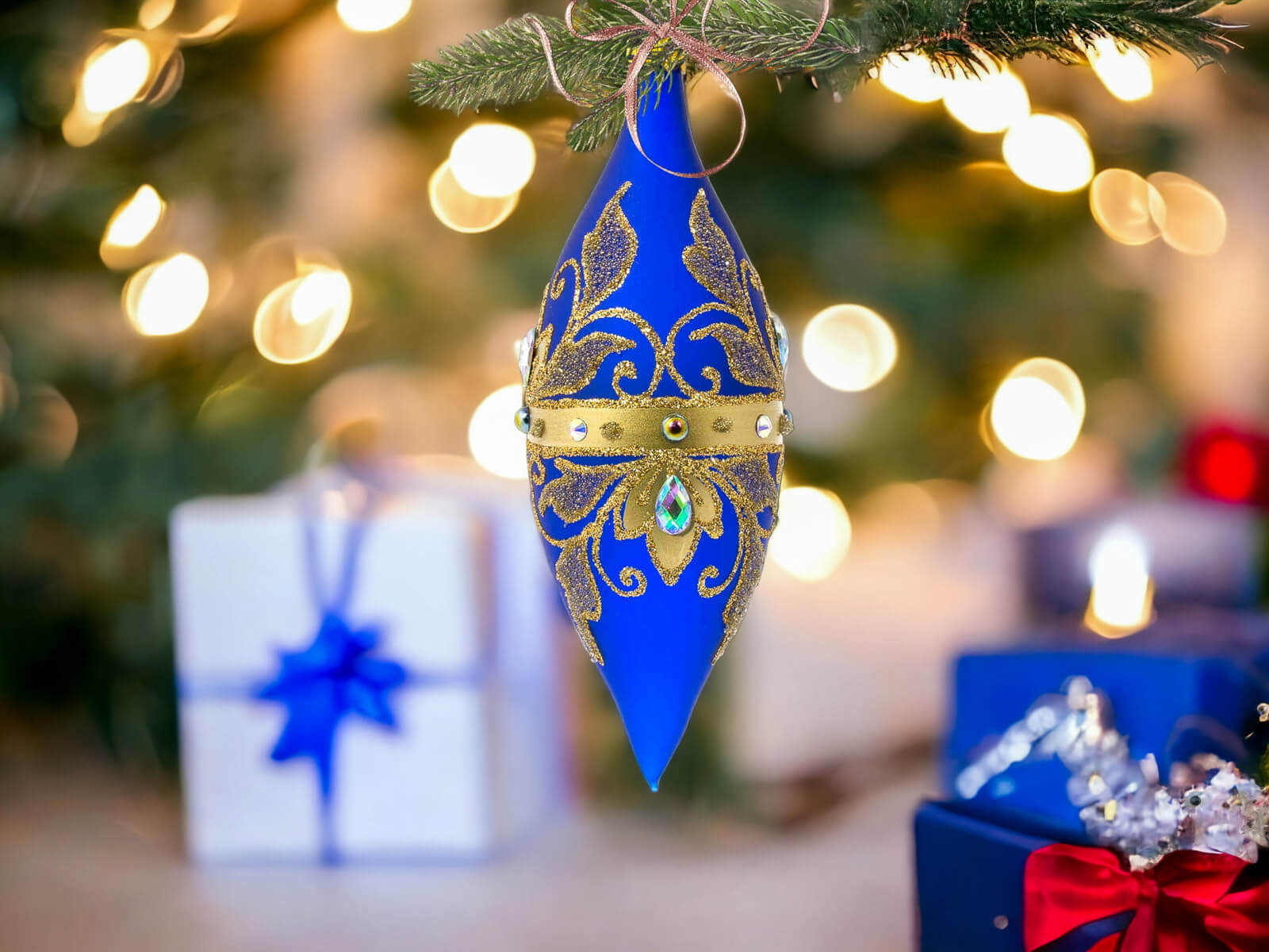 Komplet Szklanych Bombek Sople Królewskie Złote na Szafirowym Macie to wyjątkowy zestaw szklanych bombek, które zabiorą Cię w podróż po królewskim świecie świąt. Każda z czterech bombek to unikalne arcydzieło, stworzone ręcznie i malowane w Polsce z najwyższą precyzją.