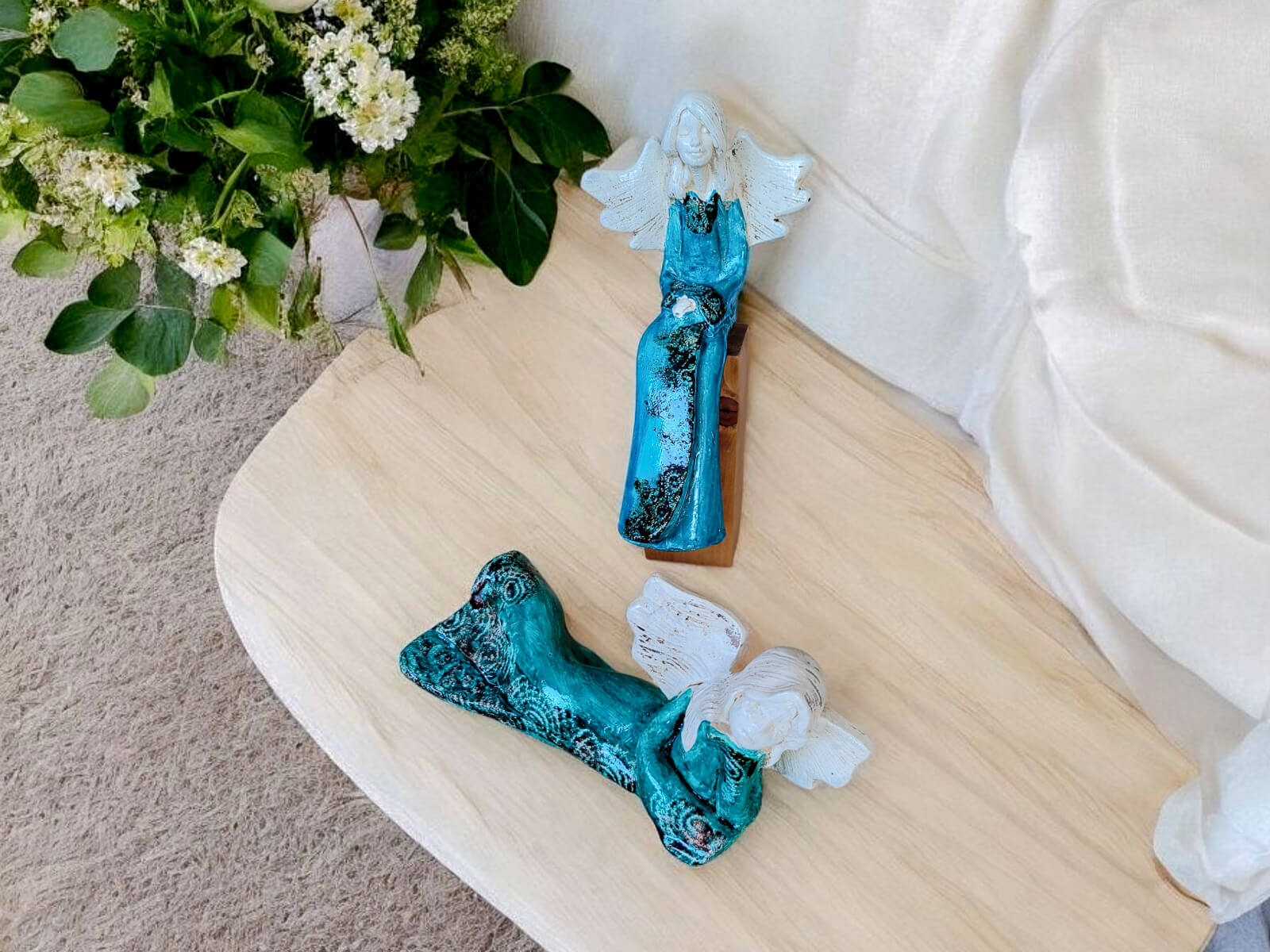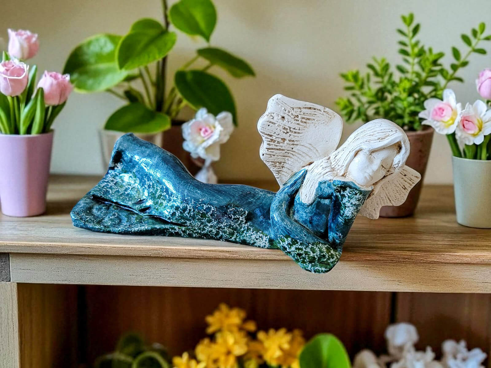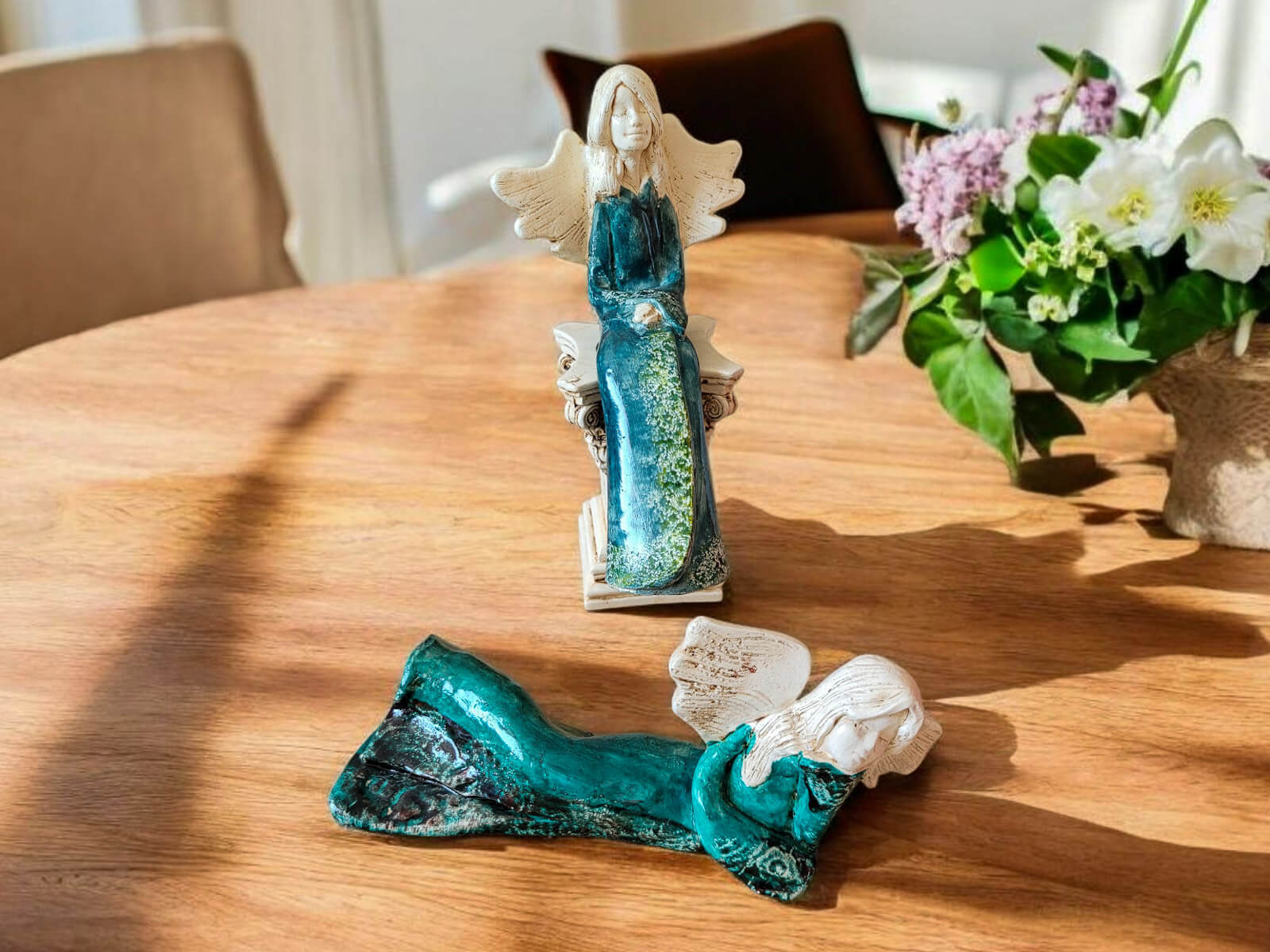 Kontrast jasnych skrzydeł i włosów z głębokim turkusem sukni wprowadza do wnętrza harmonię i subtelność. To nie tylko dekoracja – to źródło codziennej radości i wyciszenia.