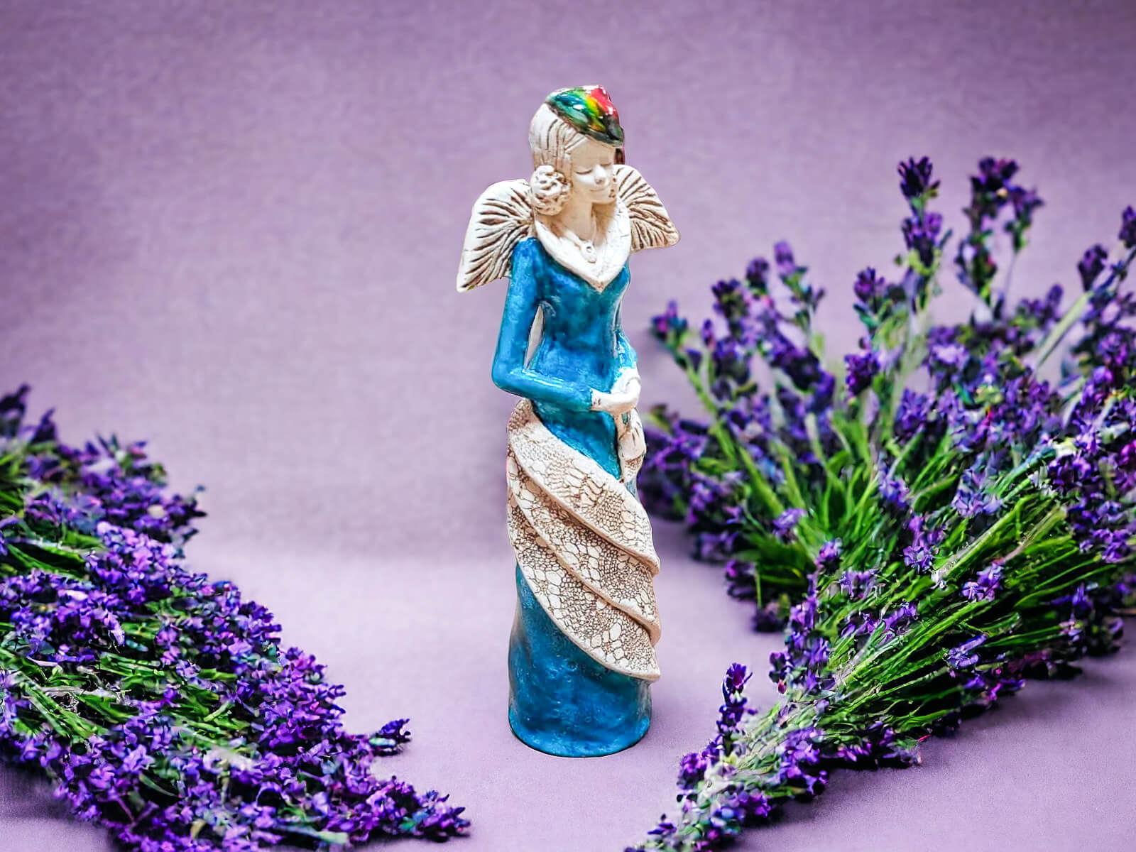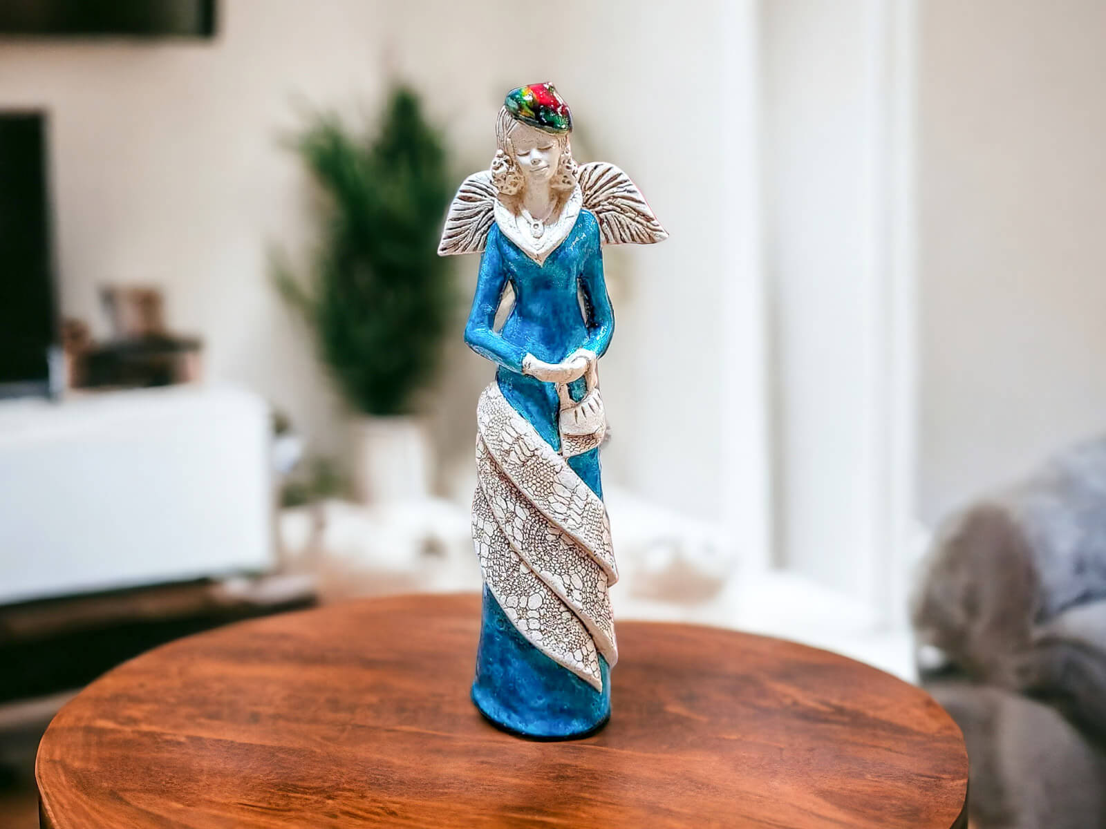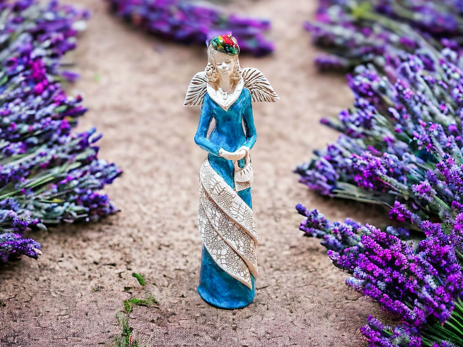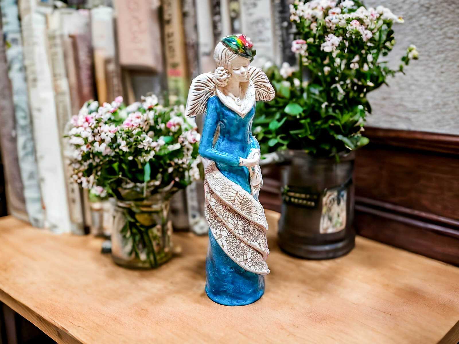 Charlotte w ciemno turkusowej sukni. Uwielbia wyjścia do teatru i do kina. Podróżuje po całym świecie i podziwia architekturę miast. Kolekcjonuje śnieżne kule z miejsc, w których już była. Pomoże uleczyć duszę. Z pewnością przypomni jak używa się skrzydeł i jak się lata. Anioł, który przyda się w każdym domu, i każdym biurze. Przywróci wiarę we własne siły, pomoże w walce o lepszy czas. Charlotte jak nikt potrafi podziękować za wszystko. Jeśli chcesz komuś podziękować podaruj mu tego Anioła.
