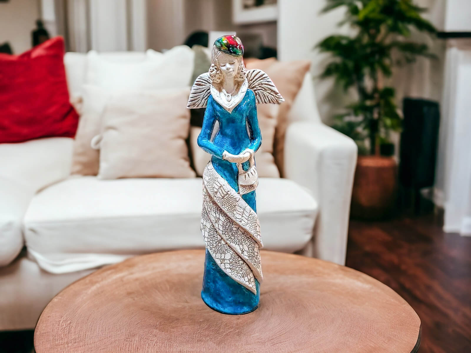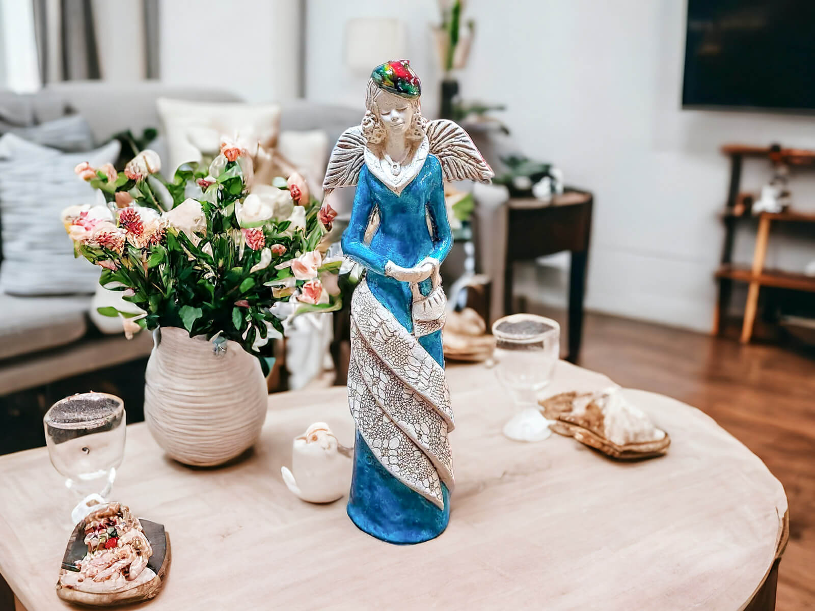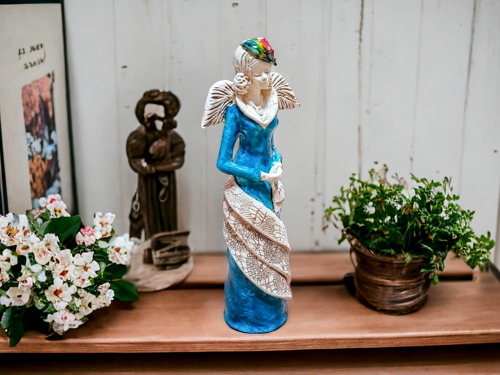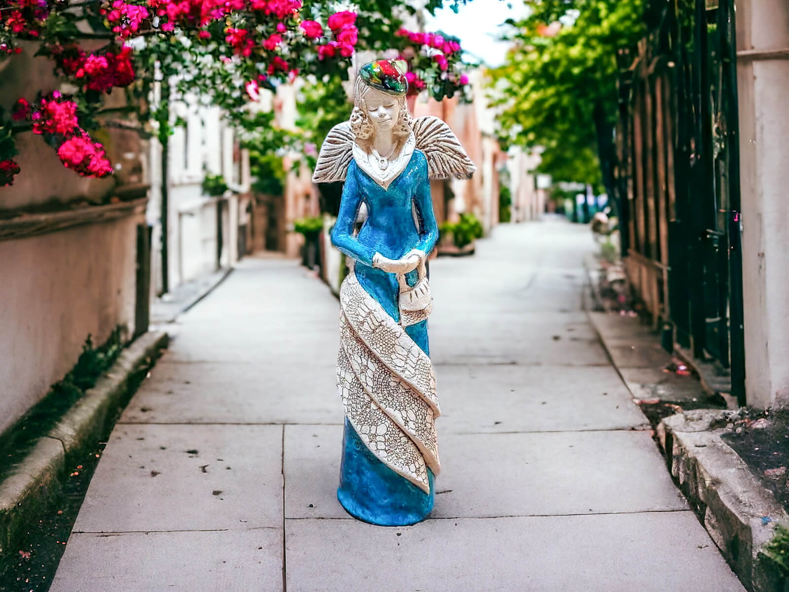 Charlotte w ciemno turkusowej sukni. Uwielbia wyjścia do teatru i do kina. Podróżuje po całym świecie i podziwia architekturę miast. Kolekcjonuje śnieżne kule z miejsc, w których już była. Pomoże uleczyć duszę. Z pewnością przypomni jak używa się skrzydeł i jak się lata. Anioł, który przyda się w każdym domu, i każdym biurze. Przywróci wiarę we własne siły, pomoże w walce o lepszy czas. Charlotte jak nikt potrafi podziękować za wszystko. Jeśli chcesz komuś podziękować podaruj mu tego Anioła.