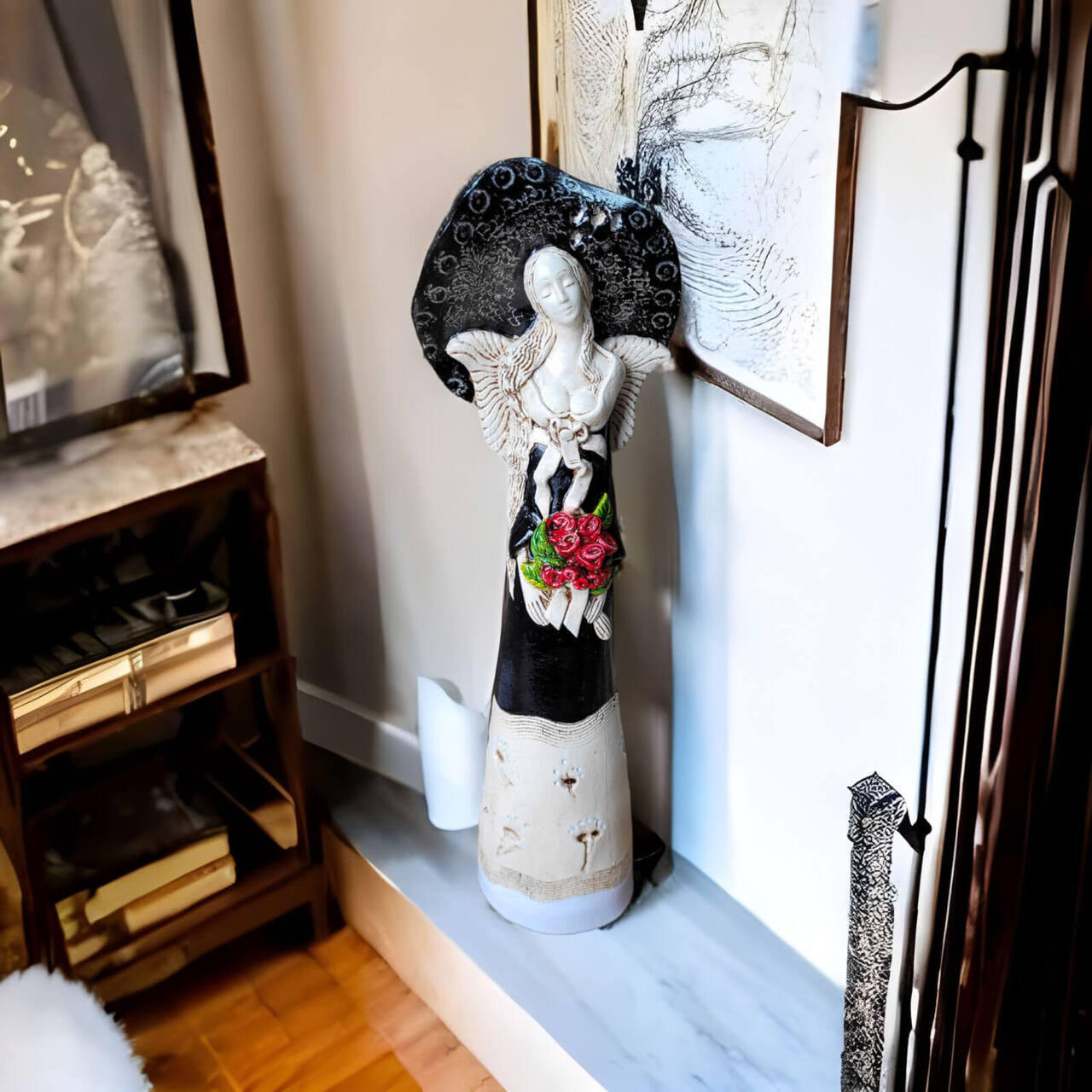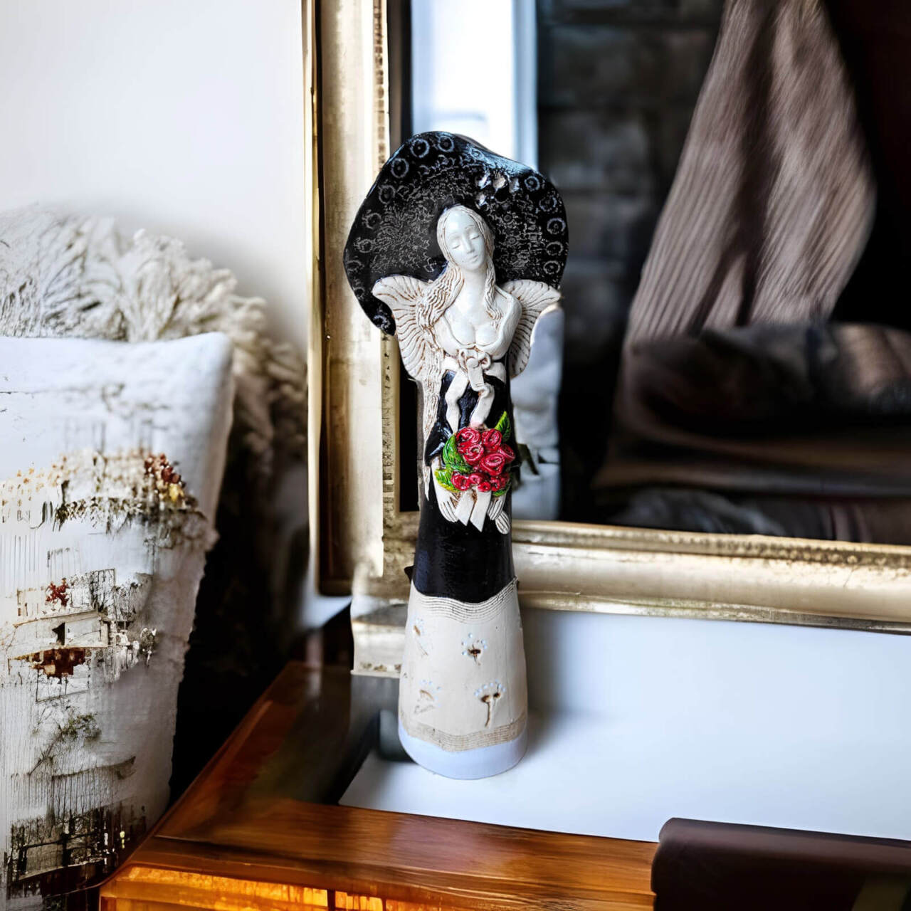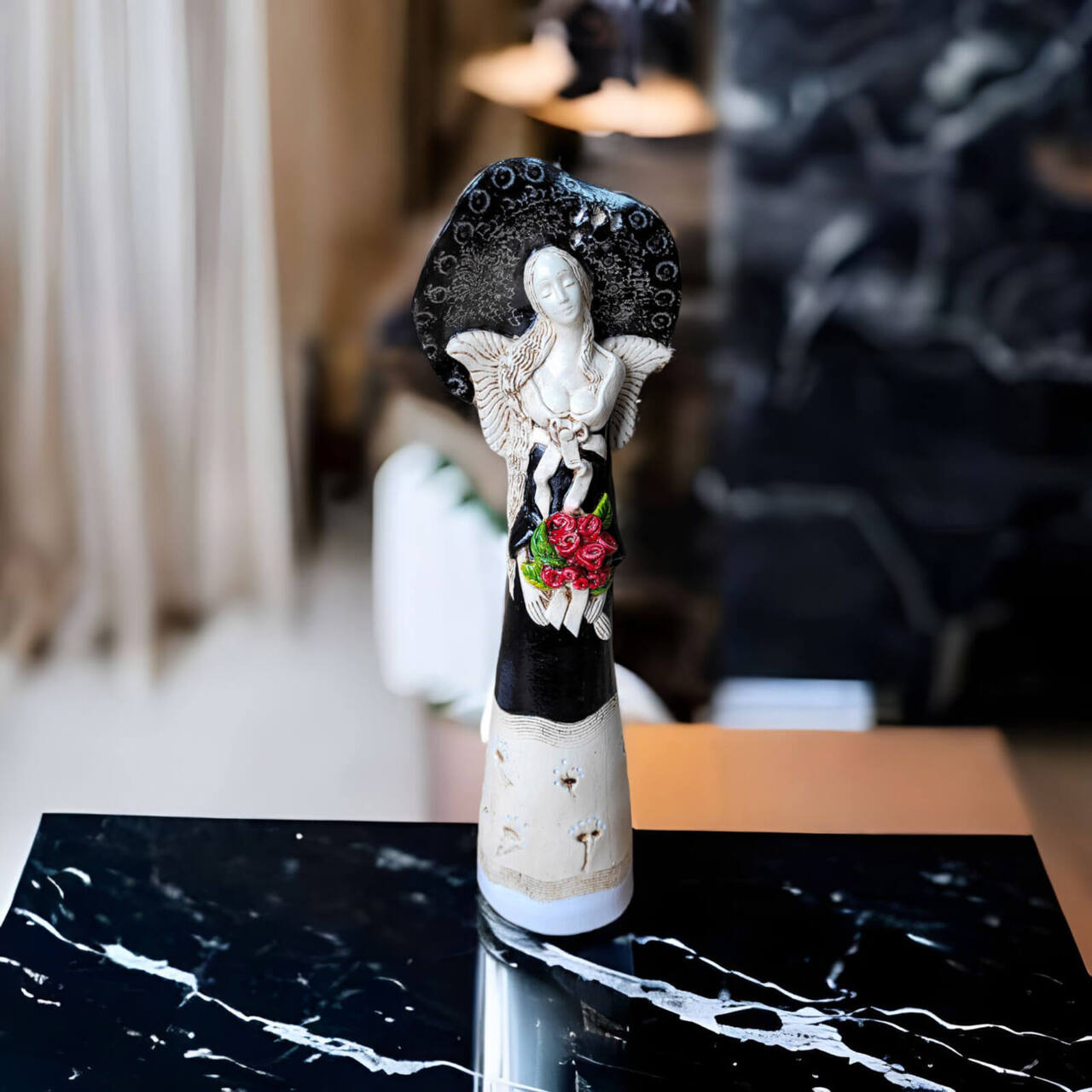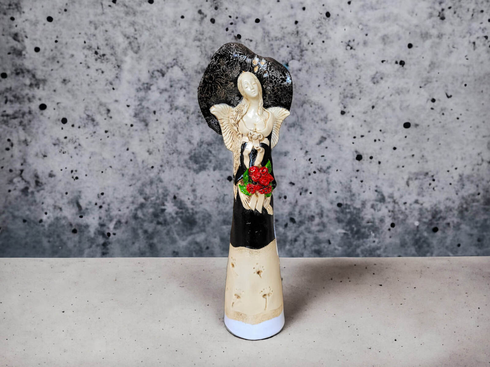 Mabel w czarnej sukni to anioł o wyeksponowanych kobiecych kształtach. Cechą szczególną tej niezwykłej figurki jest rozłożysty kapelusz, podkreślający piękno Anioła. Trzymany w rękach bukiet kwiatów dodaje jeszcze więcej uroku. Figurka idealnie sprawdzi się jako uniwersalny prezent na różne okazje - urodziny, imieniny, Dzień Matki czy prezent pod choinkę na Święta i pięknie wkomponuje się w tradycyjne i nowoczesne wnętrza.