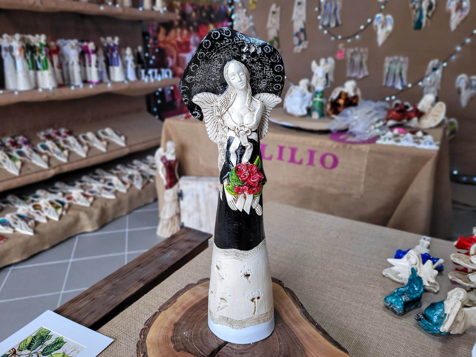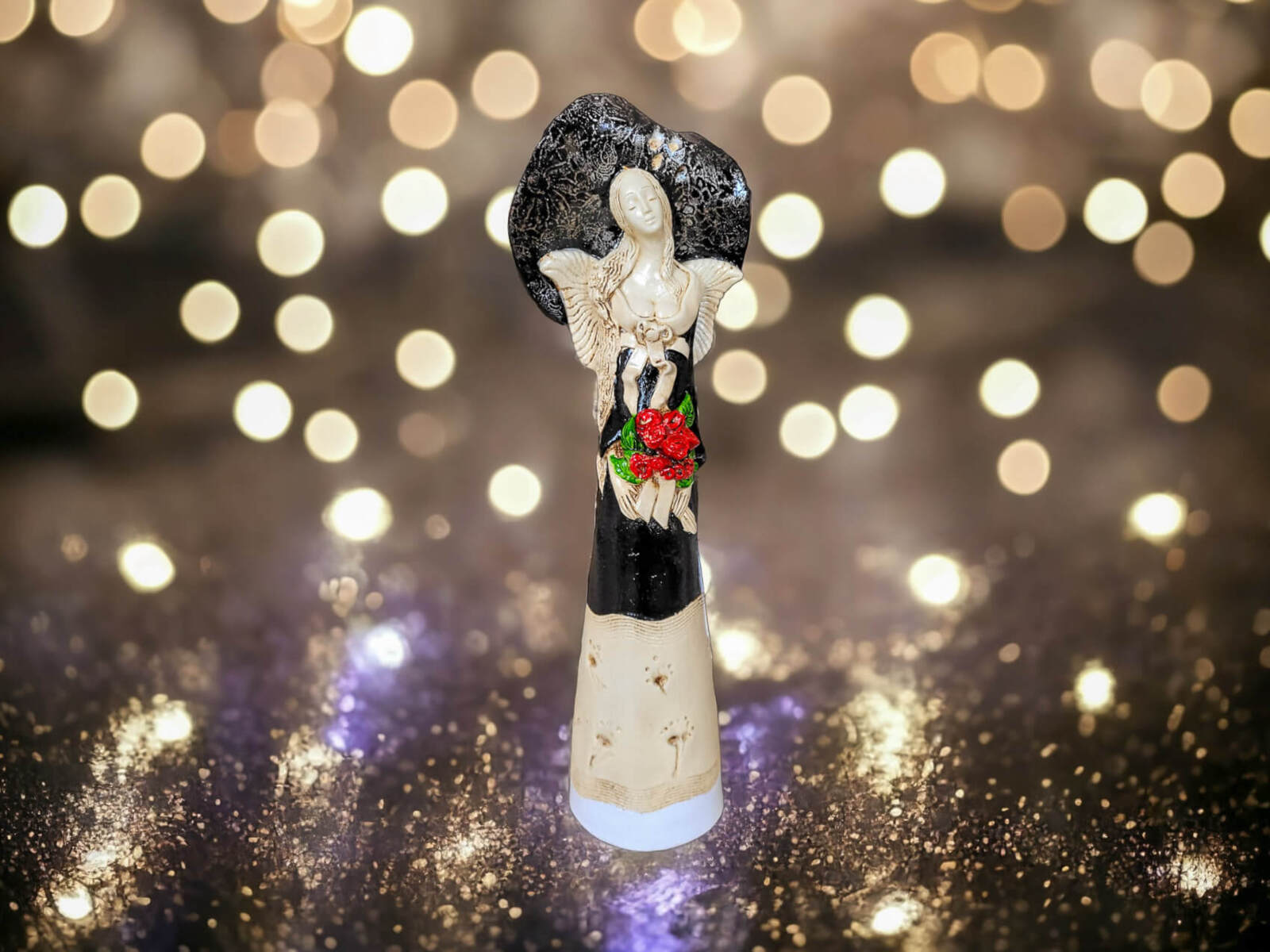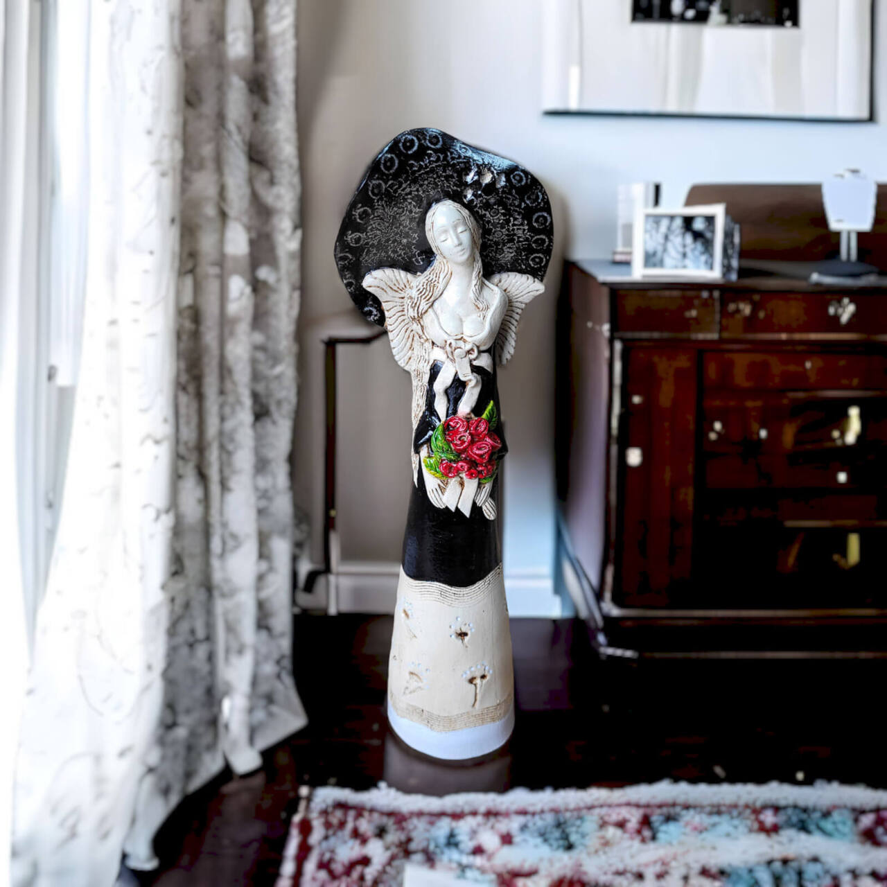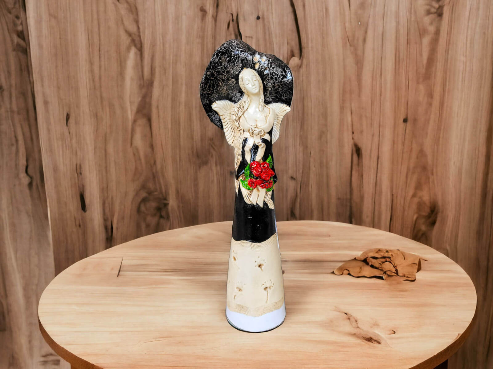 Mabel w czarnej sukni to anioł o wyeksponowanych kobiecych kształtach. Cechą szczególną tej niezwykłej figurki jest rozłożysty kapelusz, podkreślający piękno Anioła. Trzymany w rękach bukiet kwiatów dodaje jeszcze więcej uroku. Figurka idealnie sprawdzi się jako uniwersalny prezent na różne okazje - urodziny, imieniny, Dzień Matki czy prezent pod choinkę na Święta i pięknie wkomponuje się w tradycyjne i nowoczesne wnętrza.