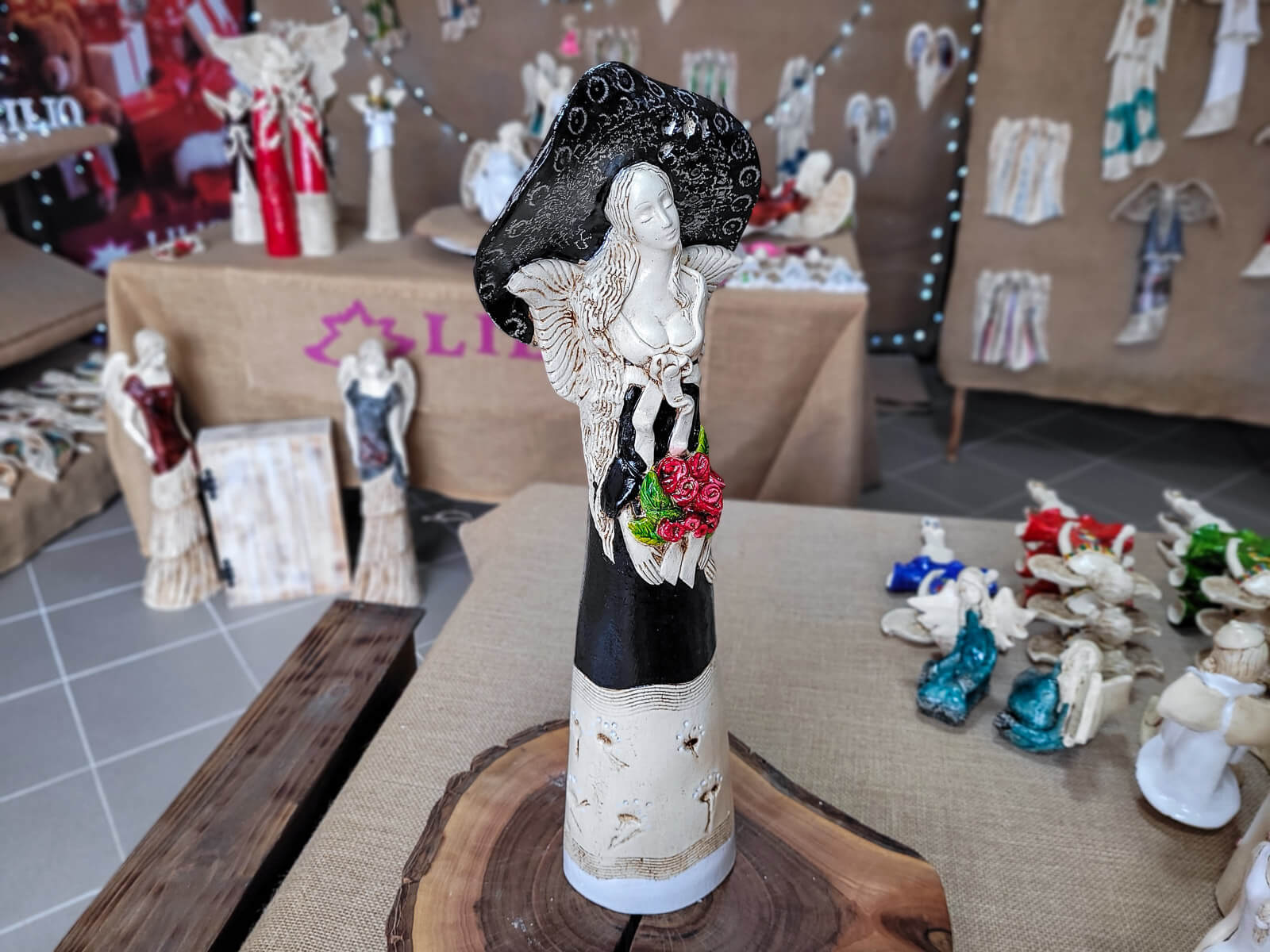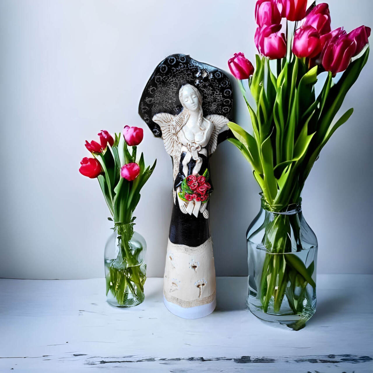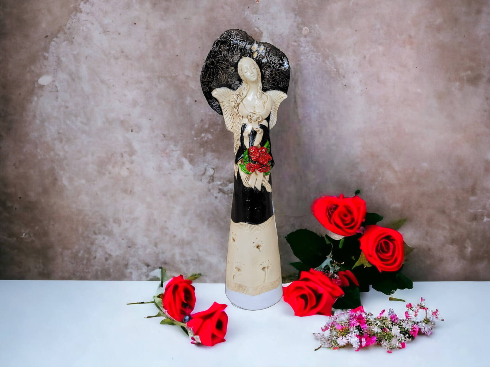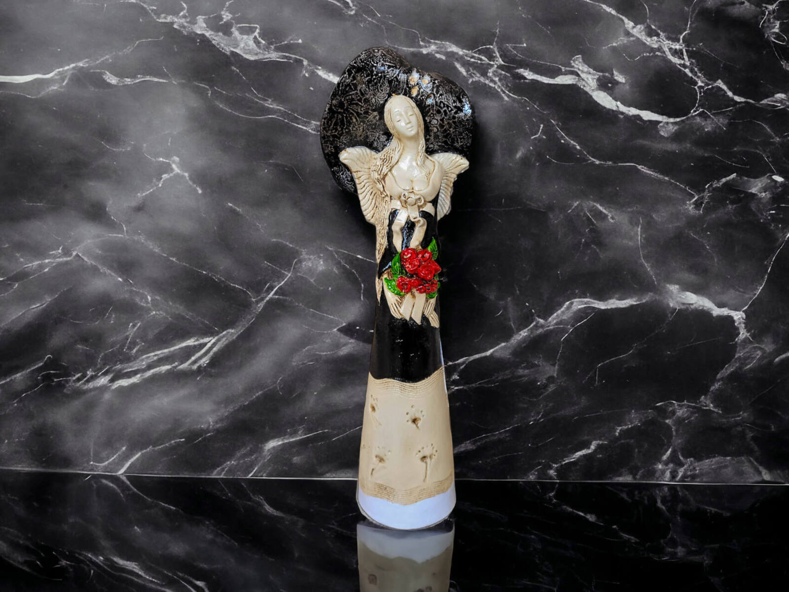 Mabel w czarnej sukni to anioł o wyeksponowanych kobiecych kształtach. Cechą szczególną tej niezwykłej figurki jest rozłożysty kapelusz, podkreślający piękno Anioła. Trzymany w rękach bukiet kwiatów dodaje jeszcze więcej uroku. Figurka idealnie sprawdzi się jako uniwersalny prezent na różne okazje - urodziny, imieniny, Dzień Matki czy prezent pod choinkę na Święta i pięknie wkomponuje się w tradycyjne i nowoczesne wnętrza.