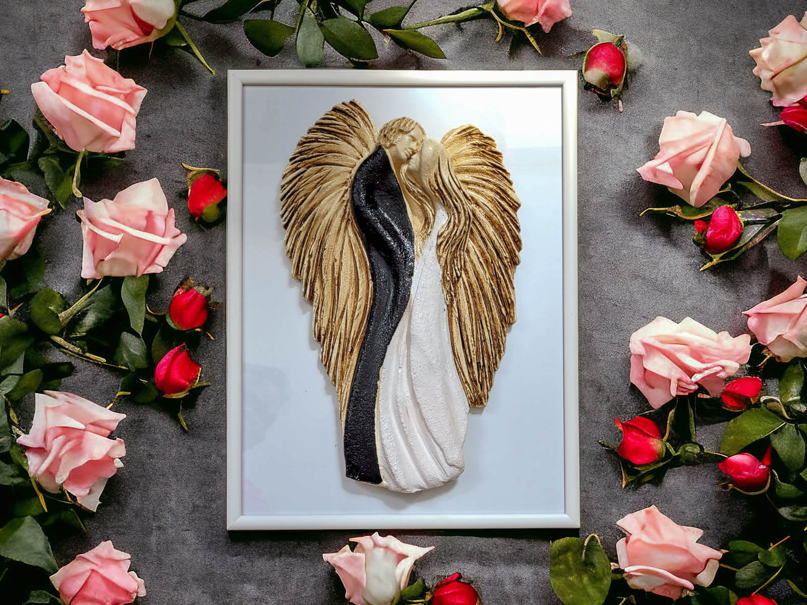 Anioły, wykonane z gipsu, zostały ręcznie pomalowane, co nadaje im wyjątkowy unikatowy charakter. Symbolika yin and yang, gdzie biały anioł i czarny anioł splatają się w harmonijną całość, stanowi doskonałe przesłanie dla zakochanych par, podkreślając równowagę i jedność w związku.