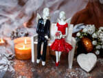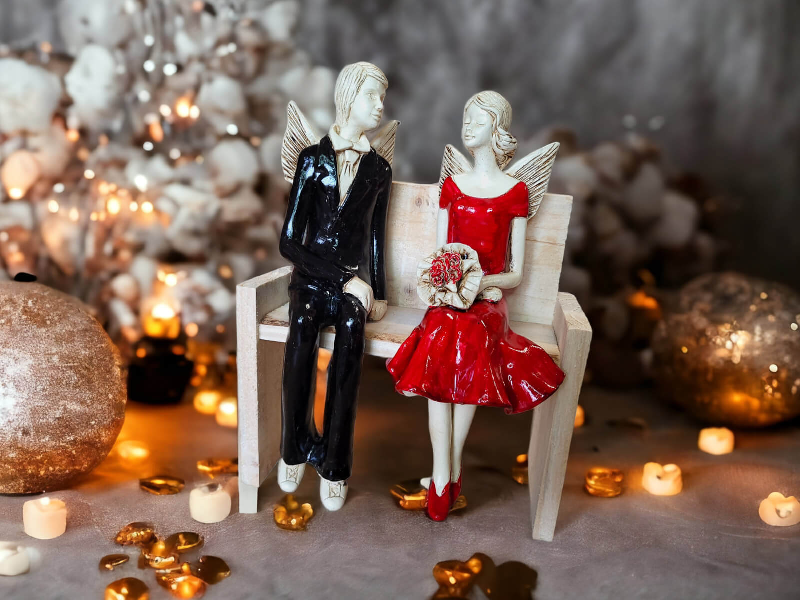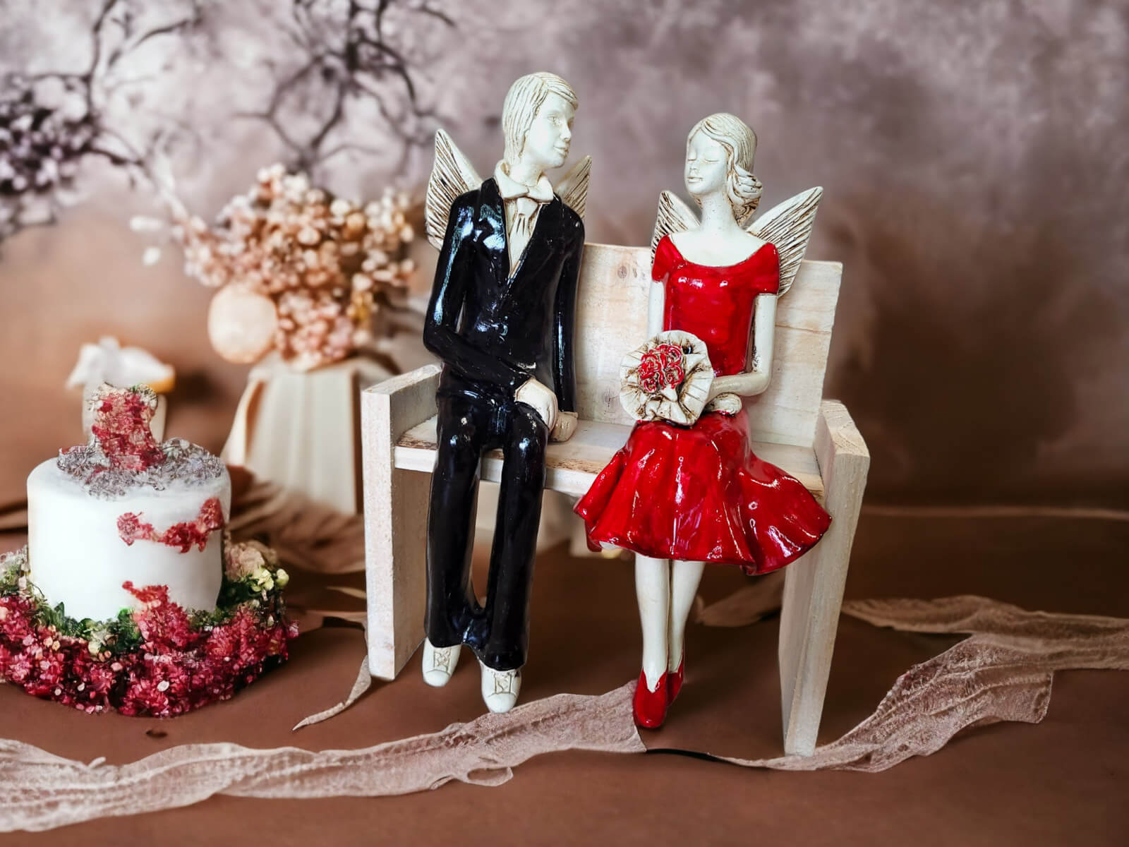 Anioły Młoda Para to ręcznie wykonane figurki. Czekają na ceremonię ślubną. Pan Młody ubrany jest w czarny, elegancki garnitur. Panna Młoda ma na sobie krótką, białą sukienkę. W ręku trzyma bukiet z róż. Anioły są świetny pomysłem na prezent ślubny lub dekorację ślubną. Pięknie mogą ozdobić stół na przyjęciu weselnym.