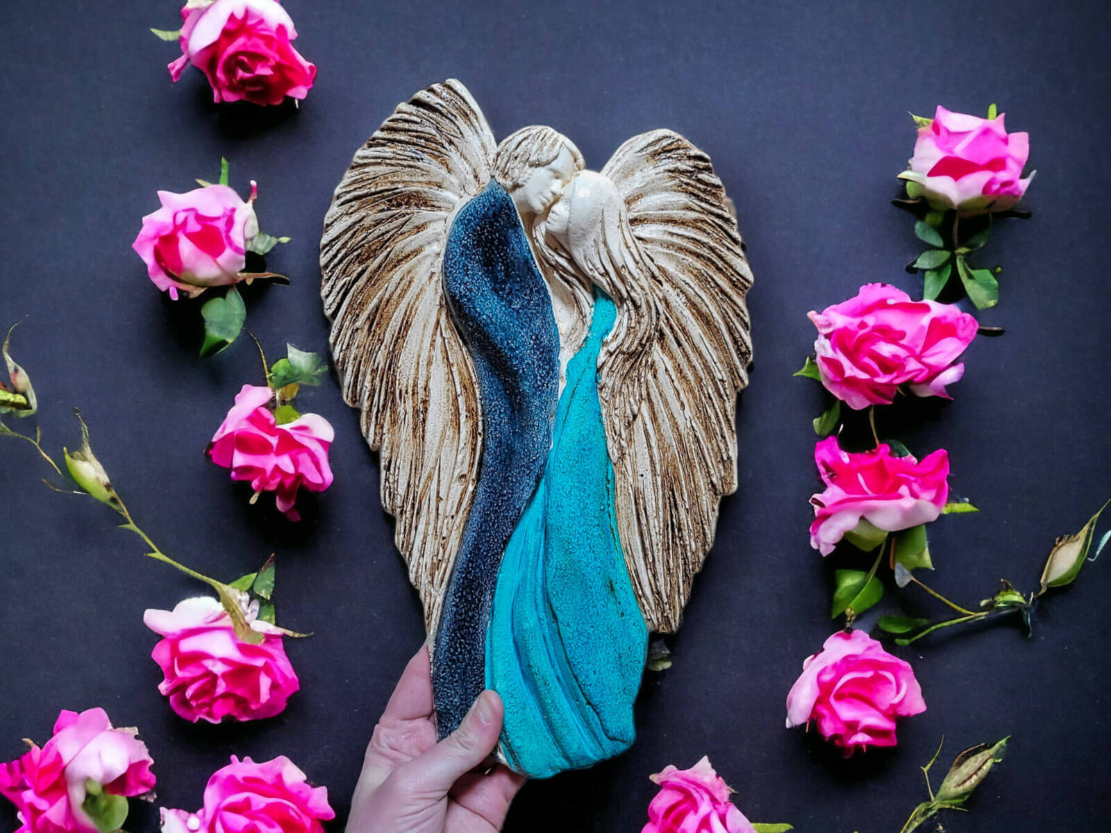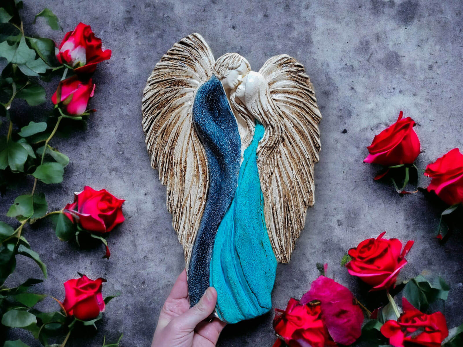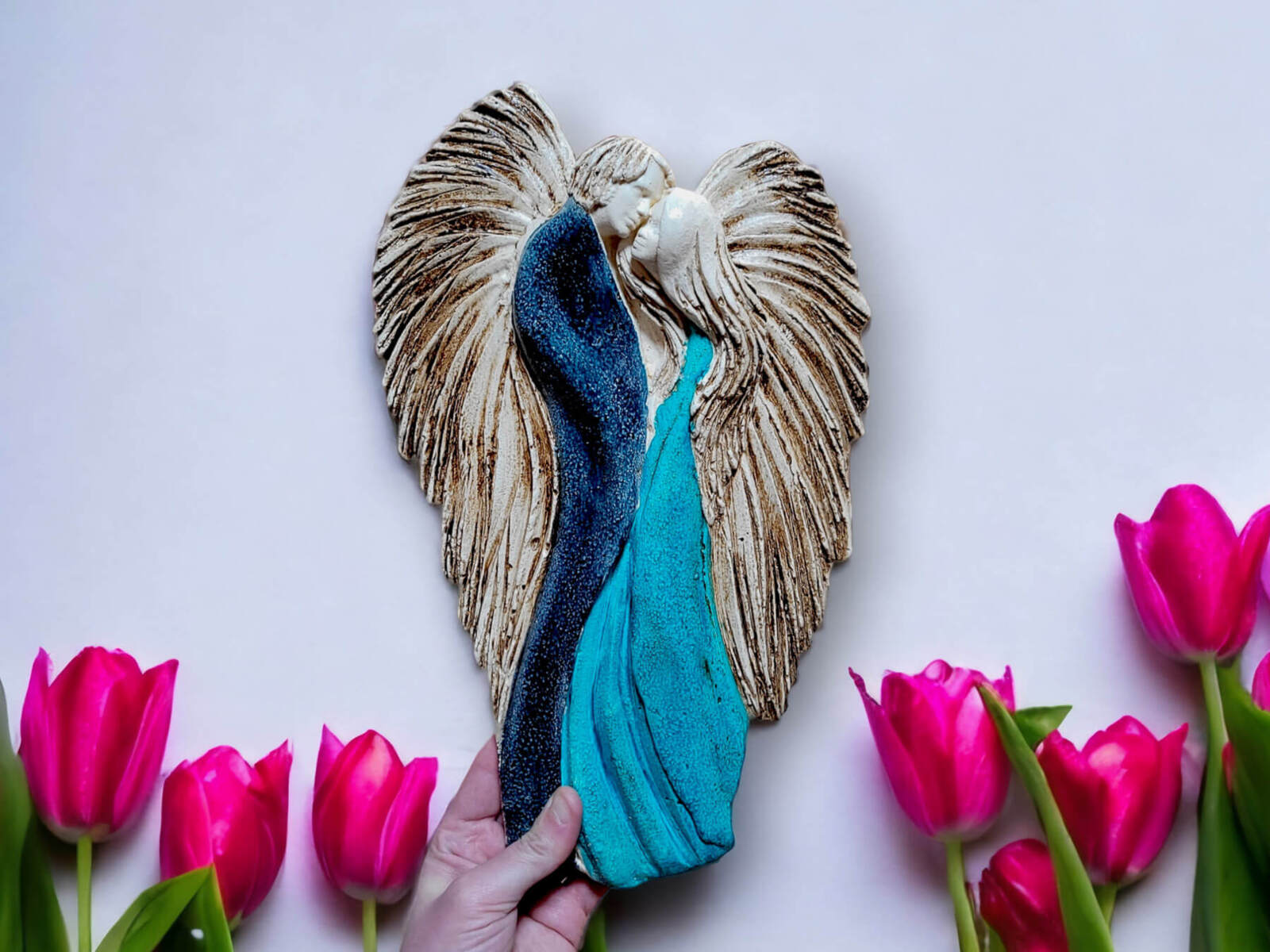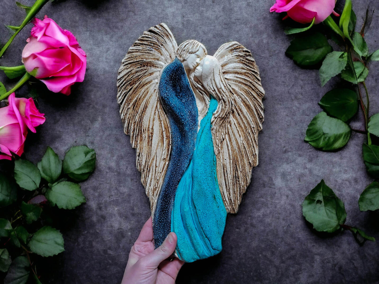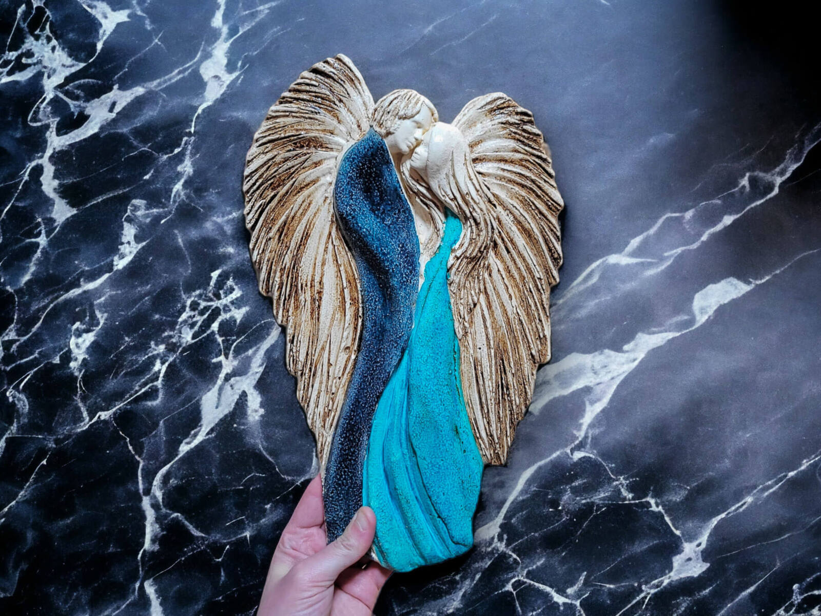 Ręcznie robione i malowane figurki zakochanych aniołów w wersji granatowo turkusowej. Anioły symbolizują wielką miłość, splecione w miłosnym uścisku. Figurka nawiązuje do symbolu energetycznej harmonii - Yin Yang. Idealna na prezent na ślub lub rocznicę ślubu, dla kochającej pary. Pięknie prezentuje się na ścianie w salonie czy sypialni. Klienci twierdzą, że w rzeczywistości wygląda lepiej niż na zdjęciach. Tutaj przeczytasz więcej o harmonii Yin Yang.