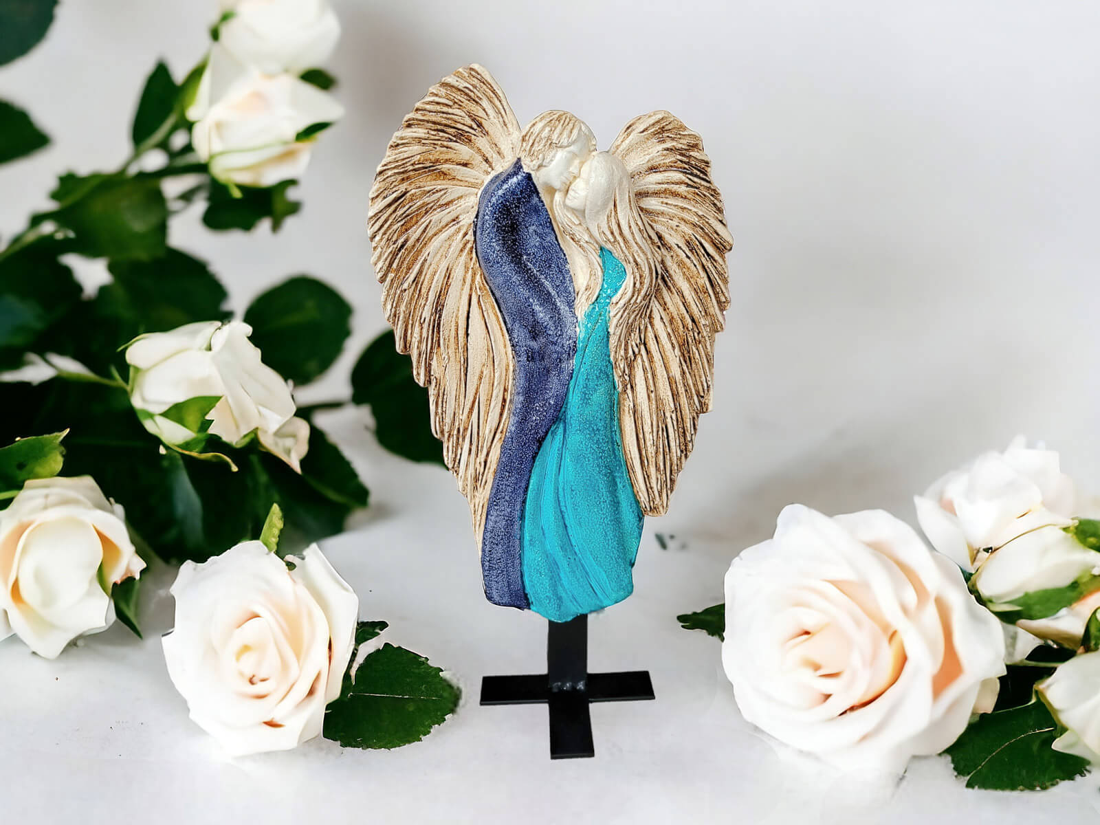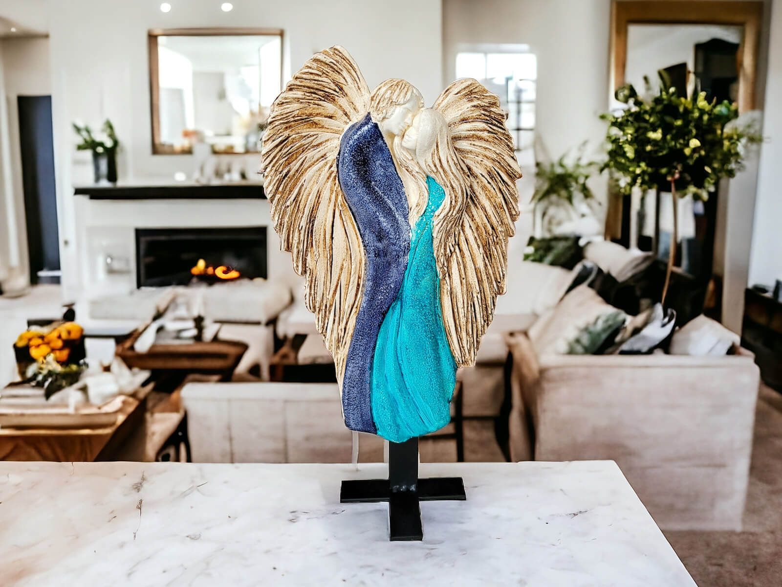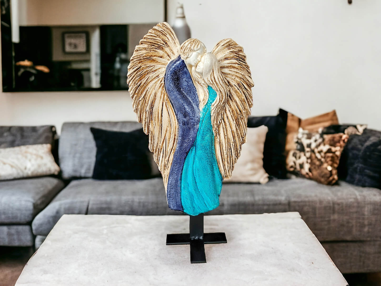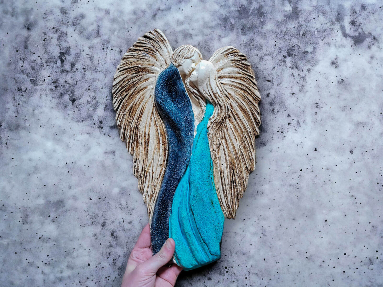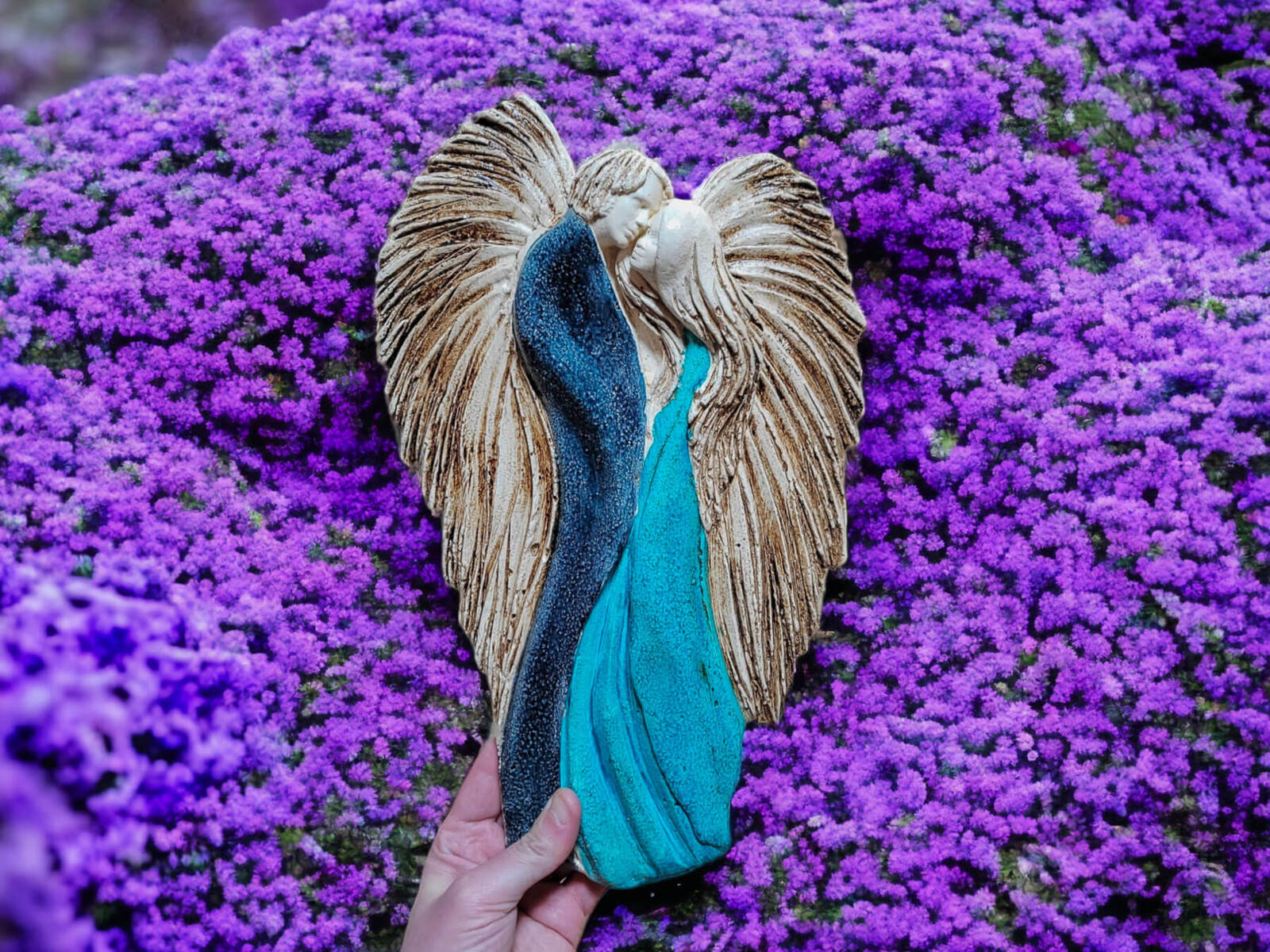 Ręcznie robione i malowane figurki zakochanych aniołów w wersji granatowo turkusowej. Anioły symbolizują wielką miłość, splecione w miłosnym uścisku. Figurka nawiązuje do symbolu energetycznej harmonii - Yin Yang. Idealna na prezent na ślub lub rocznicę ślubu, dla kochającej pary. Pięknie prezentuje się na ścianie w salonie czy sypialni. Klienci twierdzą, że w rzeczywistości wygląda lepiej niż na zdjęciach. Tutaj przeczytasz więcej o harmonii Yin Yang.