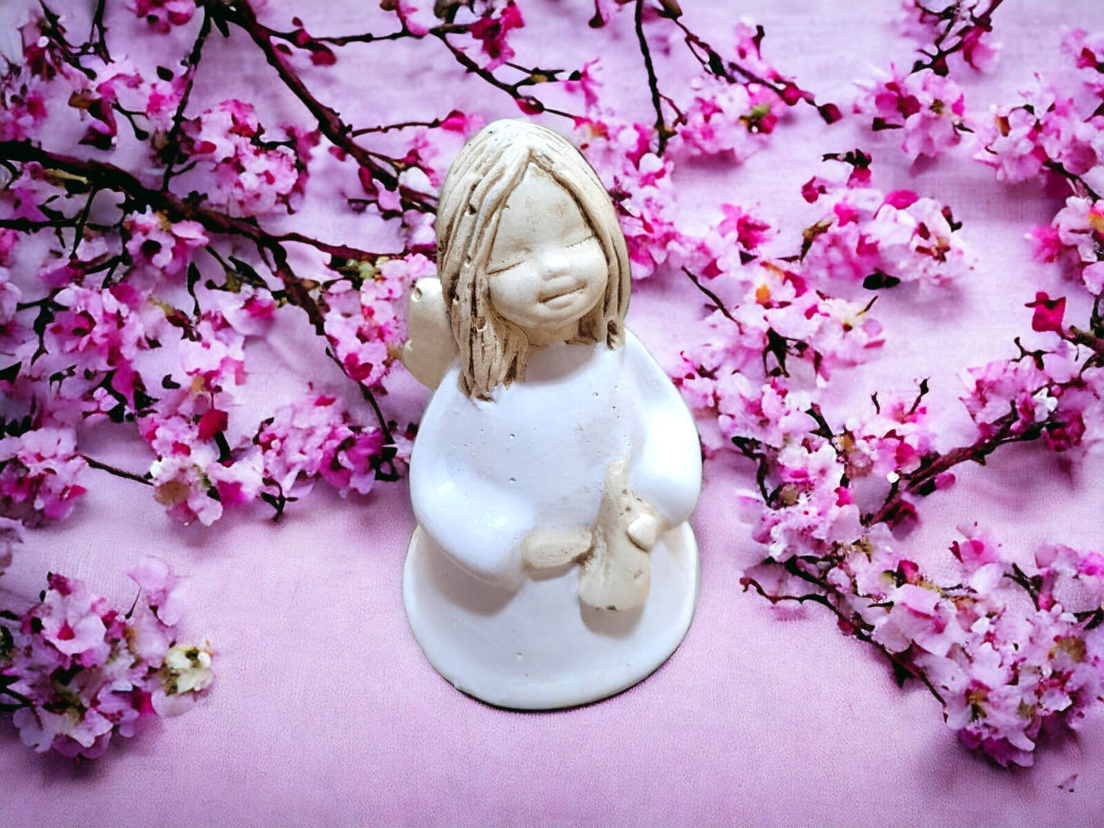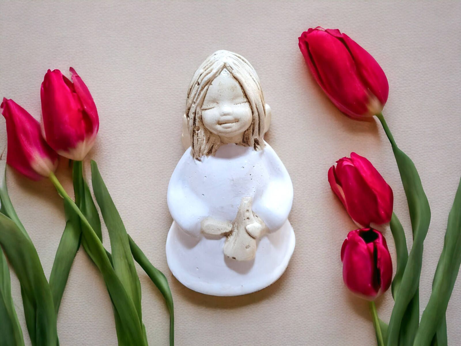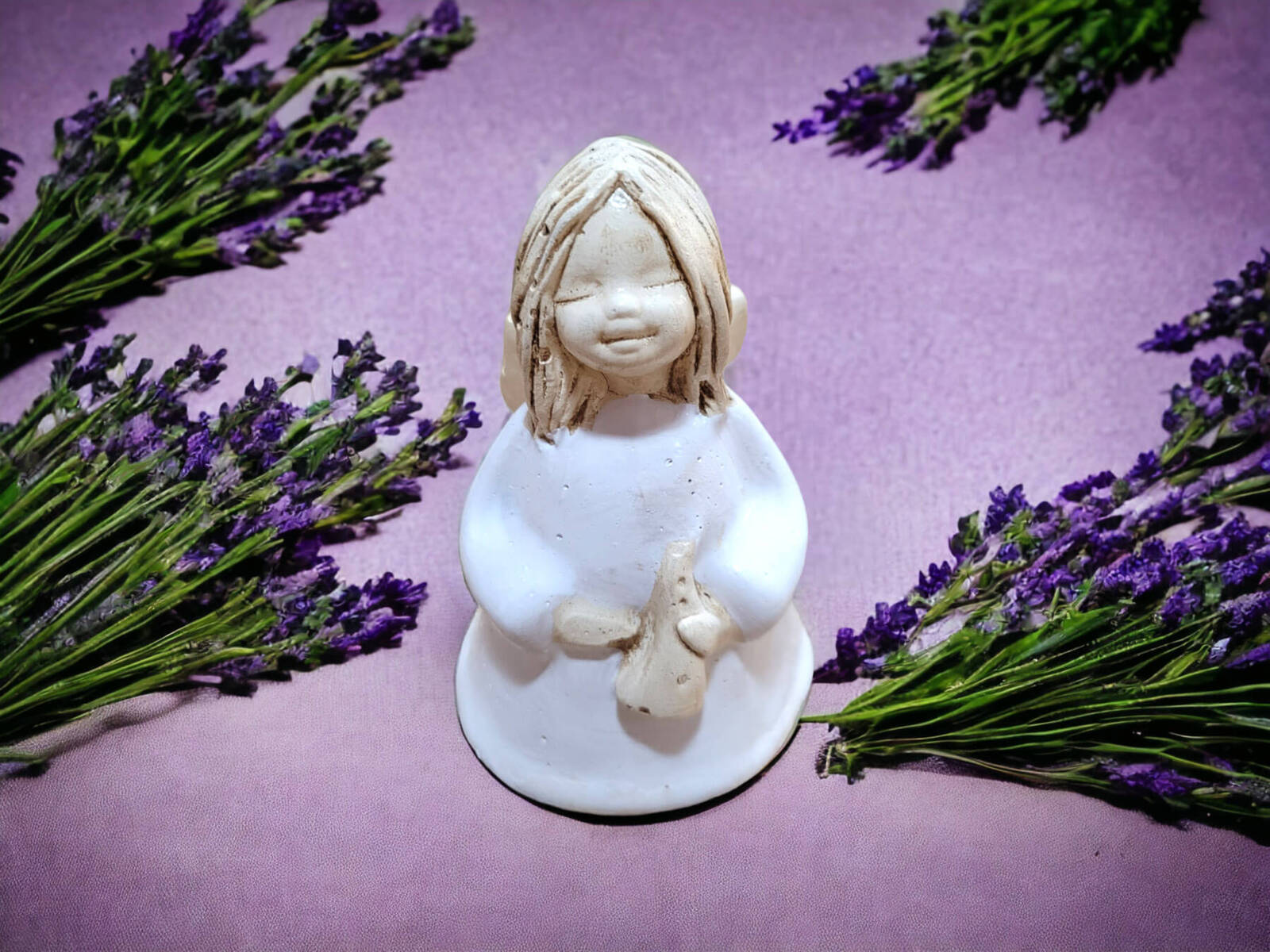Anioł Mary Li to ręcznie wykonana figurka. Dziewczynka jest artystką. Jej największą miłością jest muzyka. Anieliczka jest zatracona w komponowaniu swojej muzyki. Swoją twórczością chce podzielić się z całym światem. W ręku trzyma lirę. Jest ubrana w długą, białą sukienkę, która jest symbolem czystości. Figurka idealnie nadaję na na prezent dla dziewczynek. Może być świetną dekoracją stołu komunijnego. Przyozdobi każde domowe wnętrze.