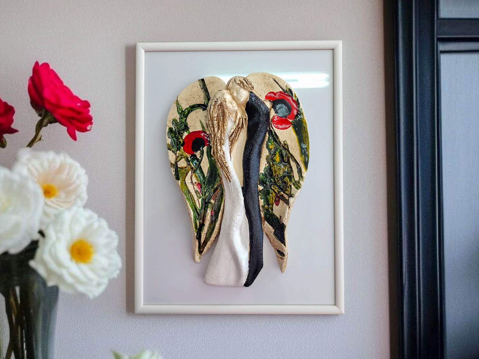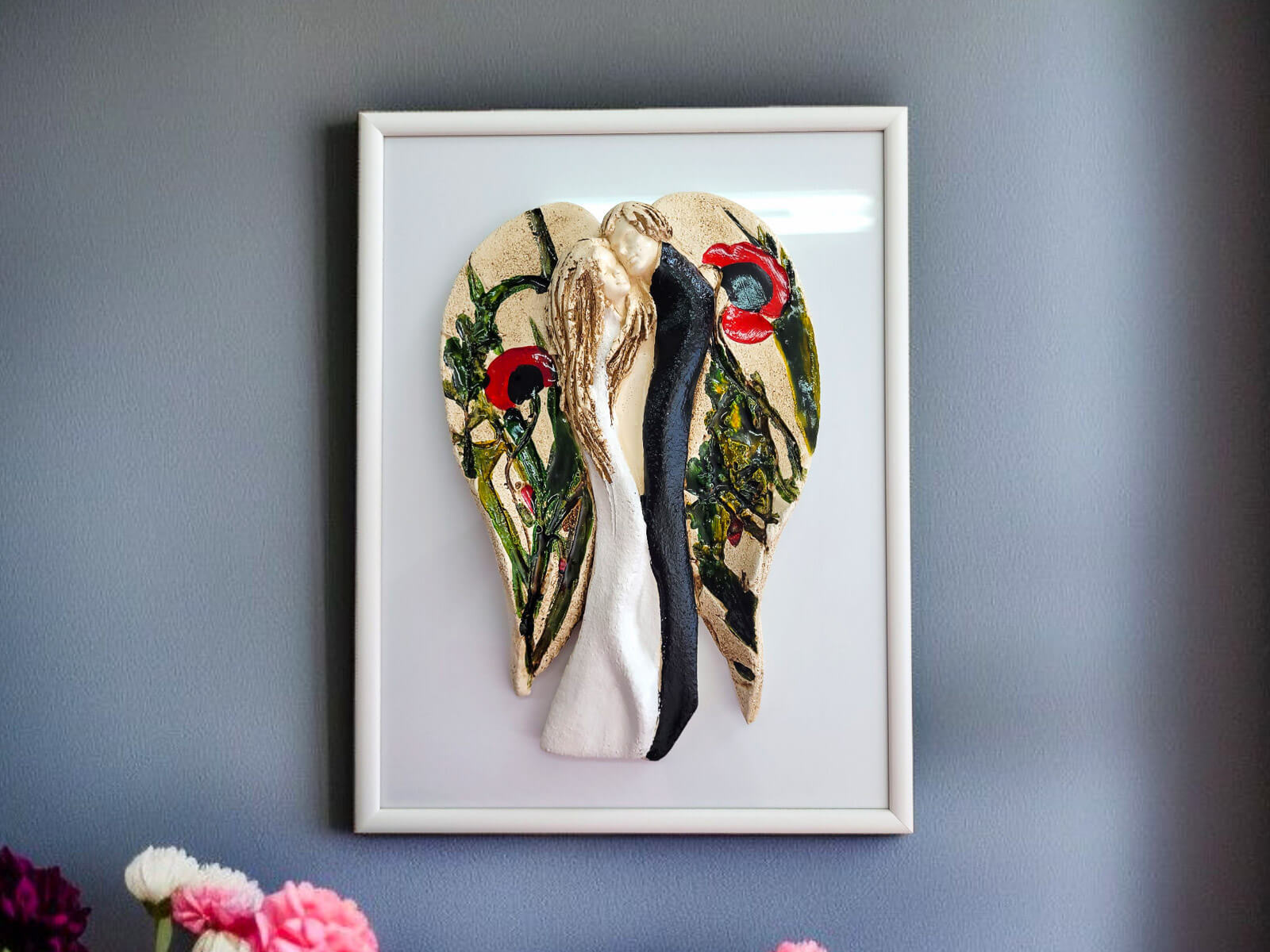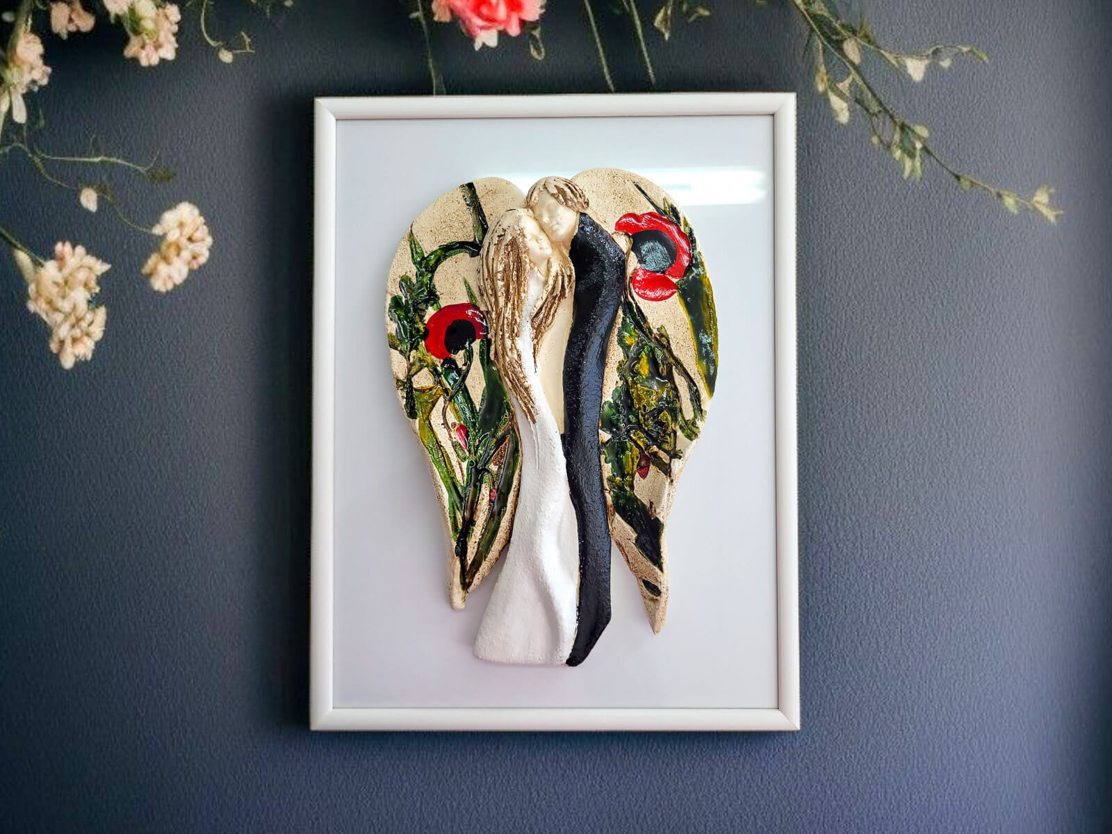 Ręcznie robione i malowane figurka Kochających Aniołów w wersji czarno białej z kolorowymi makami w komplecie z elegancką ramką. Idealne na prezent na ślub lub rocznicę ślubu. Anioły symbolizują wielką miłość, splecione w miłosnym uścisku. Figurka nawiązuje do symbolu energetycznej harmonii - Yin Yang. Idealna na prezent na ślub lub rocznicę ślubu, dla kochającej pary. Pięknie prezentuje się na ścianie w salonie czy sypialni. Klienci twierdzą, że w rzeczywistości wygląda lepiej niż na zdjęciach. Tutaj przeczytasz więcej o harmonii Yin Yang.