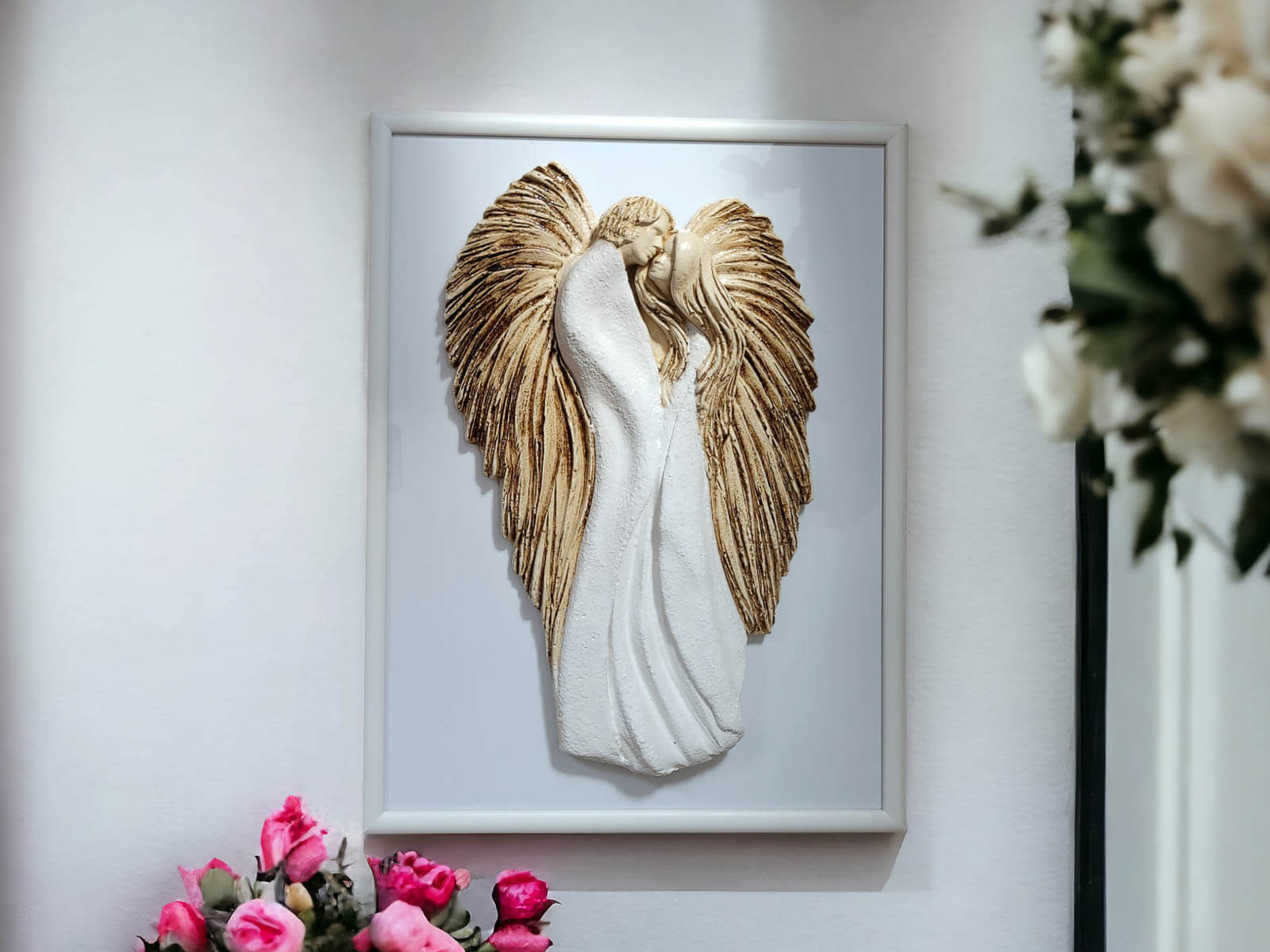 Anioły wykonane zostały z gipsu, a ich ręczne malowanie nadaje im wyjątkowy charakter. Umieszczone na szybie eleganckiej drewnianej ramki sprawia, że uzyskują efekt trójwymiarowości, co dodaje im jeszcze większego uroku.