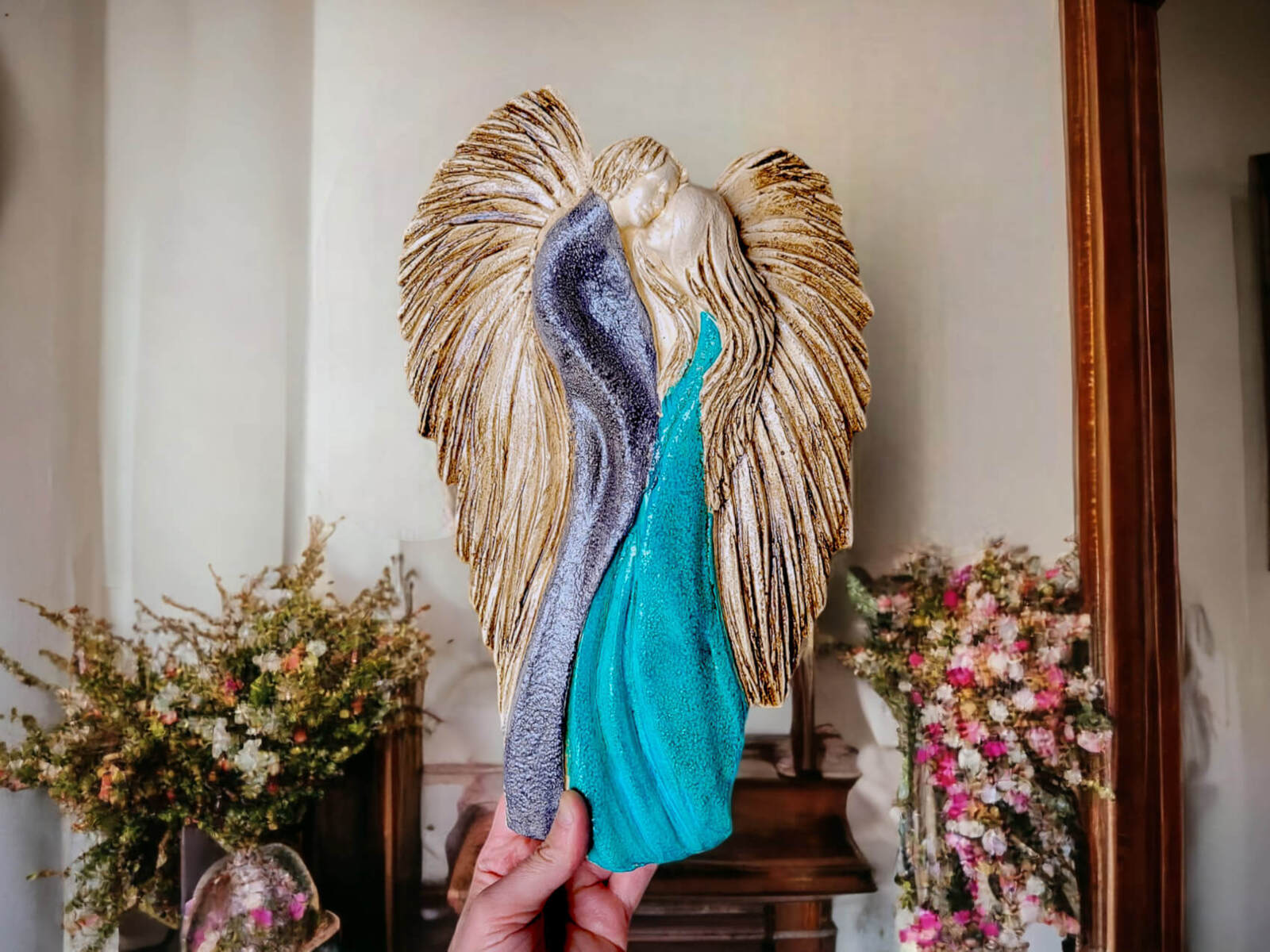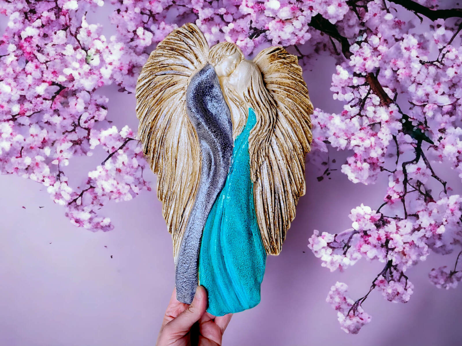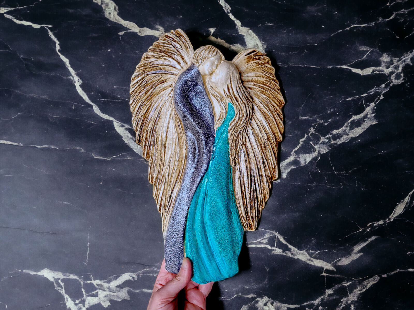 Ręcznie robione i malowane figurki zakochanych aniołów w wersji szaro (ciemniejszy srebrny) turkusowej. Anioły symbolizują wielką miłość, splecione w miłosnym uścisku. Figurka nawiązuje do symbolu energetycznej harmonii - Yin Yang. Idealna na prezent na ślub lub rocznicę ślubu, dla kochającej pary. Pięknie prezentuje się na ścianie w salonie czy sypialni. Klienci twierdzą, że w rzeczywistości wygląda lepiej niż na zdjęciach. Tutaj przeczytasz więcej o harmonii Yin Yang.