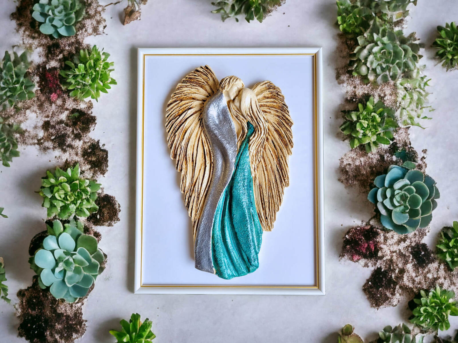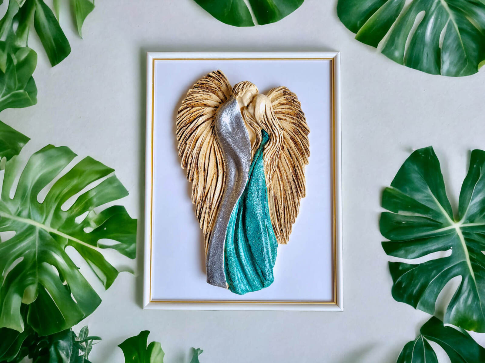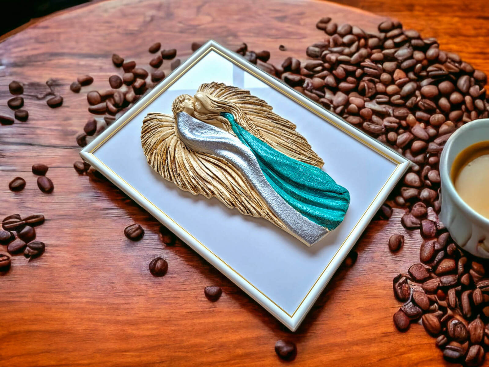 Figurka Zakochane Anioły w eleganckiej drewnianej ramce to ręcznie robiona figurka która przenosi nas do świata równowagi i harmonii, nawiązując do koncepcji Yin i Yang. Te delikatne anioły w kolorze srebrnym i turkusowym, umieszczone na eleganckiej drewnianej ramce, tworzą piękny kontrast i emanują subtelnością.