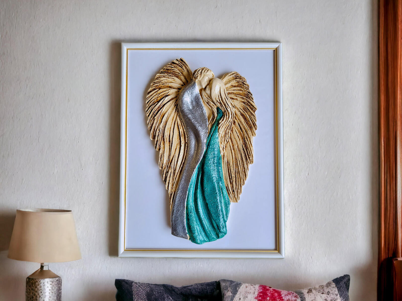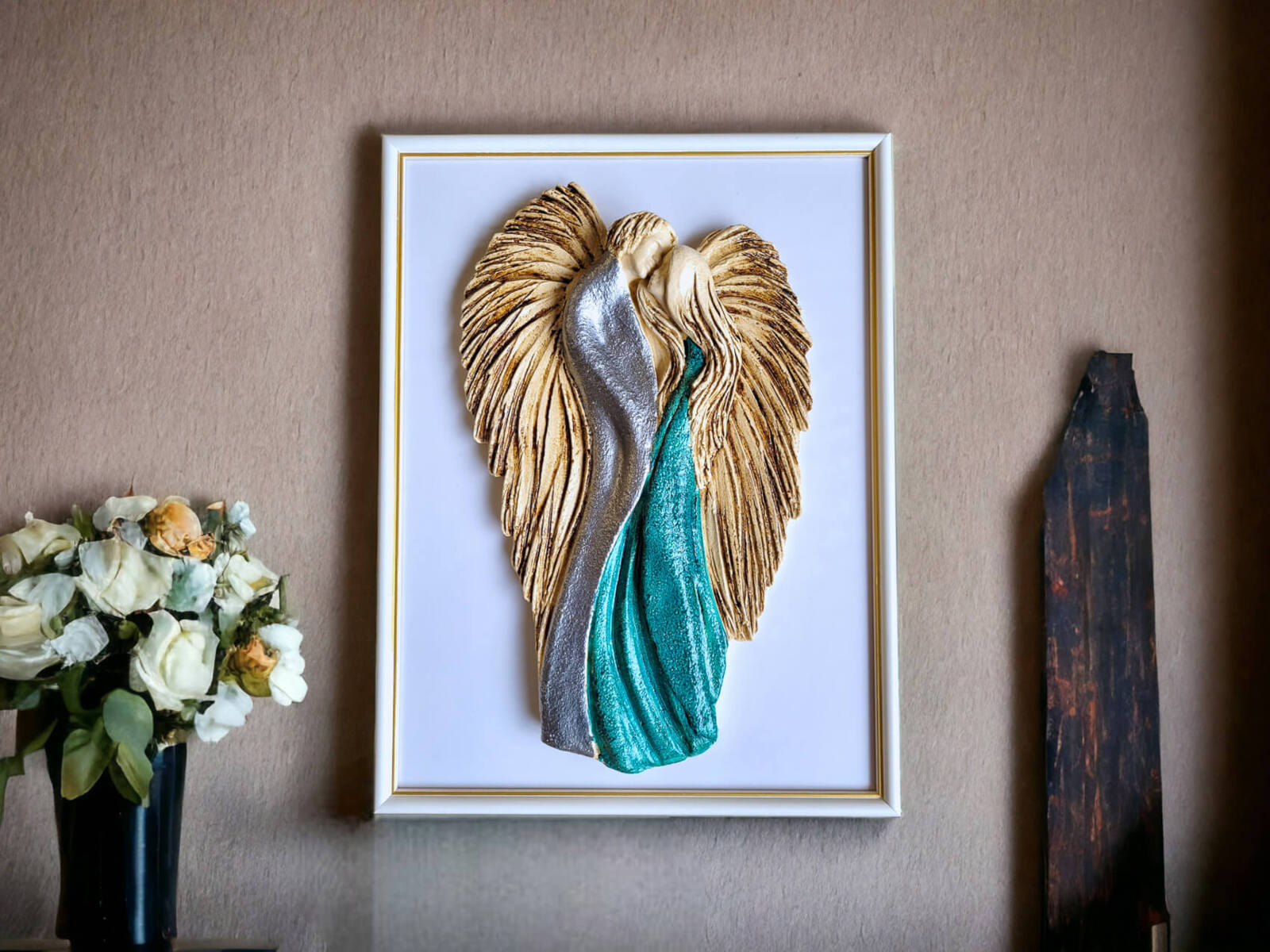 Anioły wykonane zostały z gipsu, a ich ręczne malowanie nadaje im wyjątkowy charakter. Umieszczone na szybie eleganckiej drewnianej ramki sprawia, że uzyskują efekt trójwymiarowości, co dodaje im jeszcze większego uroku.