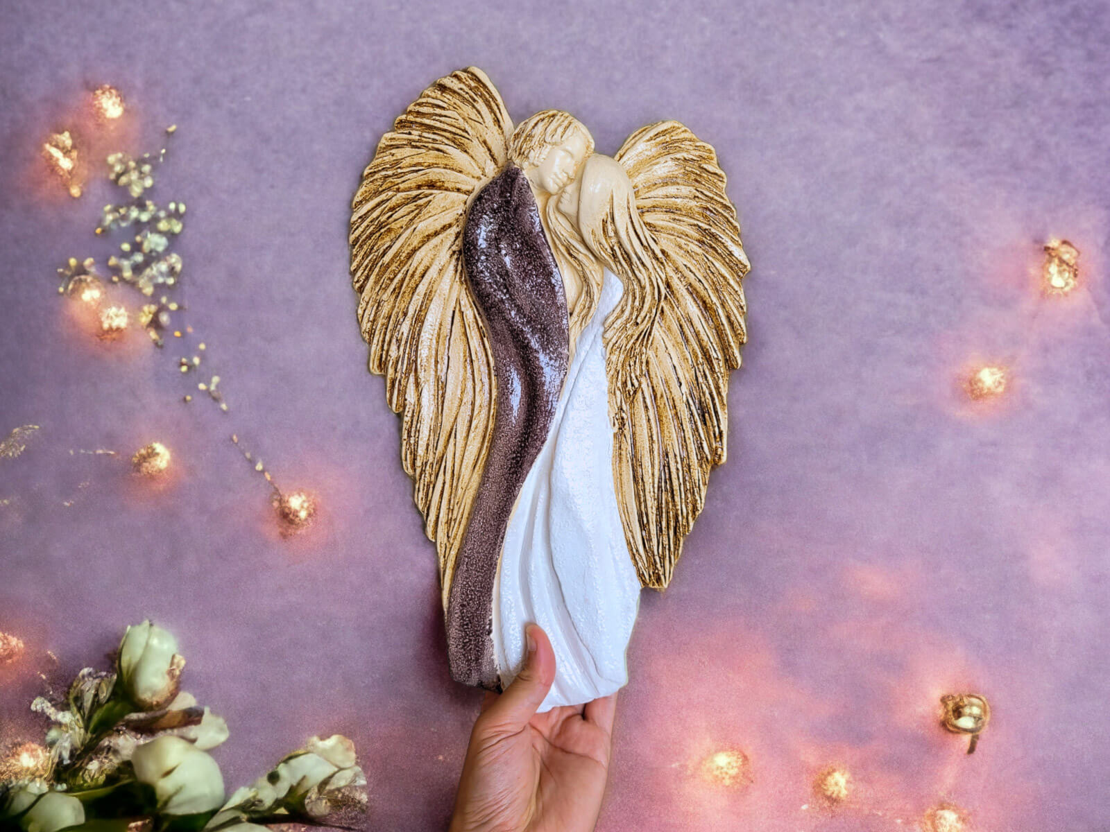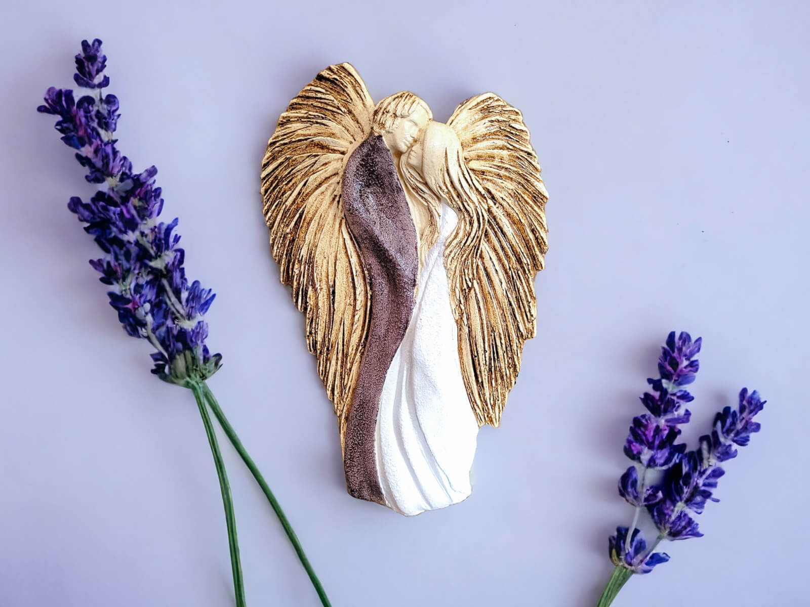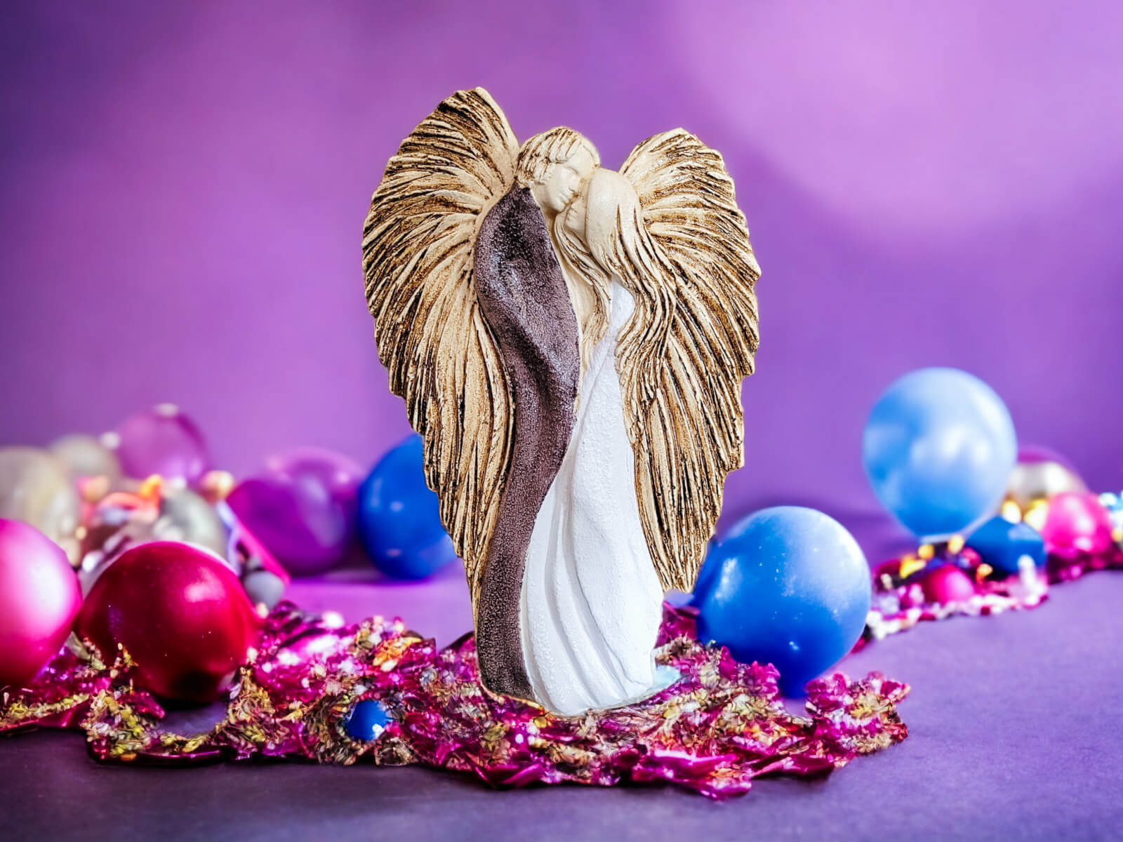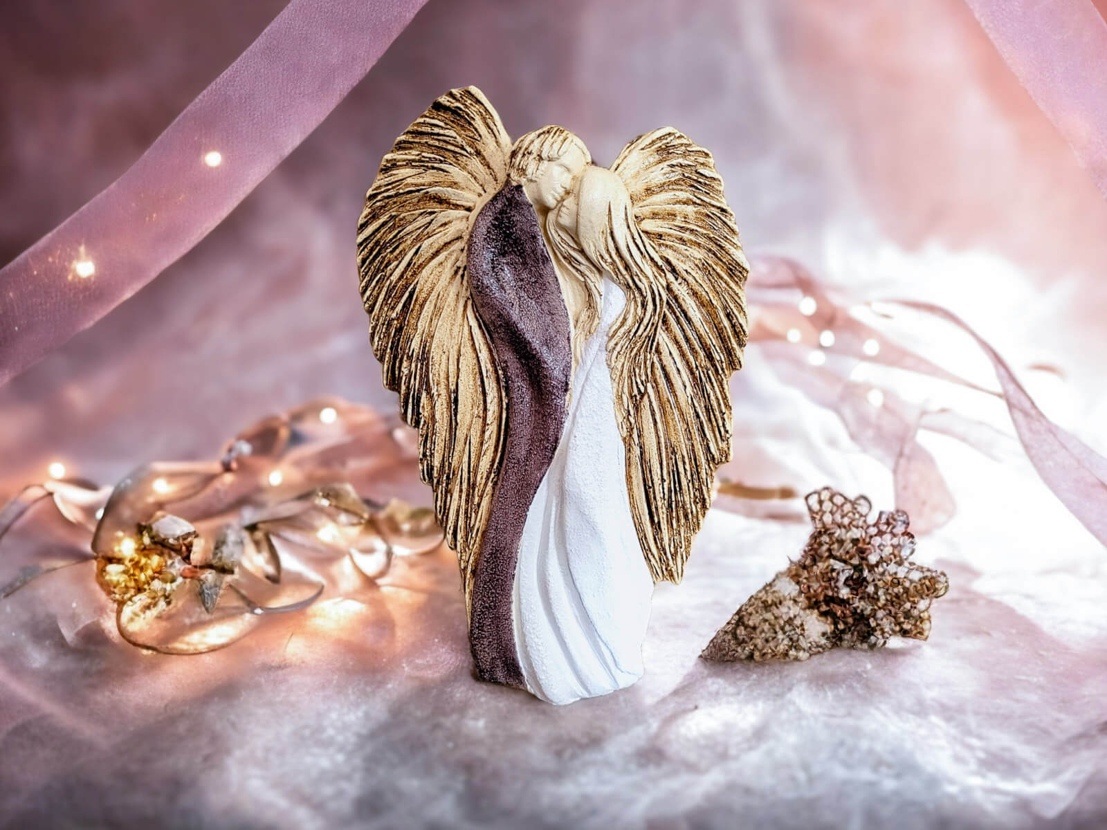 Ręcznie wykonana i ręcznie malowana figurka zakochanych aniołów w eleganckim kolorze biało liliowym. Symbolizuje miłość, bliskość i energetyczną harmonię nawiązując do symbolu Yin Yang. Idealna na prezent ślubny i na rocznicę ślubu lub na inną okoliczność. Tutaj przeczytasz więcej o harmonii Yin Yang.