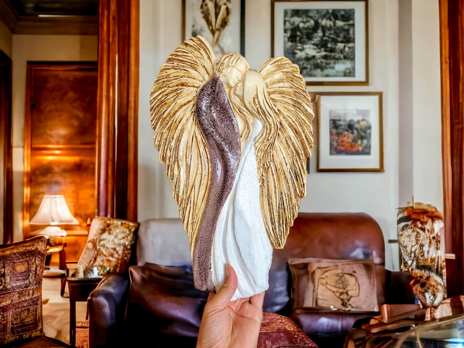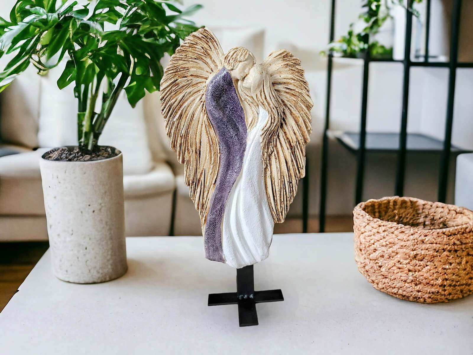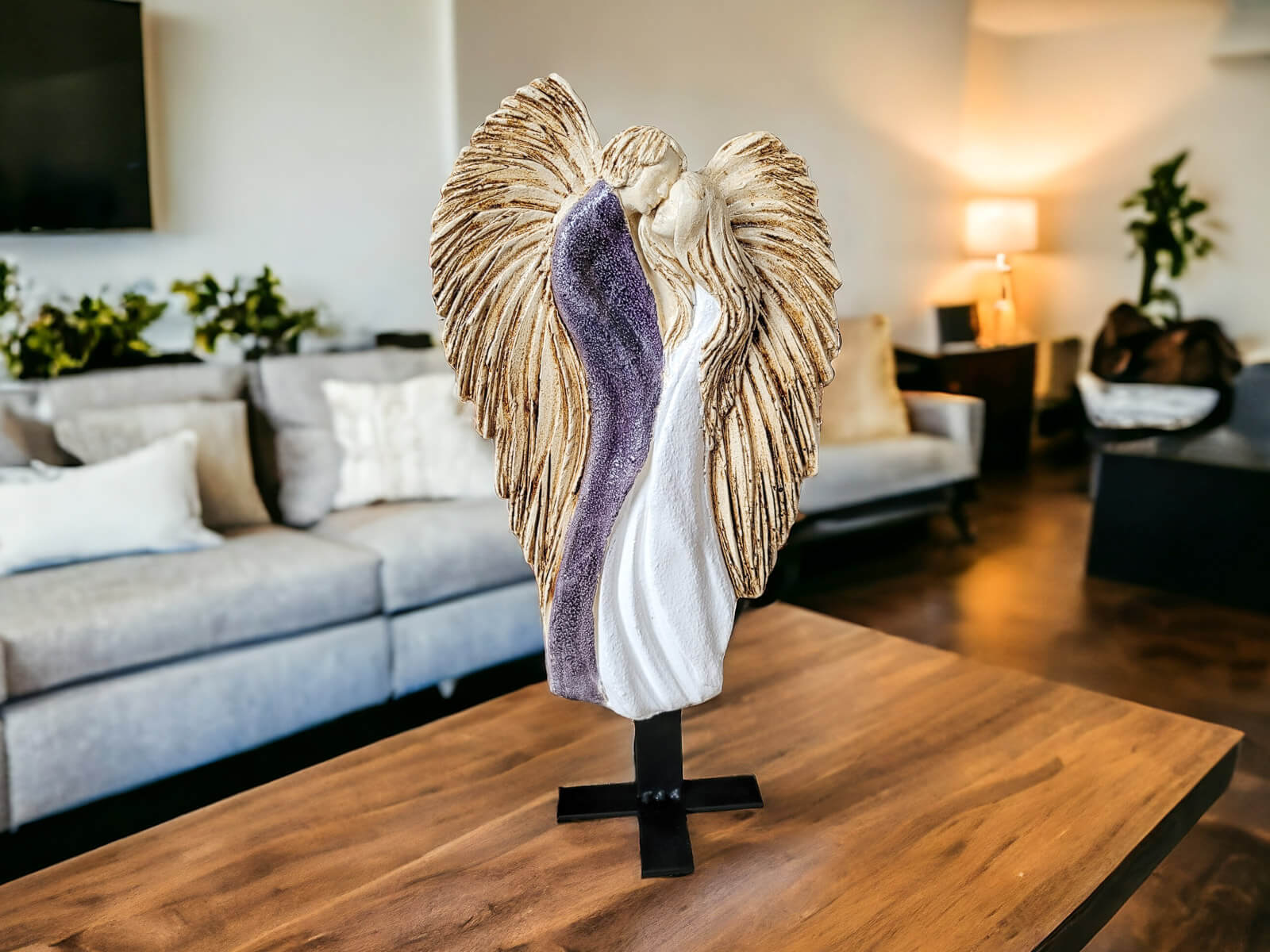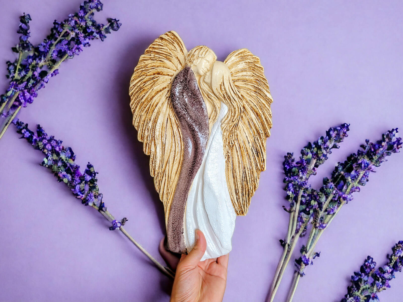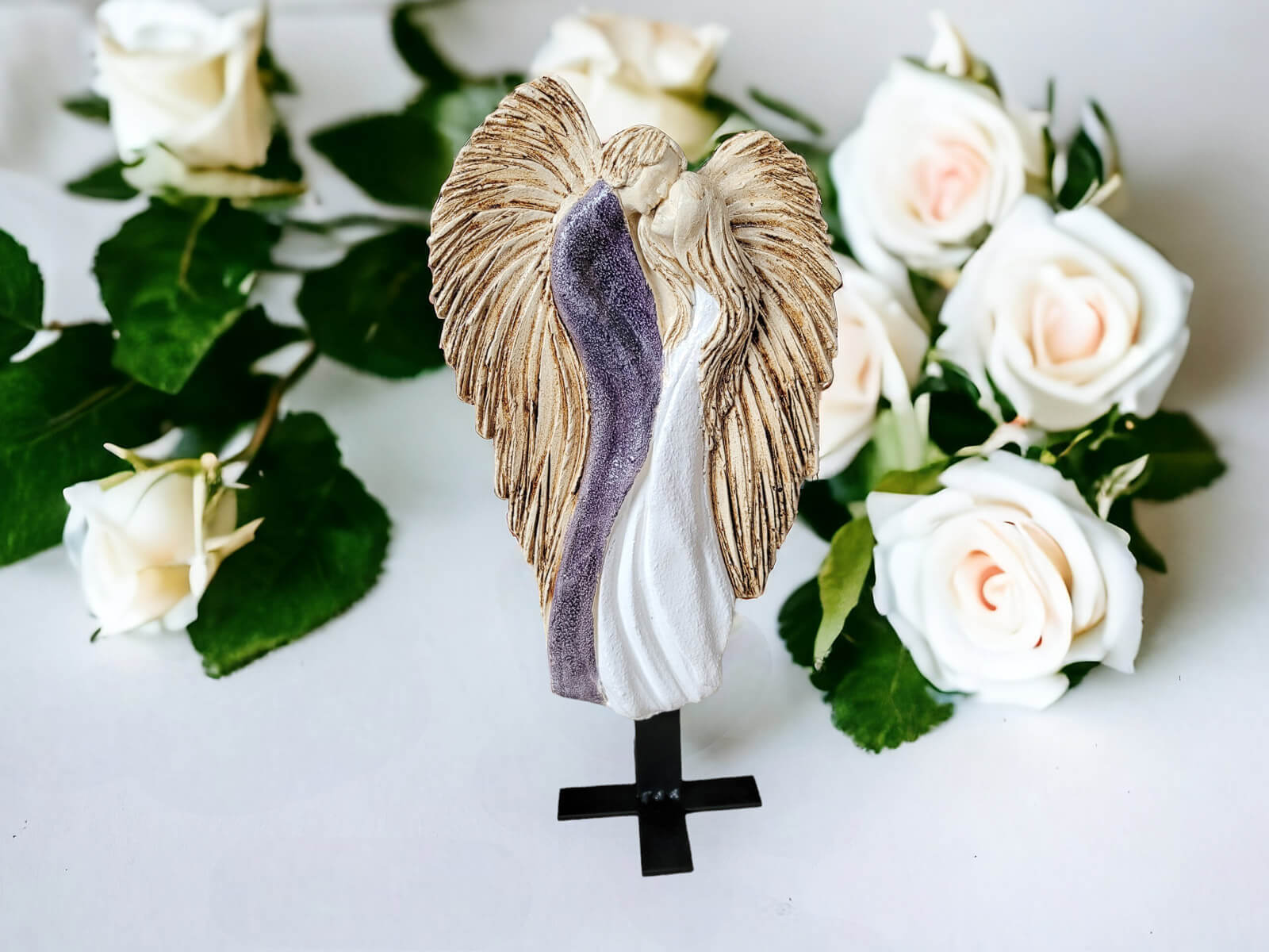 Ręcznie wykonana i ręcznie malowana figurka zakochanych aniołów w eleganckim kolorze biało liliowym. Symbolizuje miłość, bliskość i energetyczną harmonię nawiązując do symbolu Yin Yang. Idealna na prezent ślubny i na rocznicę ślubu lub na inną okoliczność. Tutaj przeczytasz więcej o harmonii Yin Yang.