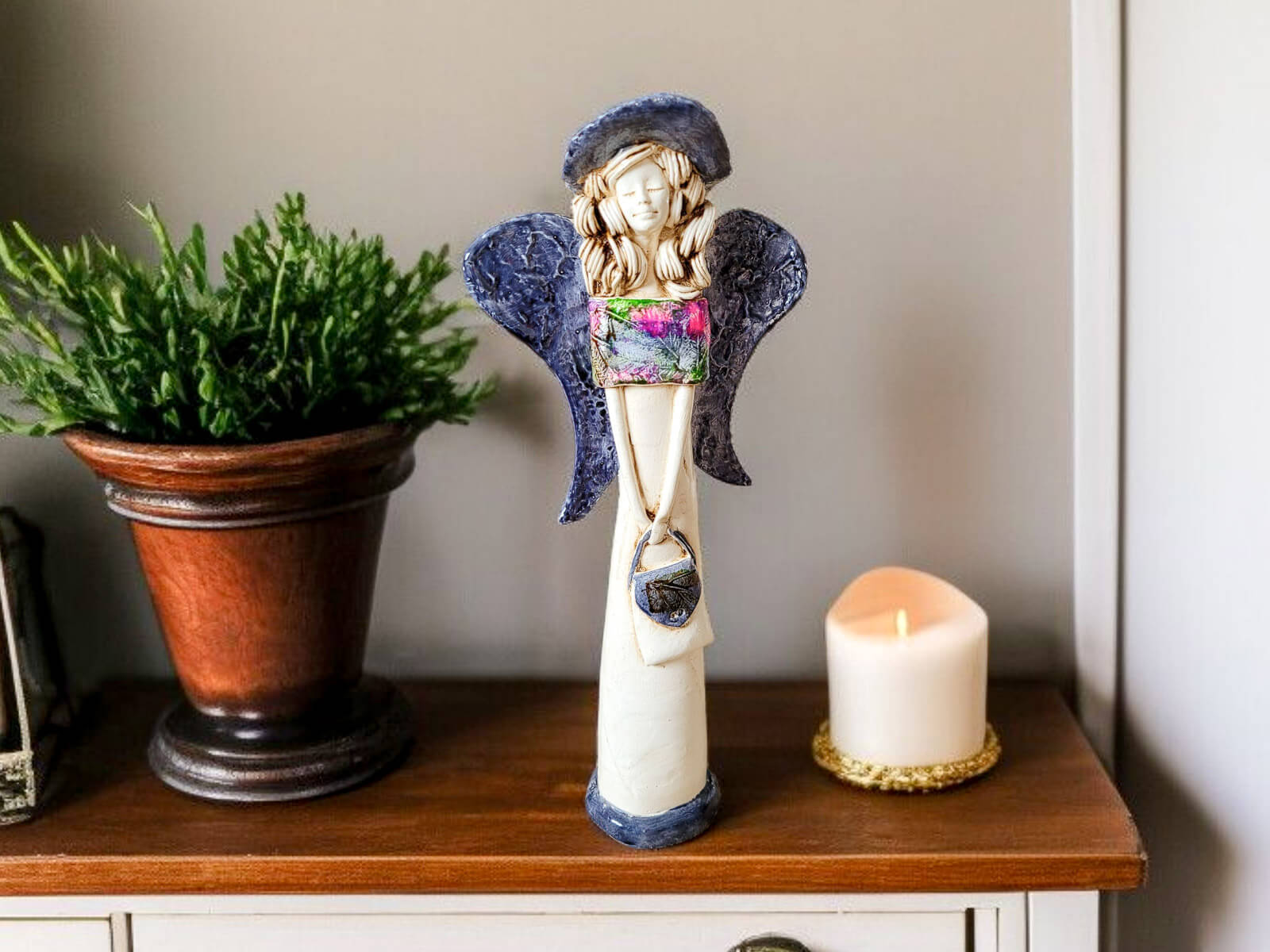 Anioł Coco w unikalnej kolekcji Art Leaf. Coco to ręcznie wykonana figurka gipsowa w kształcie filigranowej dziewczynki. Ma cudowne rozłożyste skrzydła. Jej beżowy ubiór podkreślają kolorowe akcenty z wzorami liści. Figurka Coco idealnie nadaje się na prezent na dziewczynki lub kobiety jak piękna ozdoba wnosząca do wnętrza dużo pozytywnej energii.