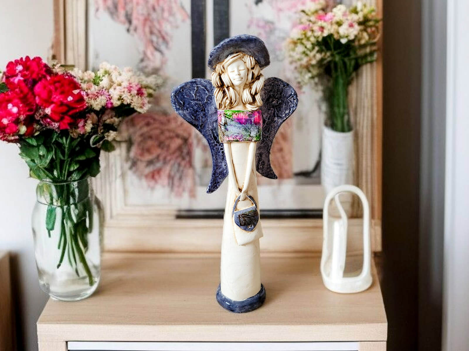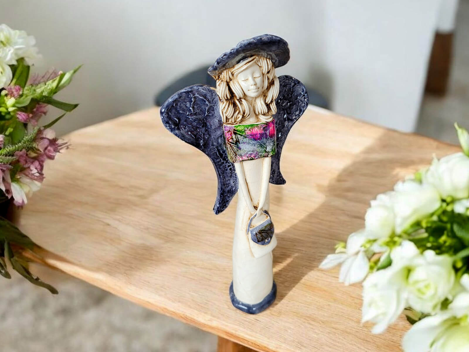 Jeśli anioł ma zostać wręczony jako prezent możemy go również elegancko zapakować w przeźroczysty celofan wiązany ekologicznym sznurkiem. Dzięki temu anioł będzie wyglądał jeszcze bardziej dostojnie i będzie gotowy do wręczenia. Dla wygody możesz również od razu zakupić papierową białą torbę prezentową.