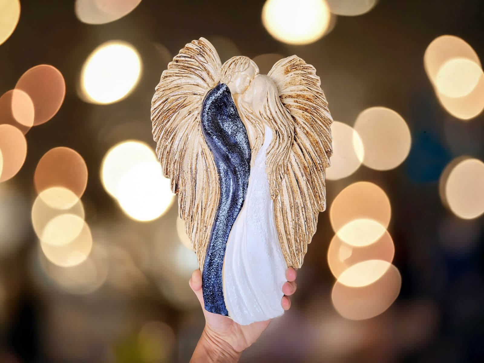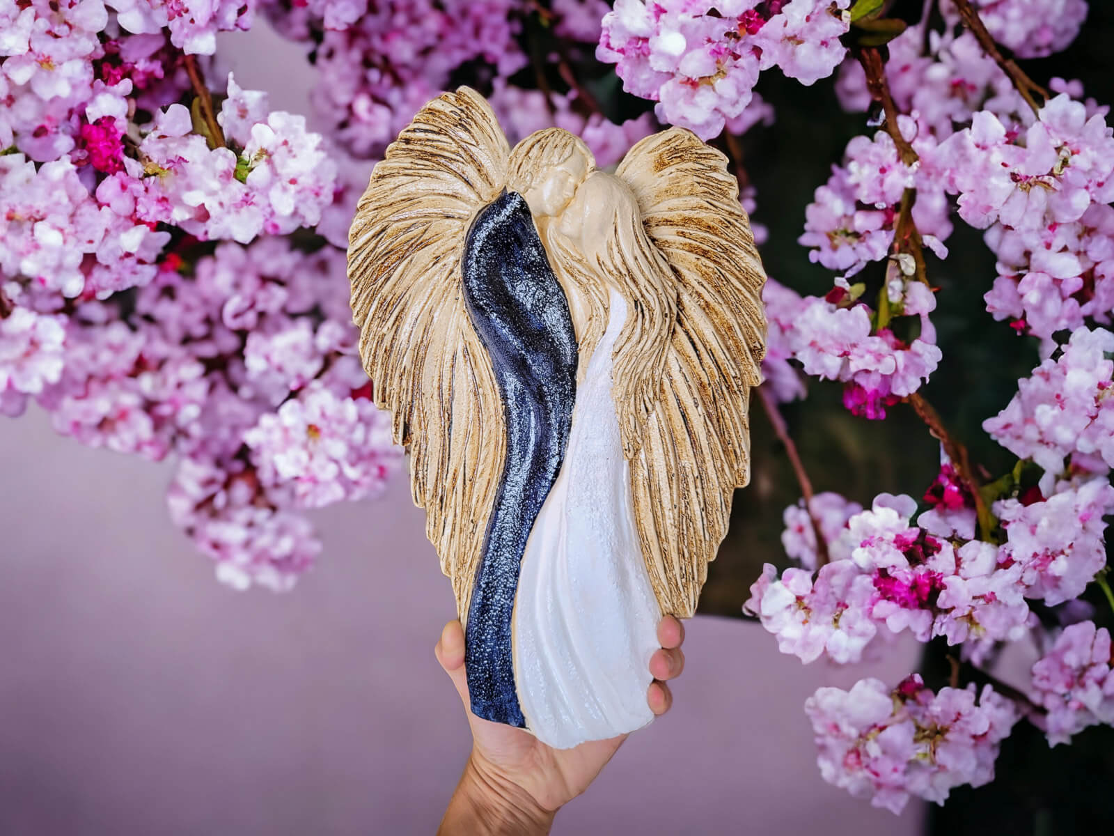 Ręcznie wykonana i ręcznie malowana figurka zakochanych aniołów w eleganckim kolorze biało granatowym. Symbolizuje miłość, bliskość i energetyczną harmonię nawiązując do symbolu Yin Yang. Idealna na prezent ślubny i na rocznicę ślubu lub na inną okoliczność. Tutaj przeczytasz więcej o harmonii Yin Yang.