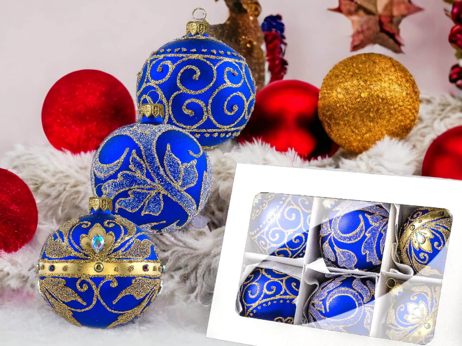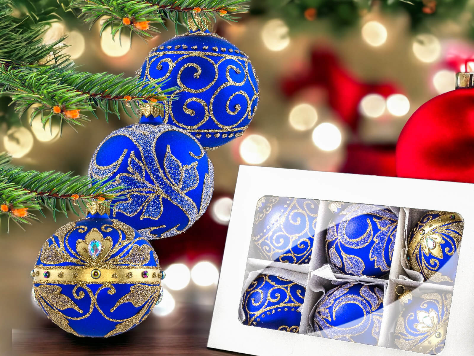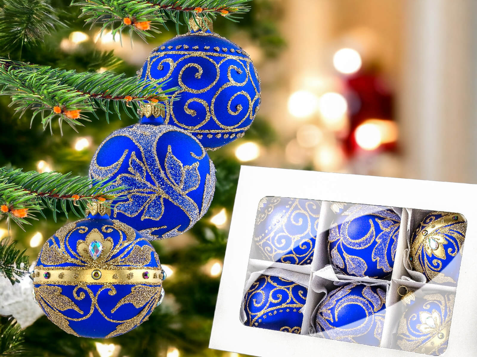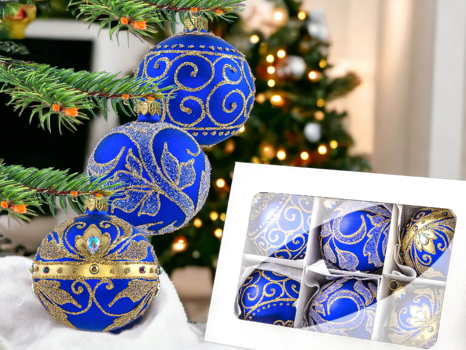Szafirowy podkład bombek stanowi tło dla bogatych złotych zdobień, które zdobią każdą z nich. Złote detale, precyzyjnie nanoszone ręcznie, nadają bombkom wyrafinowanego charakteru, tworząc efektowny zestaw, który z pewnością przyciągnie uwagę i stworzy wyjątkowy klimat świąt.