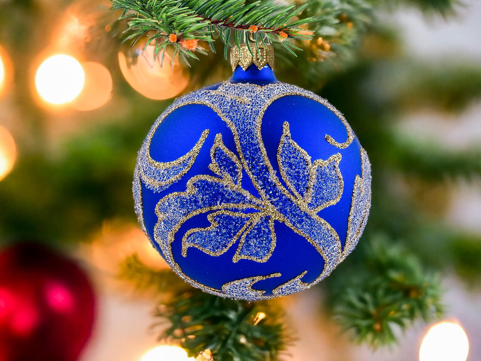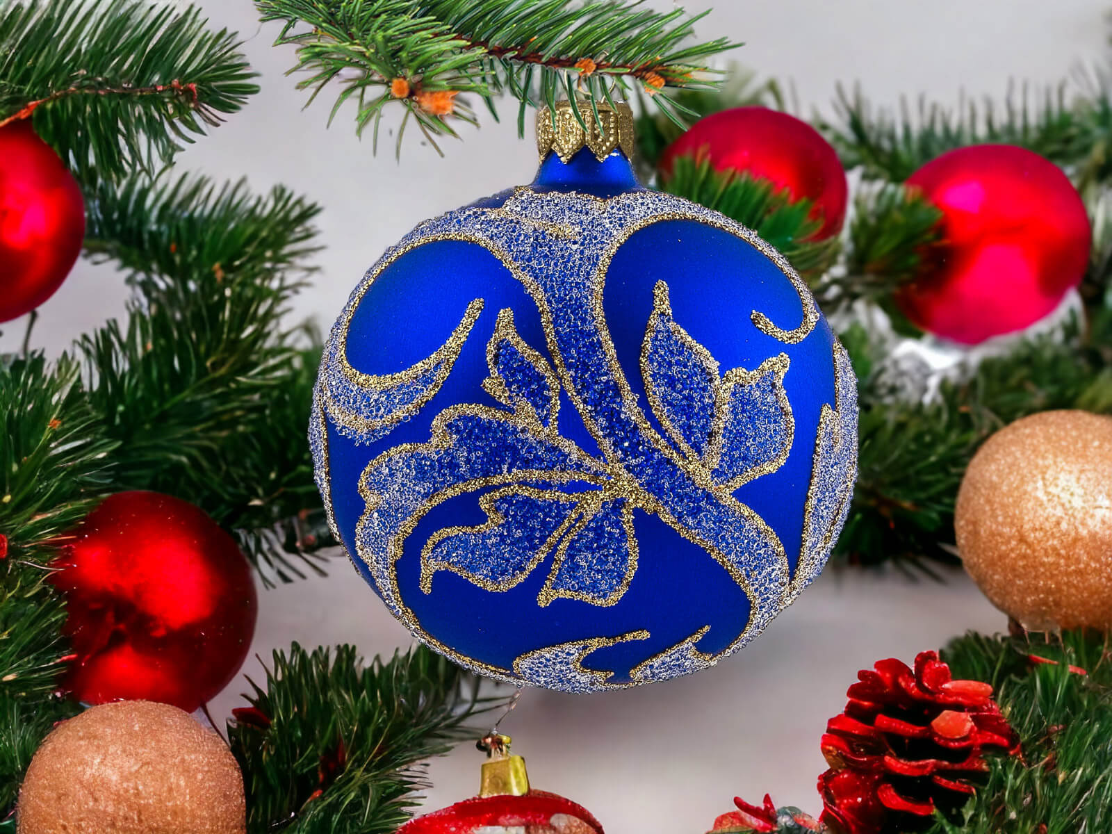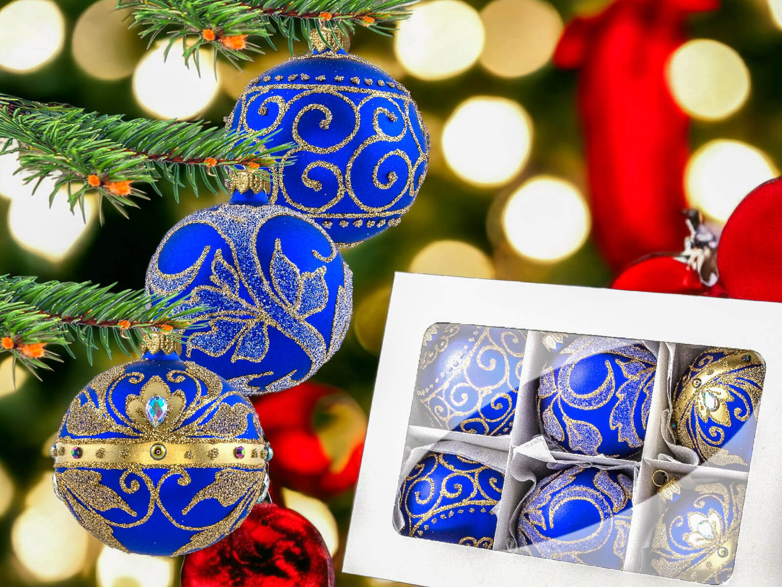 Szafirowy podkład bombek stanowi tło dla bogatych złotych zdobień, które zdobią każdą z nich. Złote detale, precyzyjnie nanoszone ręcznie, nadają bombkom wyrafinowanego charakteru, tworząc efektowny zestaw, który z pewnością przyciągnie uwagę i stworzy wyjątkowy klimat świąt.