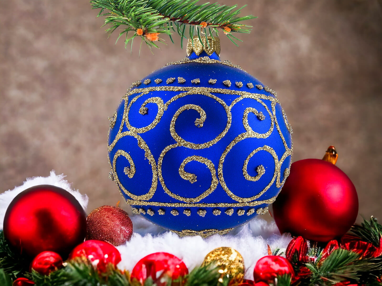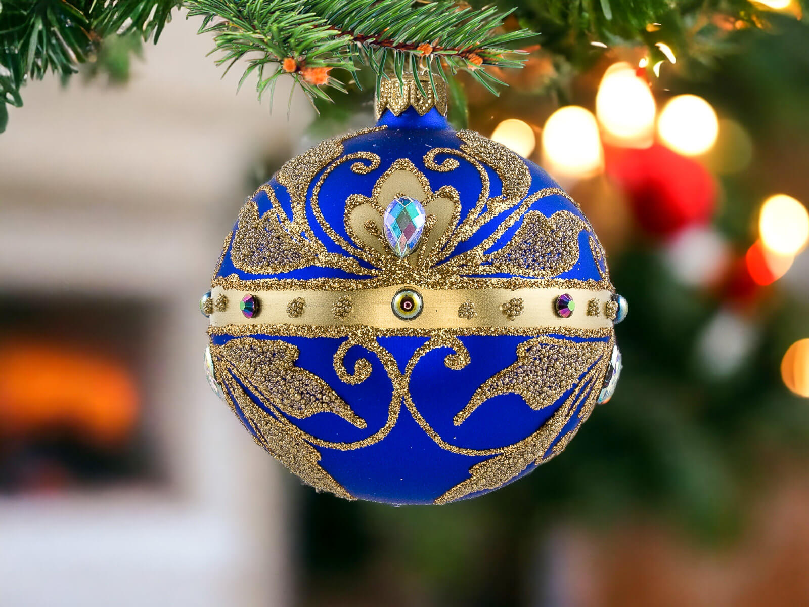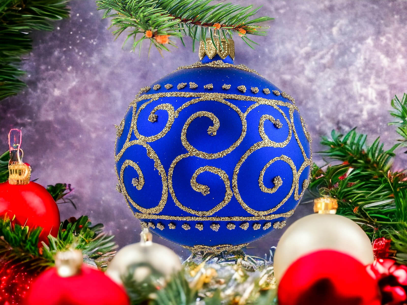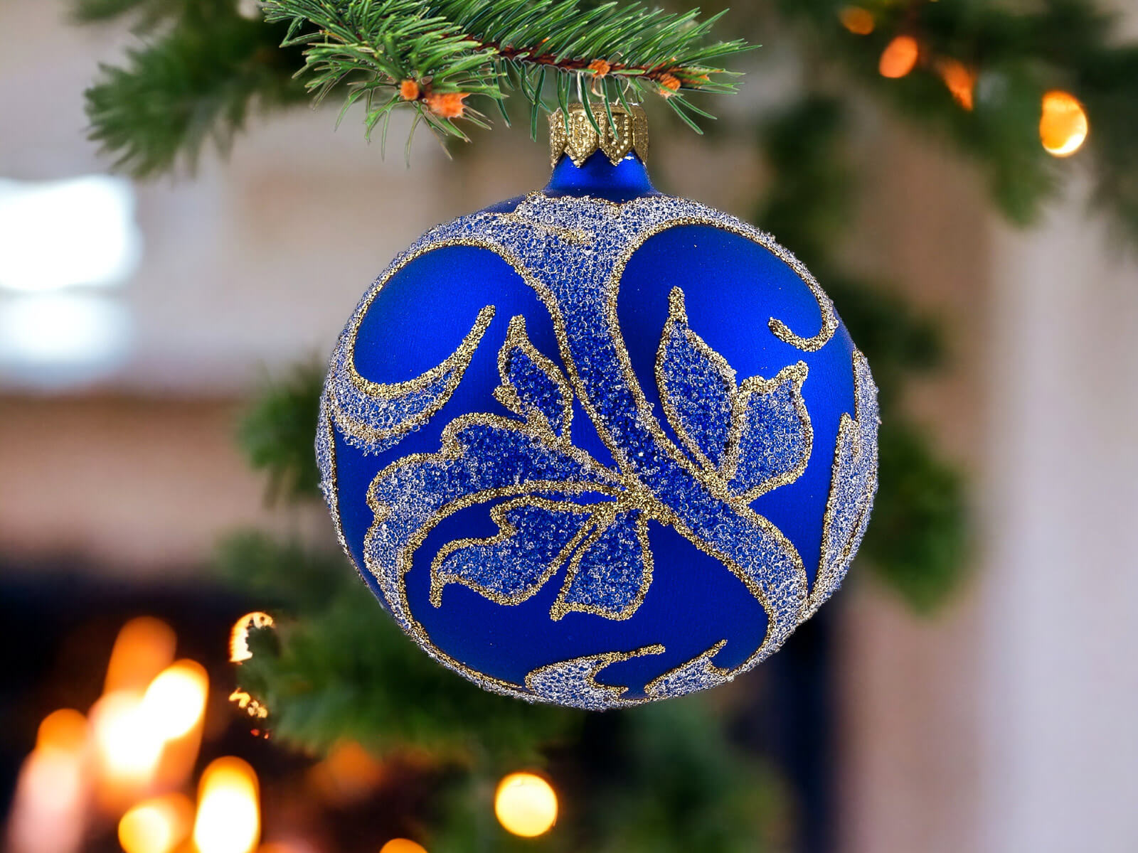 Szafirowy podkład bombek stanowi tło dla bogatych złotych zdobień, które zdobią każdą z nich. Złote detale, precyzyjnie nanoszone ręcznie, nadają bombkom wyrafinowanego charakteru, tworząc efektowny zestaw, który z pewnością przyciągnie uwagę i stworzy wyjątkowy klimat świąt.