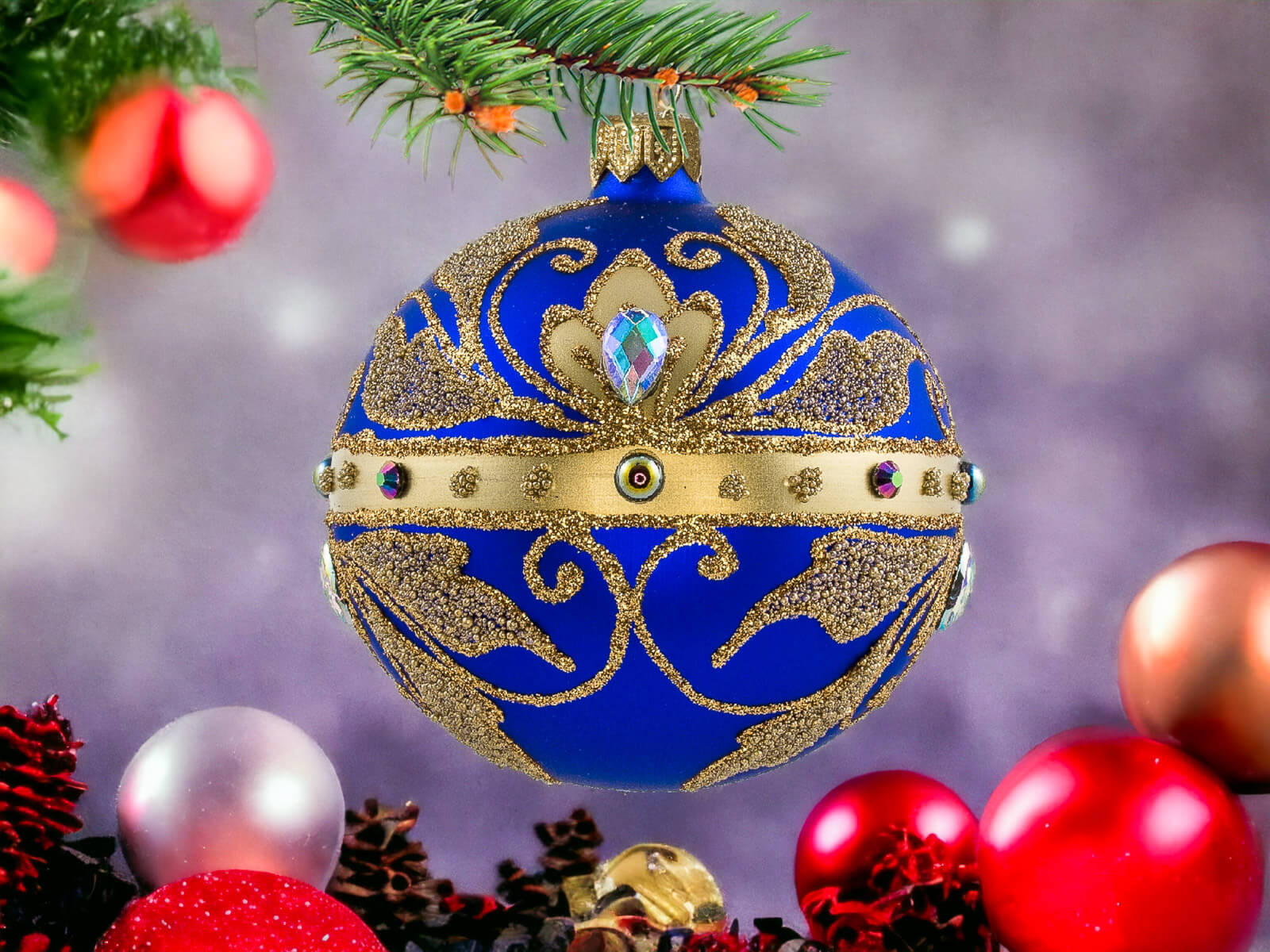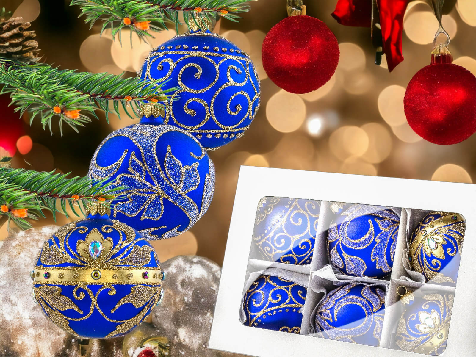Komplet szklanych bombek Złoty Mix Królewski szafirowy, który wypełni Twój dom magią świąt Bożego Narodzenia. Te ręcznie robione i malowane ozdoby są nie tylko eleganckim dodatkiem do choinki, ale także wyrazem tradycji polskiego rękodzieła i staranności w każdym detalu.