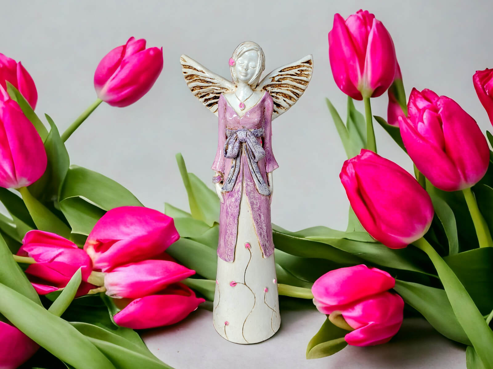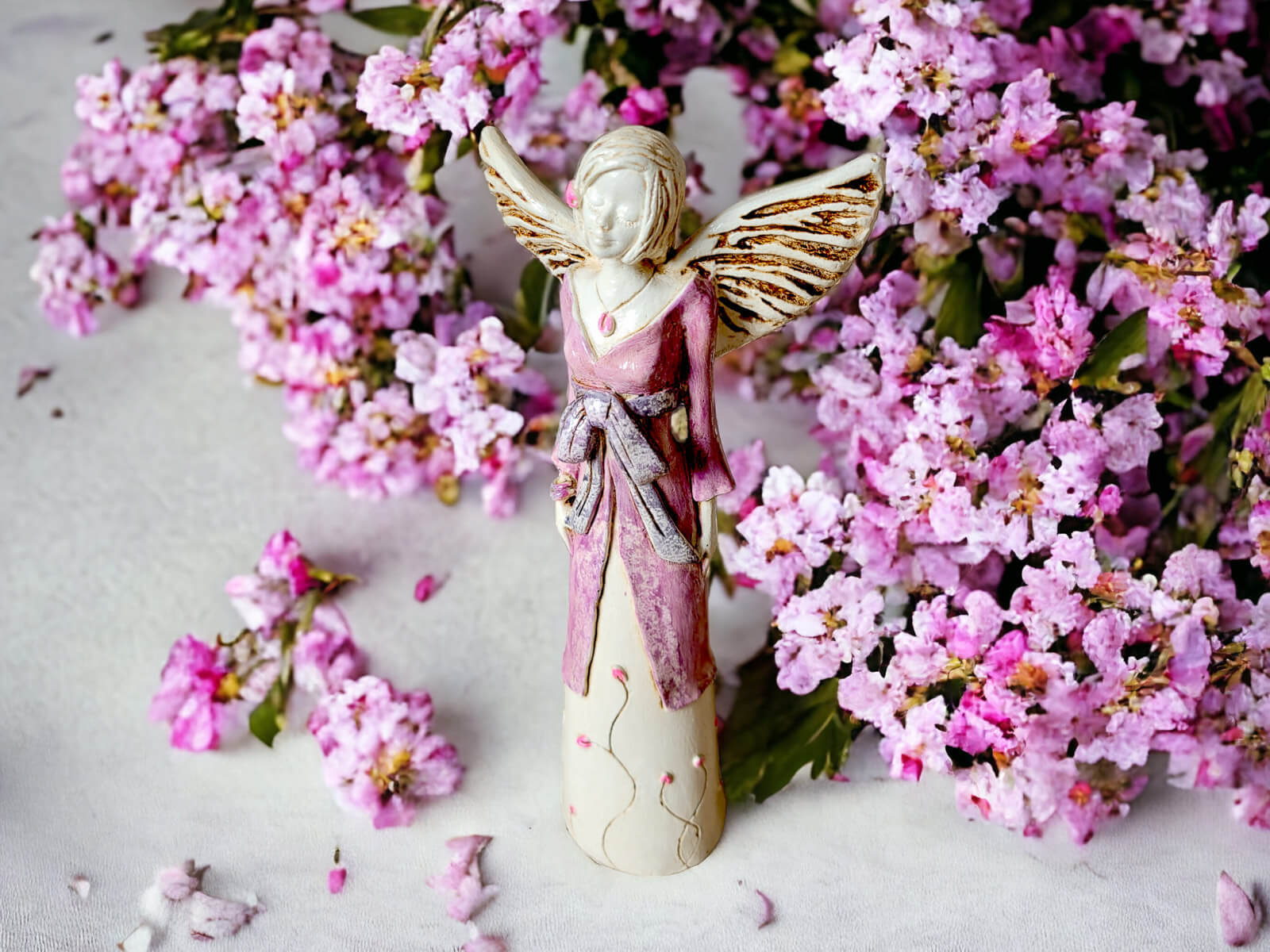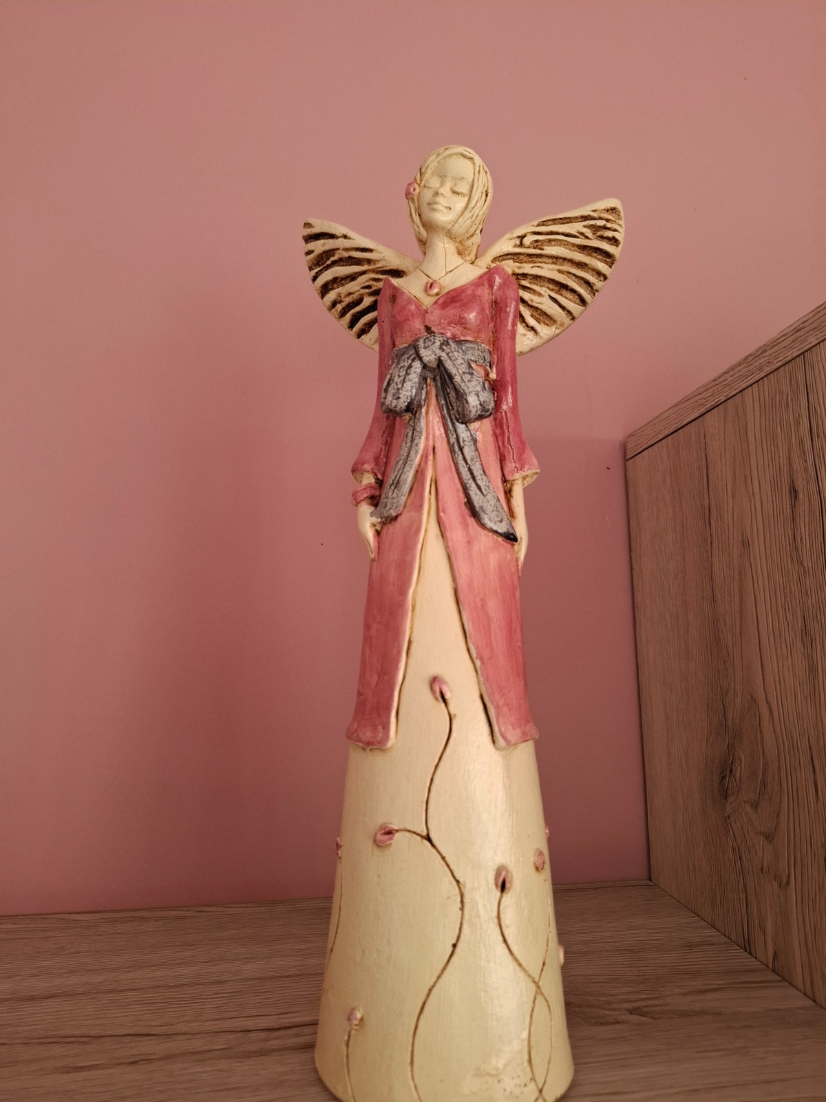 Anioł Lily w pastelowo różowej sukni jest przepiękną postacią o uspokajającym i kojącym wyrazie twarzy. Jej puszyste skrzydła dopełniają jej idylliczny charakter. Ma na sobie długą biało-beżową suknię, po której pną się kwiaty. Figurka sprawdzi się bowiem jako prezent z wielu okazji, a przy tym będzie pięknym akcentem w każdym mieszkaniu.