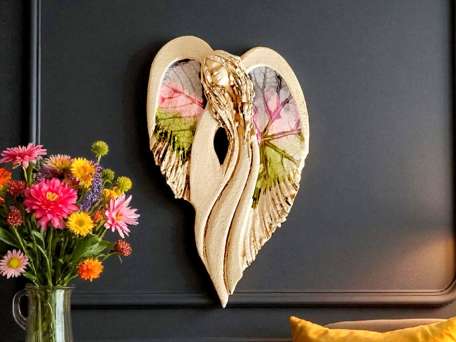 Unikalny anioł Cynthia z kolekcji Art. Jedyna sztuka z tym wzorem. Wyjątkowa uroda, ujmująca delikatność, wielka wrażliwość, kwintesencja kobiecości, pełna miłości, porywająca, a jednocześnie zapewniająca spokój. Zobacz jak pięknie chroni miłość, jak dba i troszczy się o Ciebie i Twoich bliskich, opiekuje, obdarza wiarą dającą siłę, rozlewa radość do każdego zakątka mieszkania, przepełnia je dobrocią, sercem pełnym nadziei, sprawia, że miłość dwojga ludzi jest spokojną przystanią.