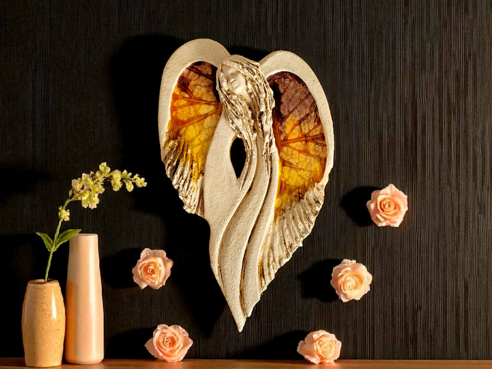 Unikalny anioł Cynthia z kolekcji Art Leaf z wzorami prawdziwych liści. Jedyna sztuka z tym wzorem. Wyjątkowa uroda, ujmująca delikatność, wielka wrażliwość, kwintesencja kobiecości, pełna miłości, porywająca, a jednocześnie zapewniająca spokój. Zobacz jak pięknie chroni miłość, jak dba i troszczy się o Ciebie i Twoich bliskich, opiekuje, obdarza wiarą dającą siłę, rozlewa radość do każdego zakątka mieszkania, przepełnia je dobrocią, sercem pełnym nadziei, sprawia, że miłość dwojga ludzi jest spokojną przystanią.