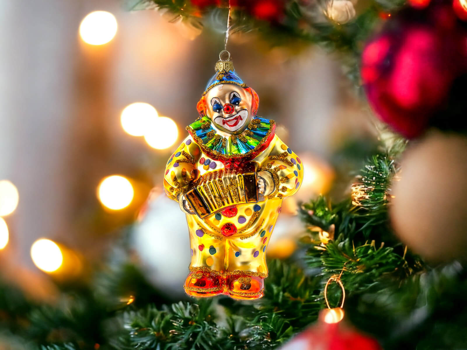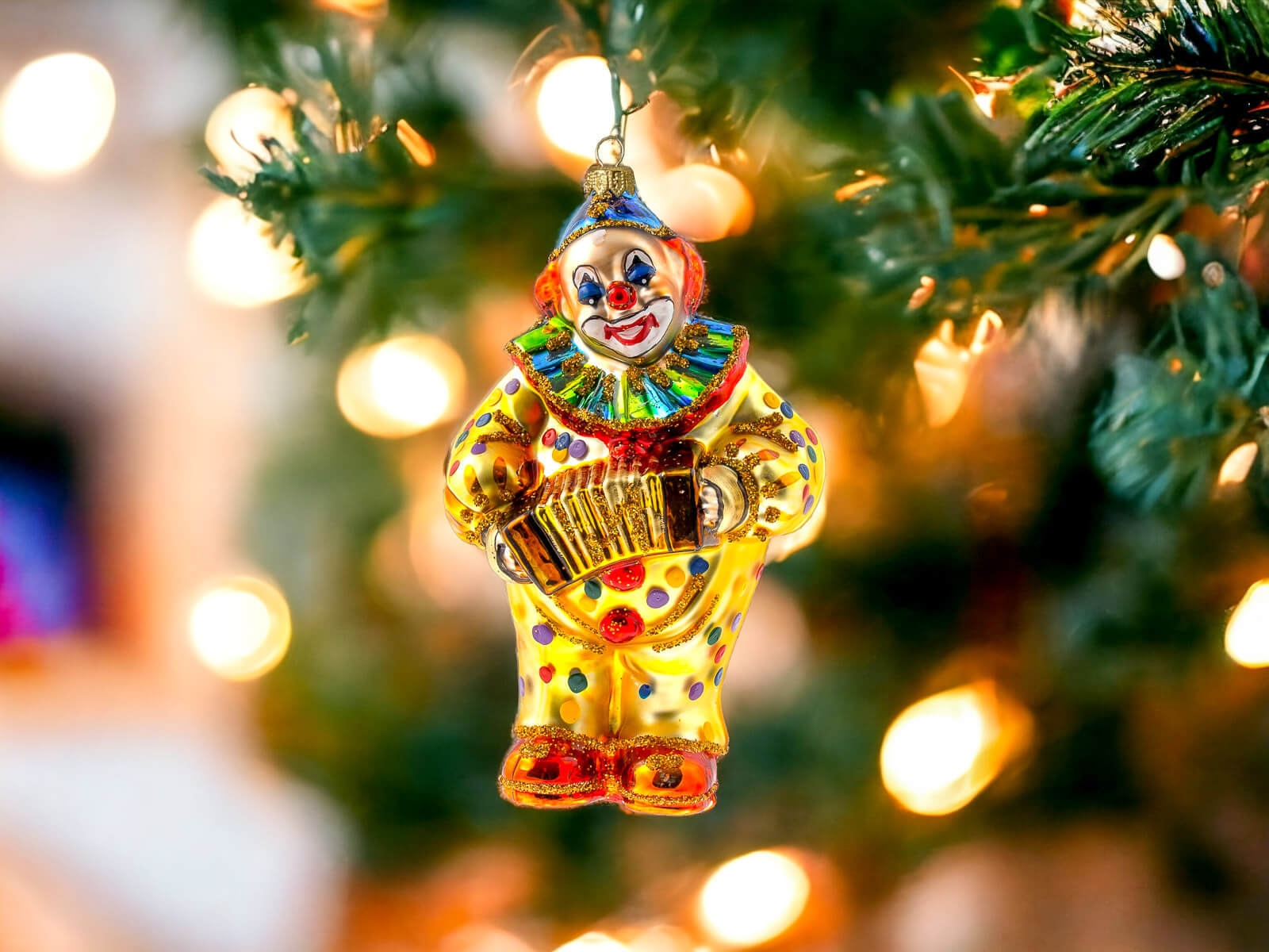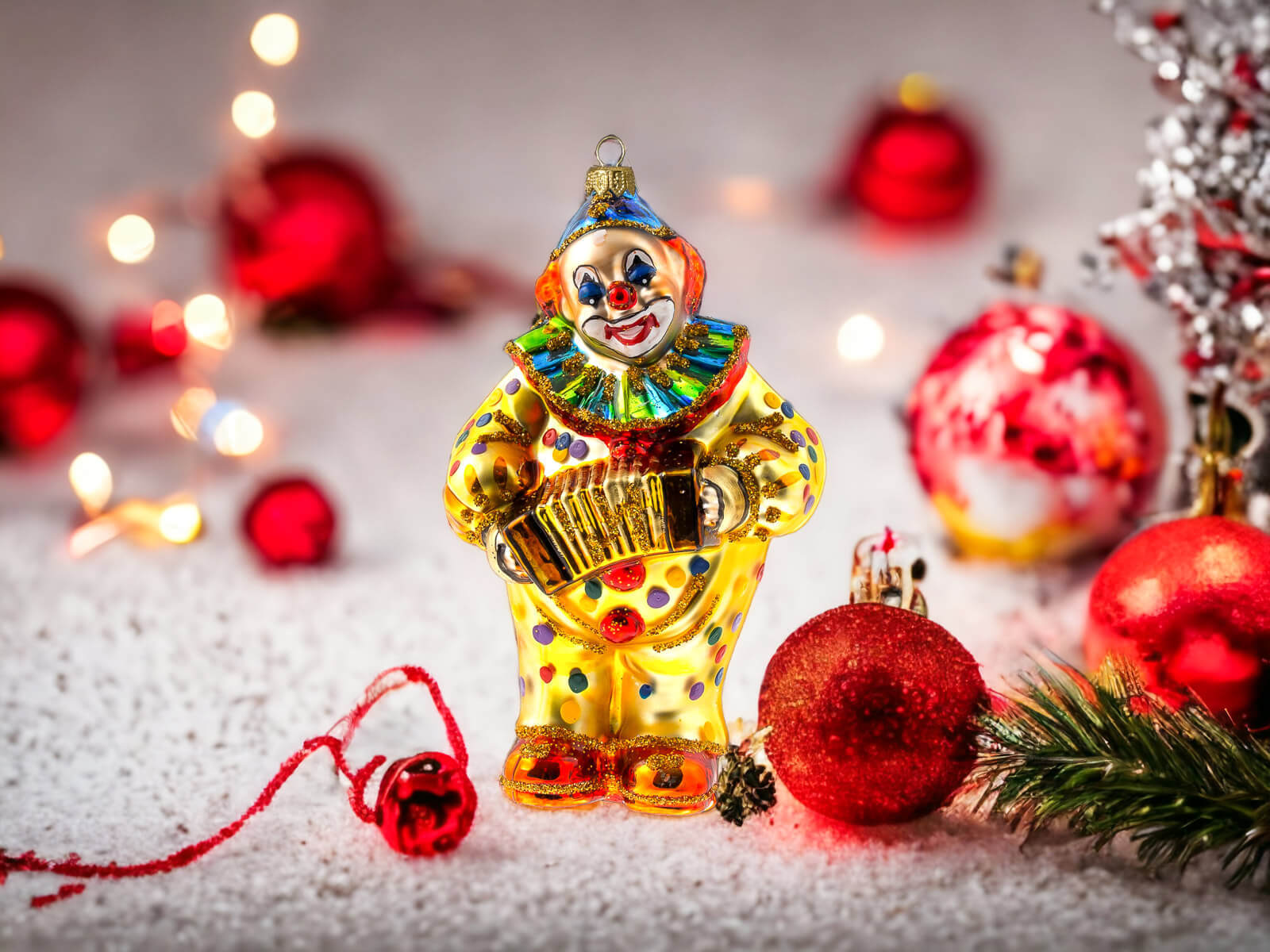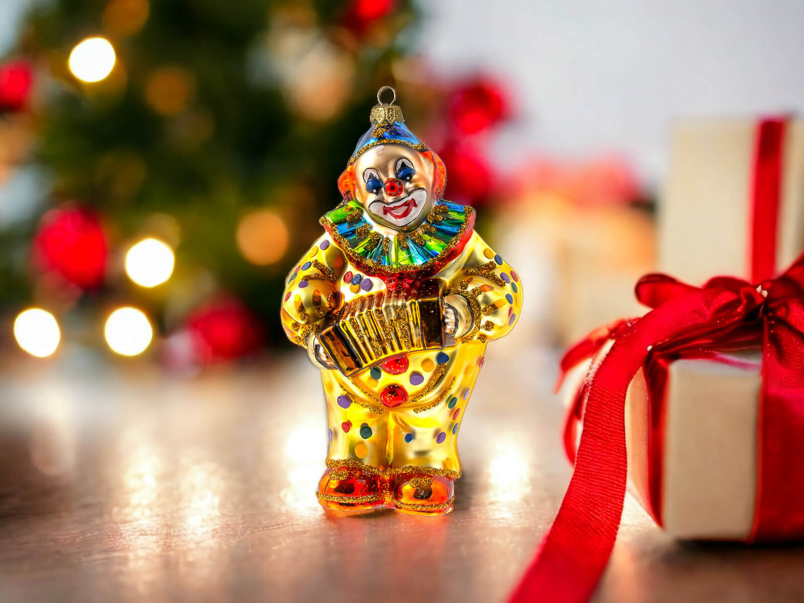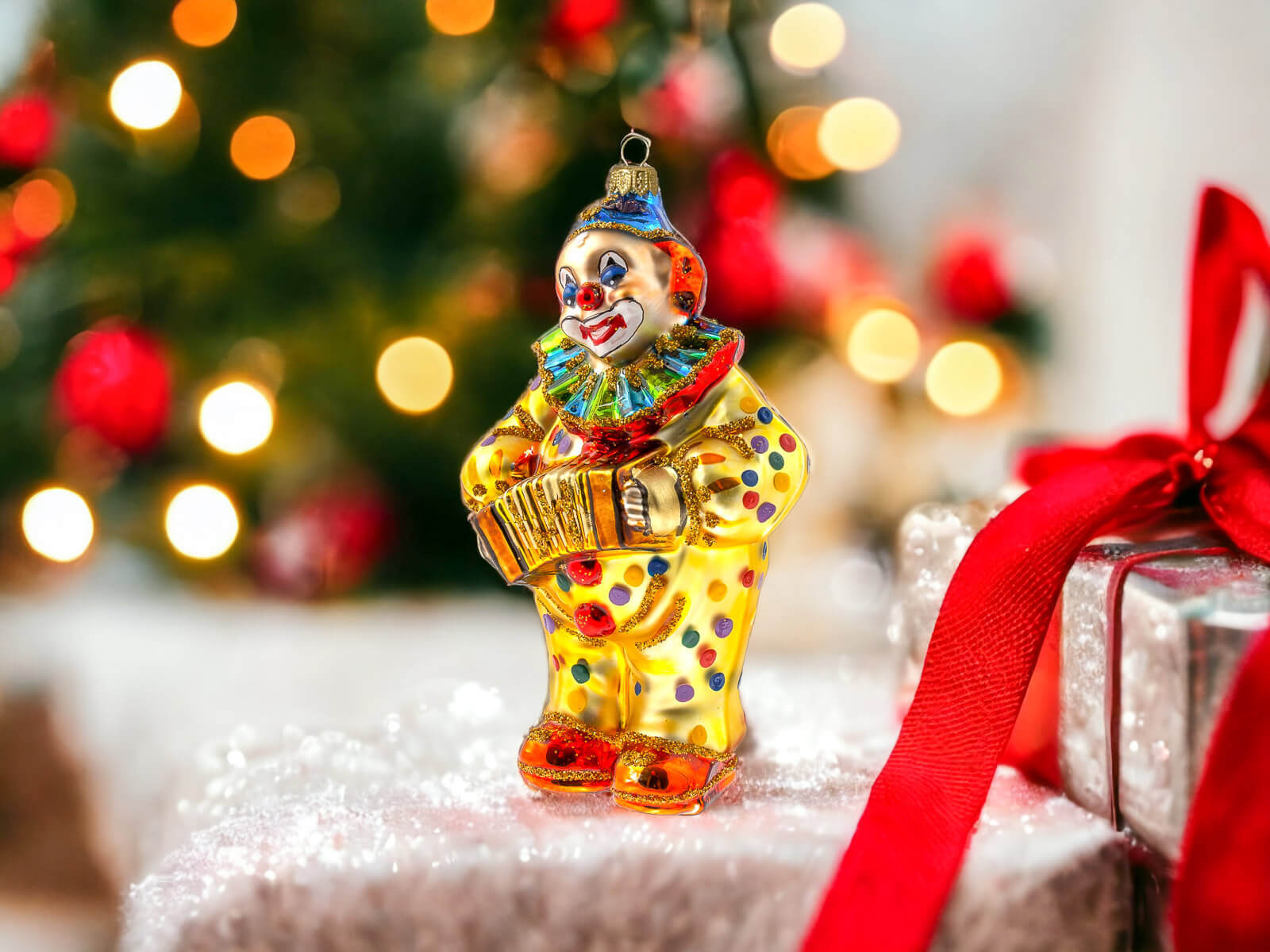 Bombka w kształcie złotego klauna grającego na harmonii to nie tylko ozdoba, ale także przypomnienie, że święta to czas radości i muzyki, która łączy wszystkich – młodszych i starszych – w atmosferze wzajemnej życzliwości i ciepła.