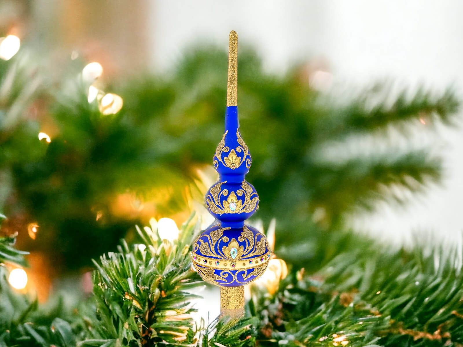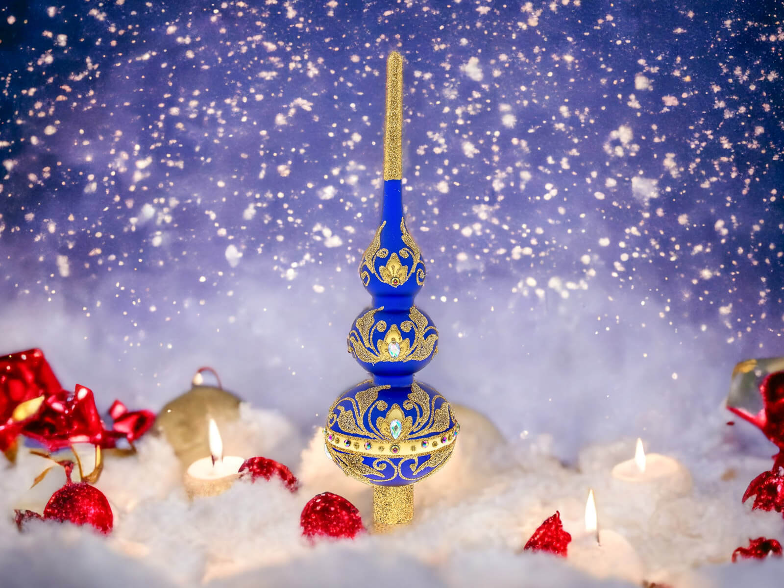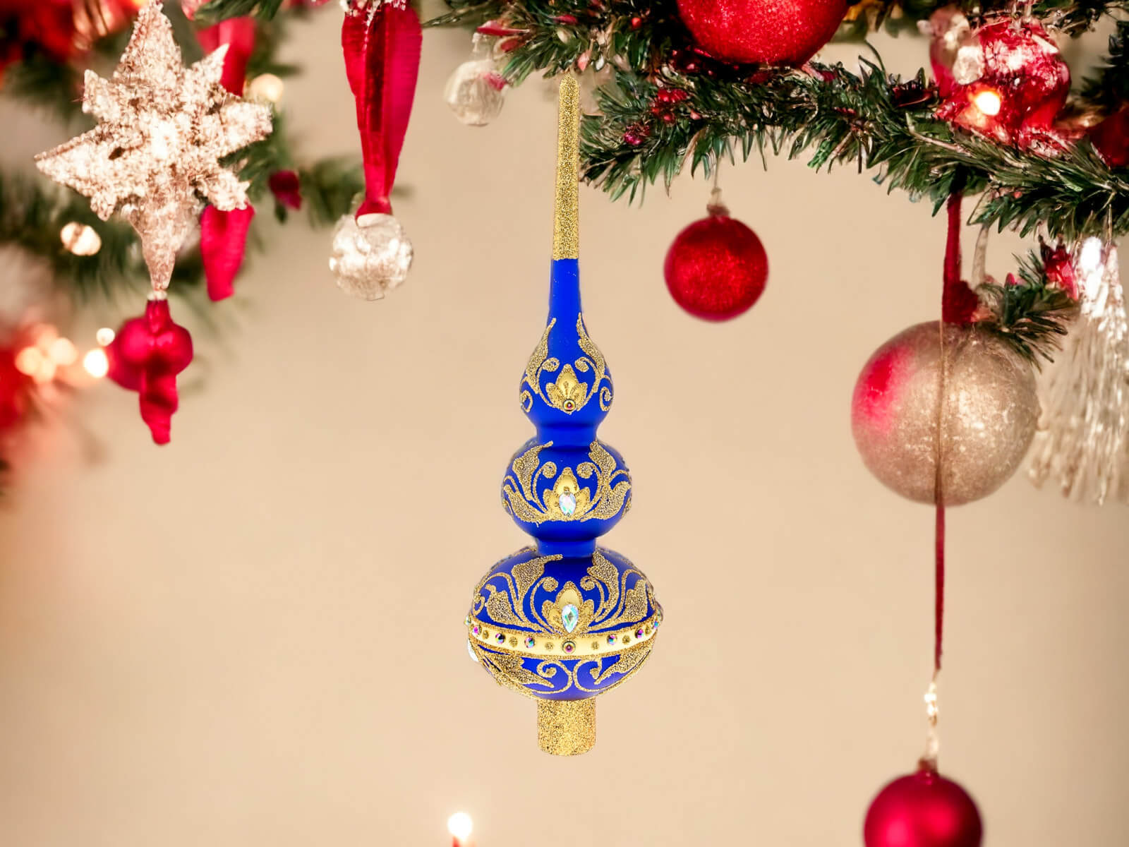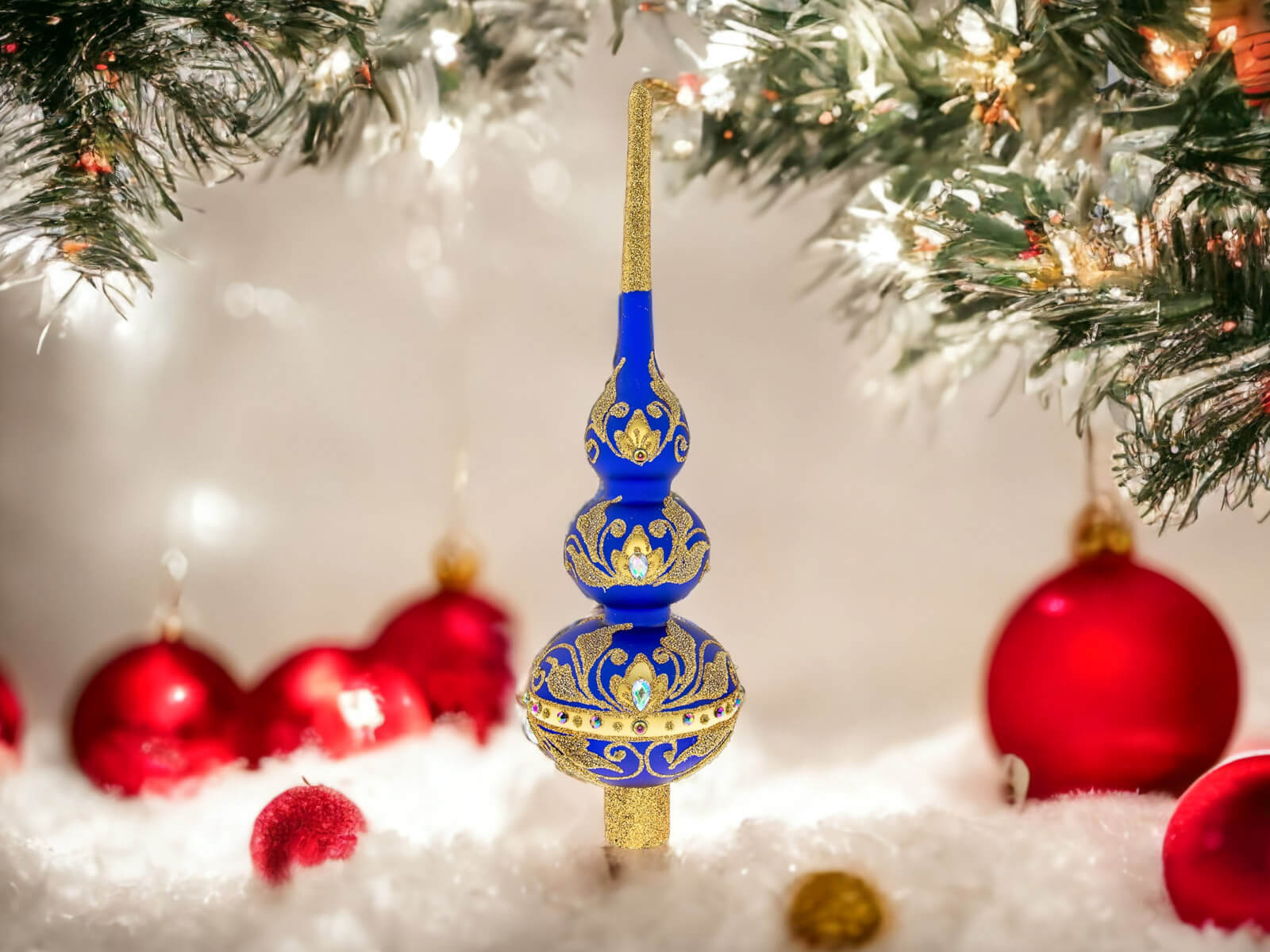 Szklany Szpic Królewski Szafir Mat XXL - majestatyczna elegancja na choince to prawdziwa perła w świecie świątecznych dekoracji. Ręcznie robiony i malowany szpic o imponującej wysokości 32 cm prezentuje się majestatycznie na choince, tworząc efektowny punkt centralny świątecznej aranżacji.