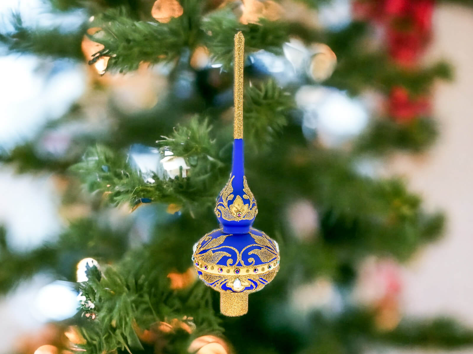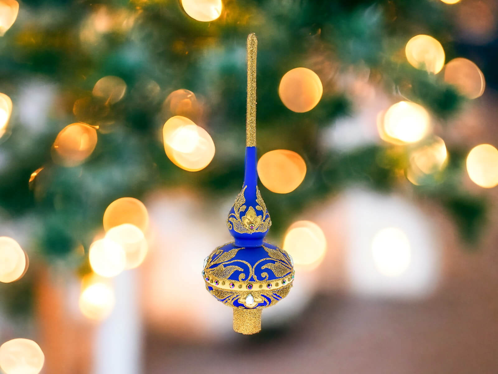 Intensywny odcień granatowego szafiru w matowej tonacji sprawia, że bombka jest pełna elegancji. Złote zdobienia oraz kamienie dodają bombce królewskiego charakteru, podkreślając jednocześnie jej wyjątkowy design.