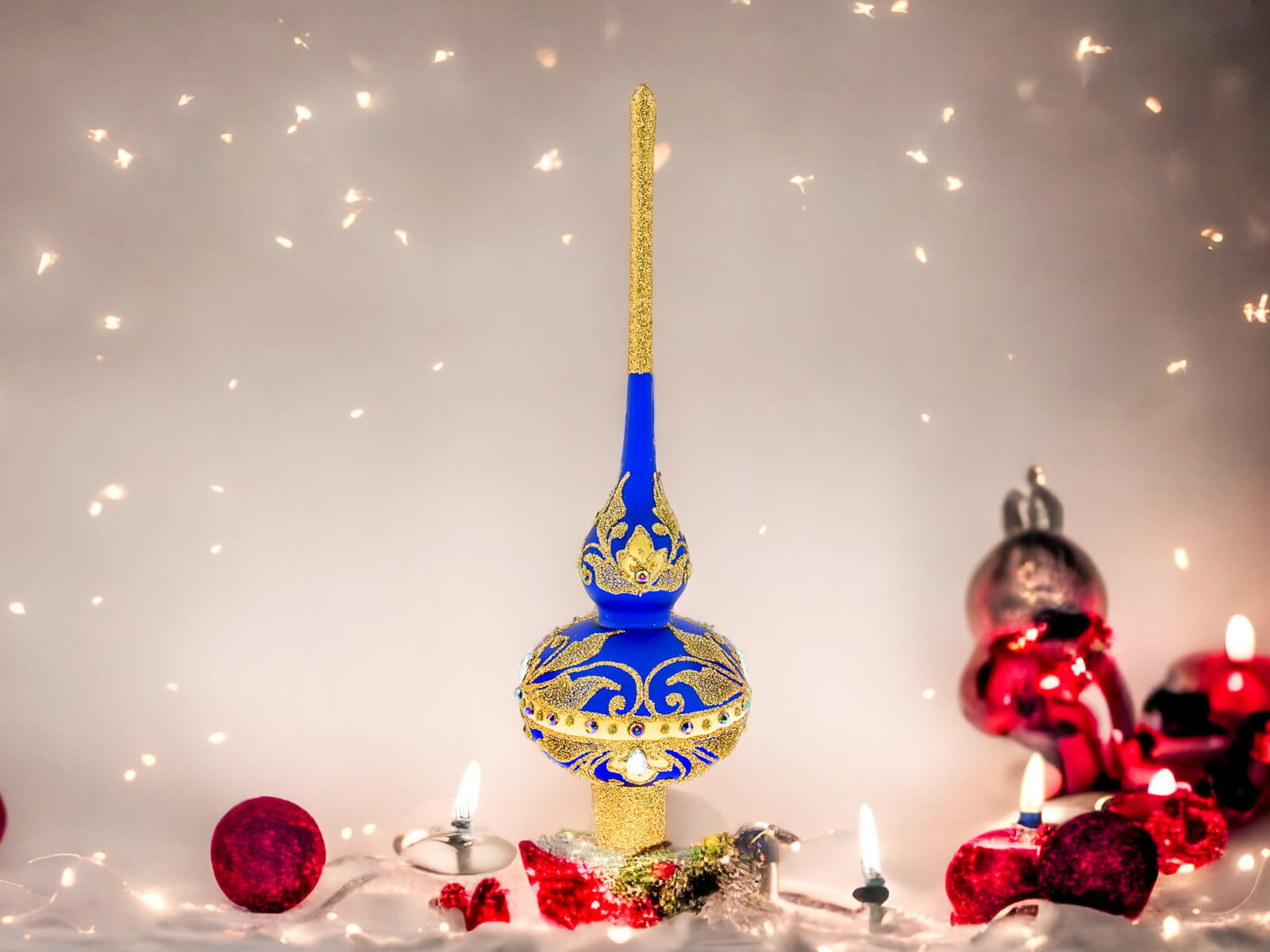Szklany Szpic Królewski Szafir Mat XL - Subtelny Blask Elegancji to kwintesencja luksusu i wyrafinowanego smaku. Ręcznie robiony i malowany szpic o imponującej wysokości 30 cm, zdobi szafirowy podkład, tworząc harmonijny kontrast z złotymi zdobieniami.