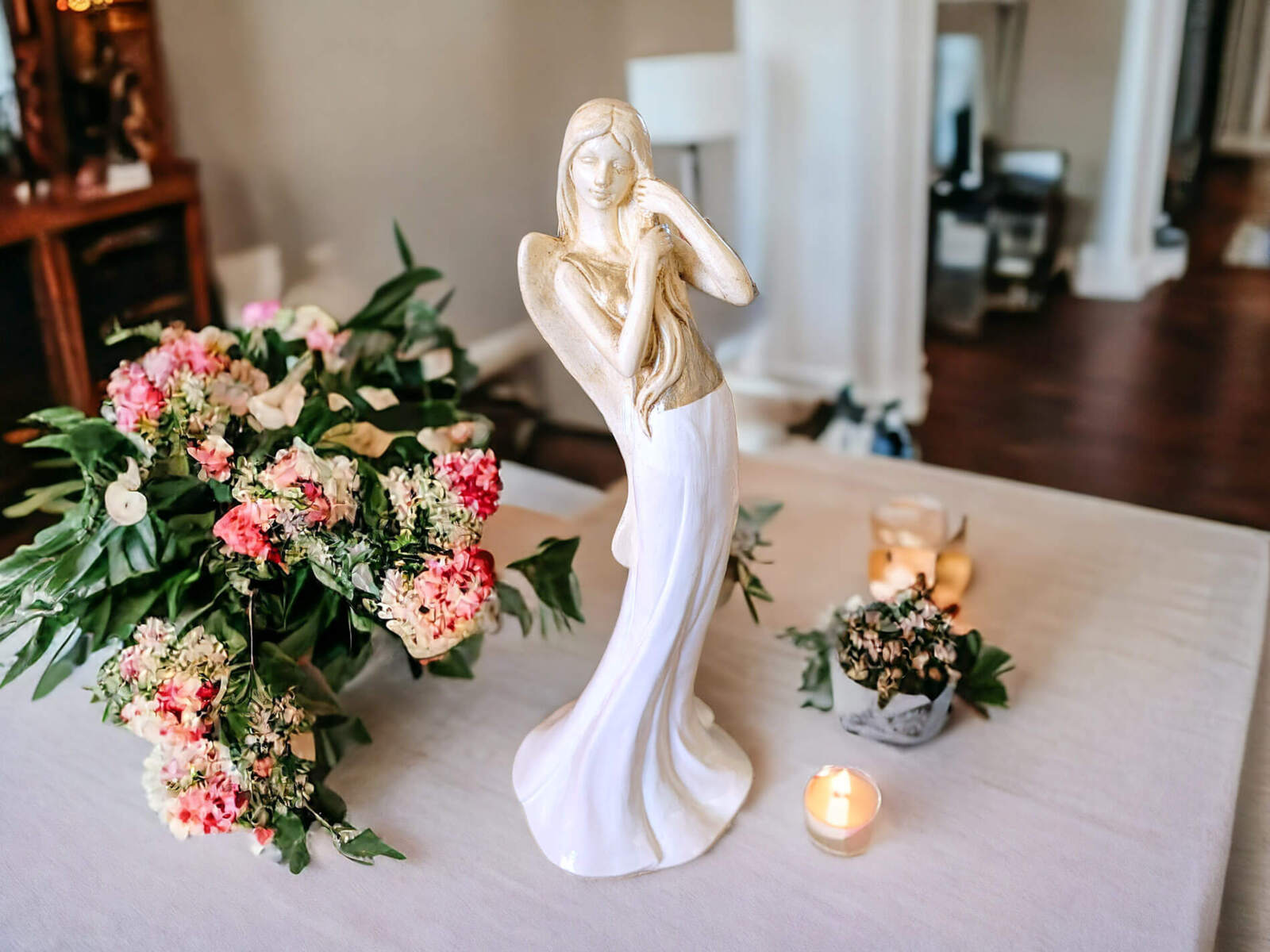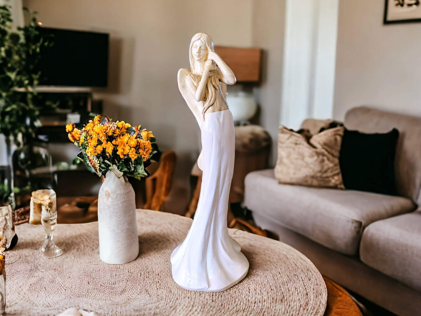 Zrobiona z gipsu figurka ma imponującą wysokość 32 cm, co sprawia, że staje się centralnym punktem uwagi w każdym pomieszczeniu. Jej biała barwa nadaje jej uniwersalny charakter, pasujący zarówno do nowoczesnych, jak i klasycznych aranżacji.