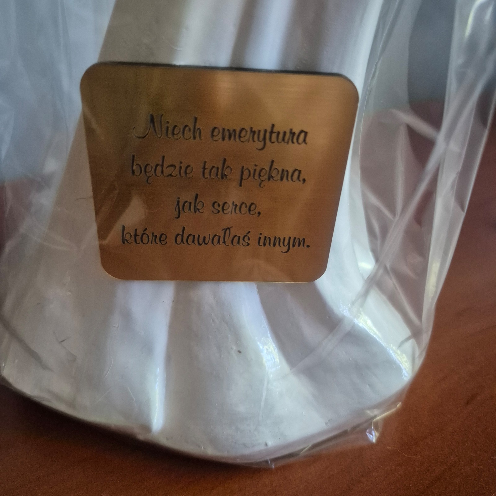 Jeśli anioł ma zostać wręczony jako prezent możemy go również elegancko zapakować w przeźroczysty celofan wiązany ekologicznym sznurkiem. Dzięki temu anioł będzie wyglądał jeszcze bardziej dostojnie i będzie gotowy do wręczenia. Dla wygody możesz również od razu zakupić papierową białą torbę prezentową.