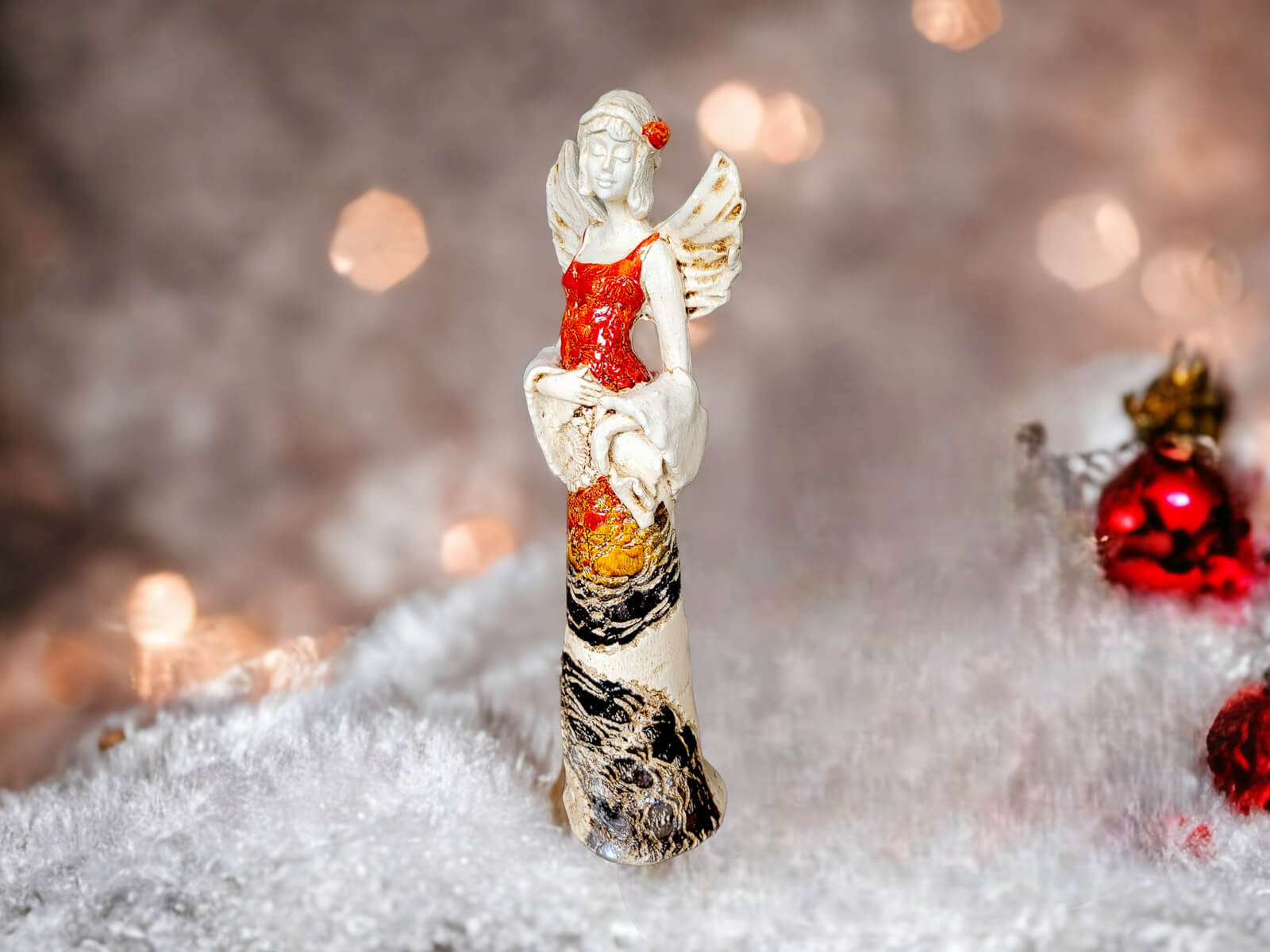 Figurka Anioła Frances w kolorze pomarańczowym emanuje urodą i elegancją. Recznie robiona w Polsce figurka łączy w sobie piękno formy z delikatnością wykonania, tworząc wyjątkową dekorację idealną na różne okazje.