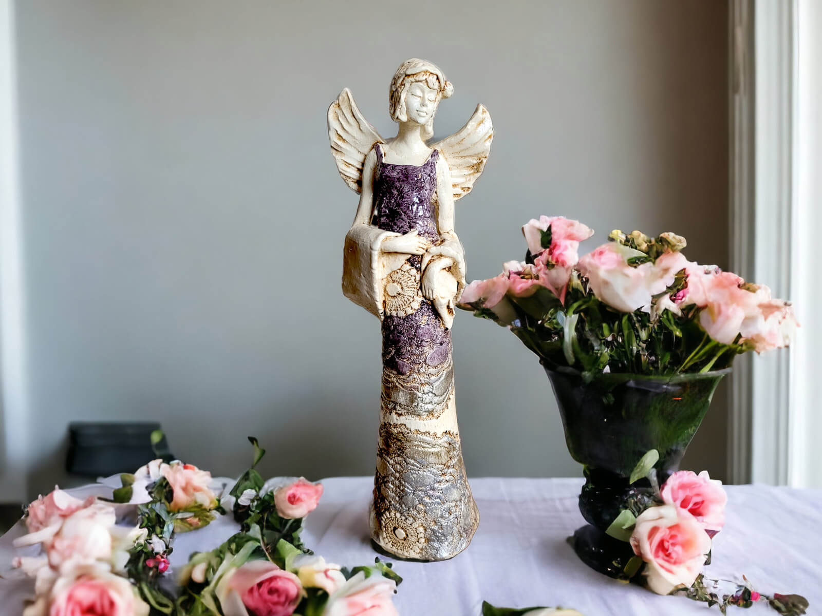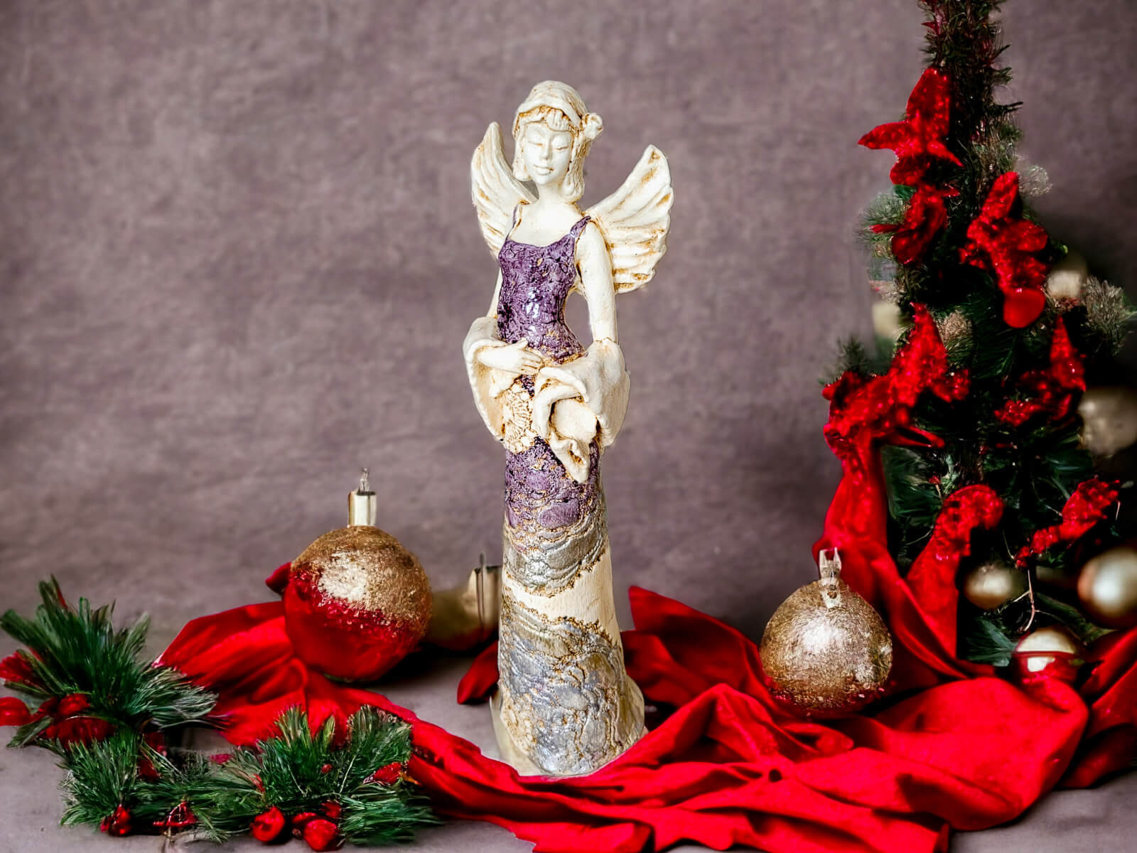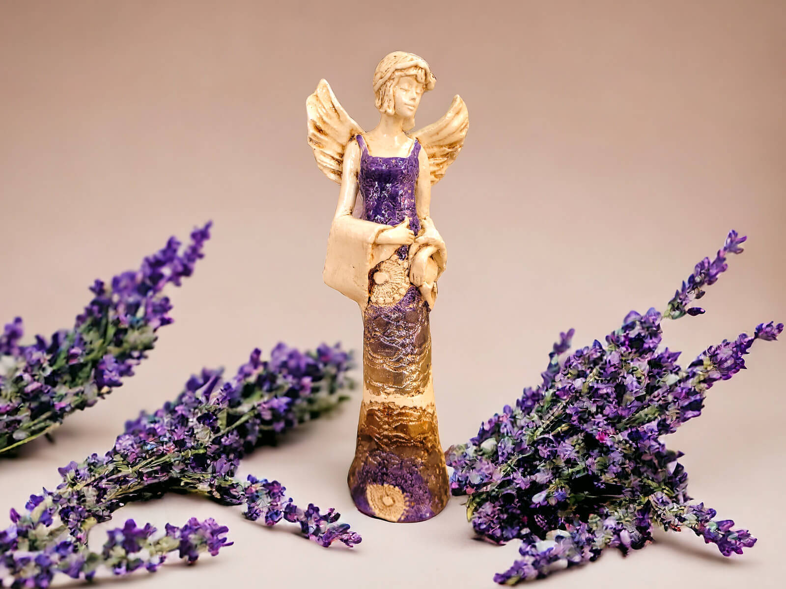 Anioł Frances wyróżnia się nie tylko finezyjną formą, ale także bogatą kolorystyką. Z fioletowym topem i złotą suknią emanuje wyrafinowanym urokiem, nadając wnętrzu subtelnego luksusu.