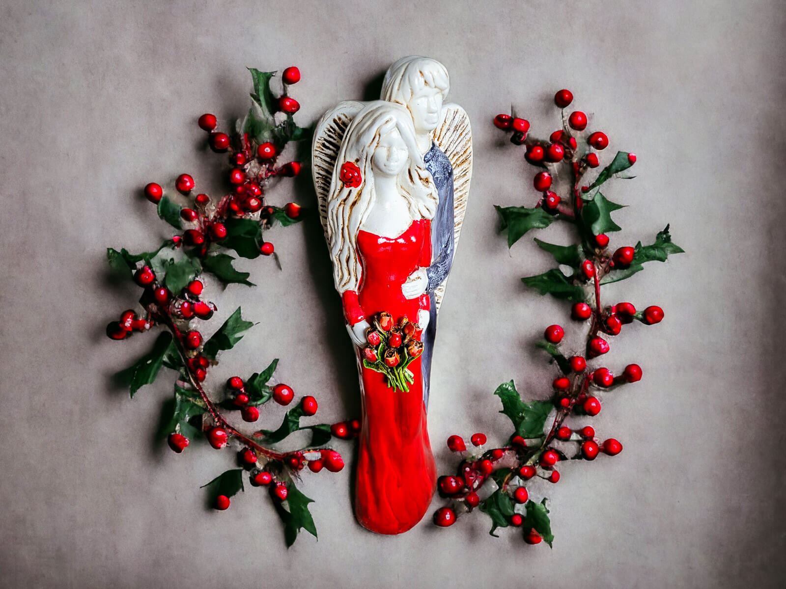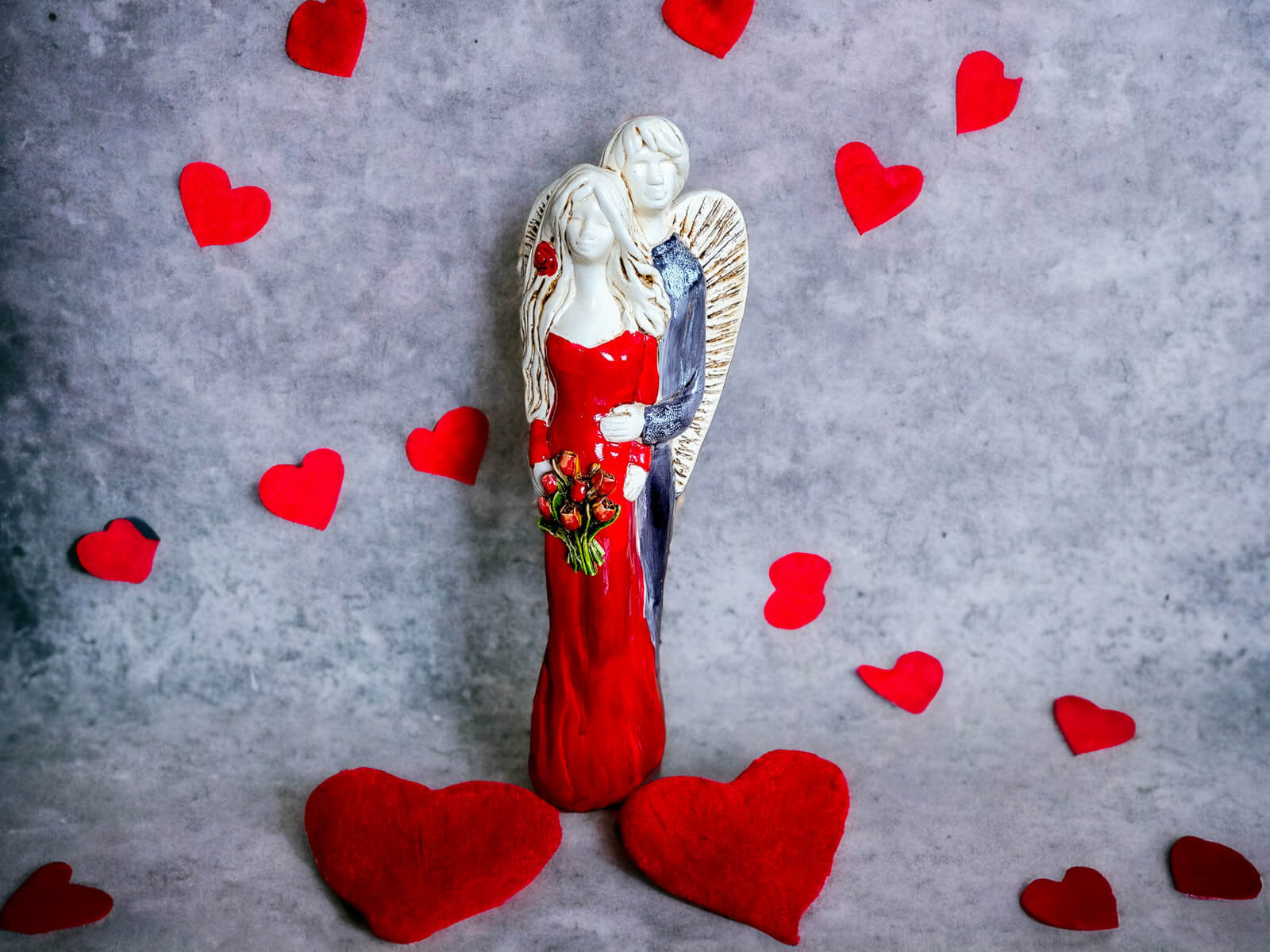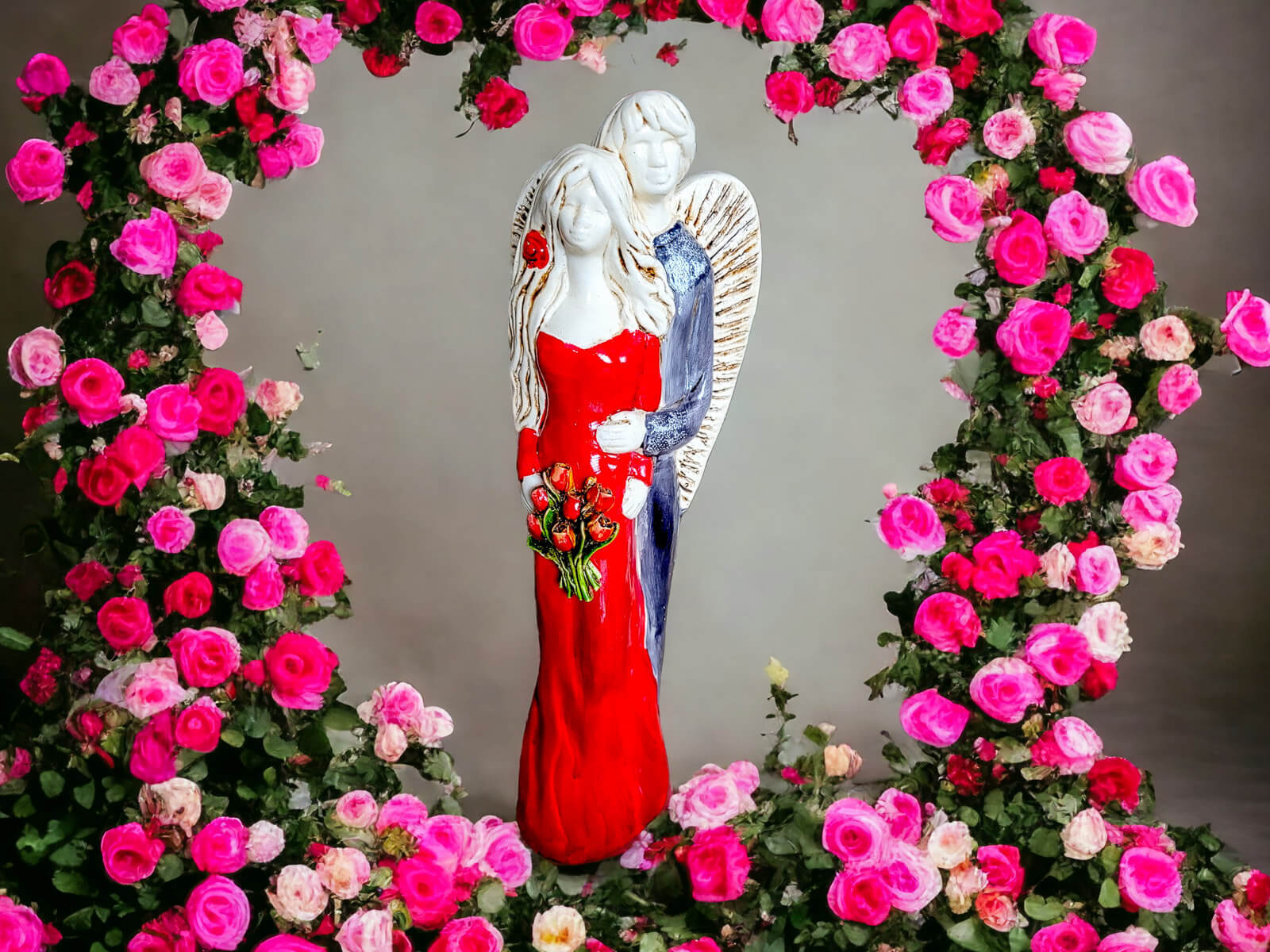 Figurka Miłujące Anioły - ręcznie robiona figurka aniołów będąca połączeniem elegancji i uczuć. Para aniołów, ona w czerwonej sukni, on w ciemnoszarym garniturze, tworzy niezwykle ujmujący obraz miłości.
