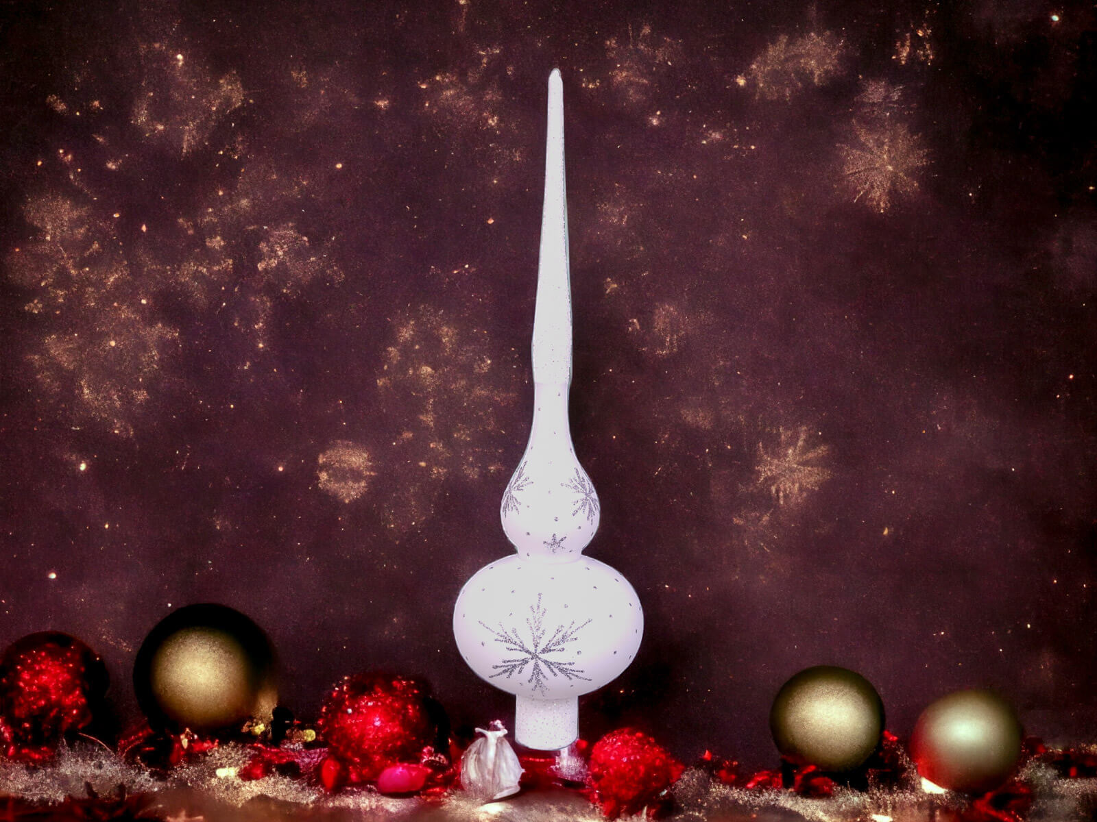 Szpic przyciąga uwagę i nadaje choince unikalny charakter. Na białym tle szpica rozmieszczone są srebrne gwiazdki, które tworzą delikatny, ale efektowny wzór. Gwiazdki te, migoczące w blasku świateł choinkowych, dodają bombce elegancji i delikatności. Srebrny połysk kontrastuje z białym podkładem, tworząc subtelny, lecz efektowny efekt wizualny.