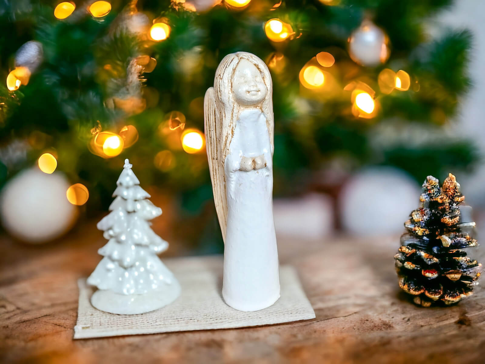 Anioł Słodziak to ręcznie robiona ozdoba dodająca wyjątkowy urok każdej chwili. Słodziak prezentuje się w uroczej sukni w kolorze czystej bieli. Biel symbolizuje czystość, niewinność i harmonię, co sprawia, że figura ta doskonale wpisuje się w różne aranżacje wnętrz i dodaje im subtelności. Każda figurka Słodziak jest dziełem rąk artysty, co gwarantuje unikalność i dbałość o detale. Starannie wykonane rzeźbienia sukni i subtelne rysy twarzy tworzą harmonijną całość, emanującą pięknem.
