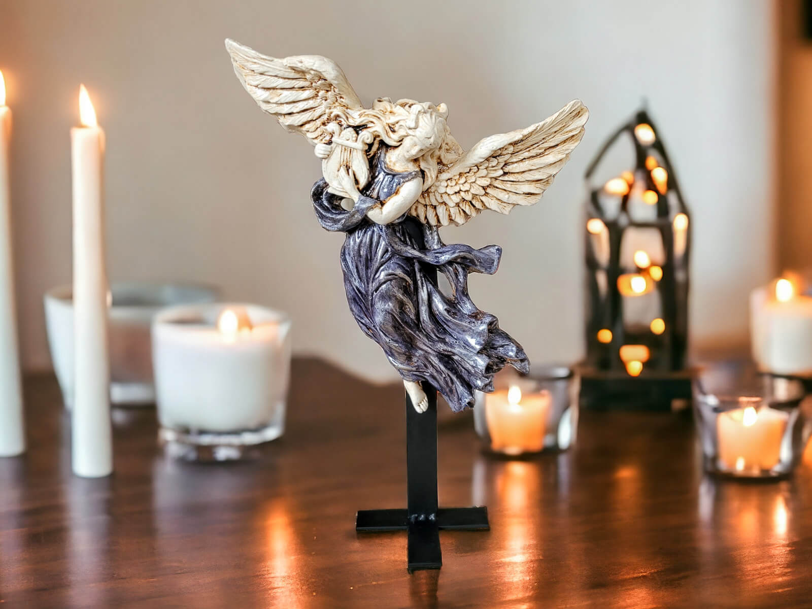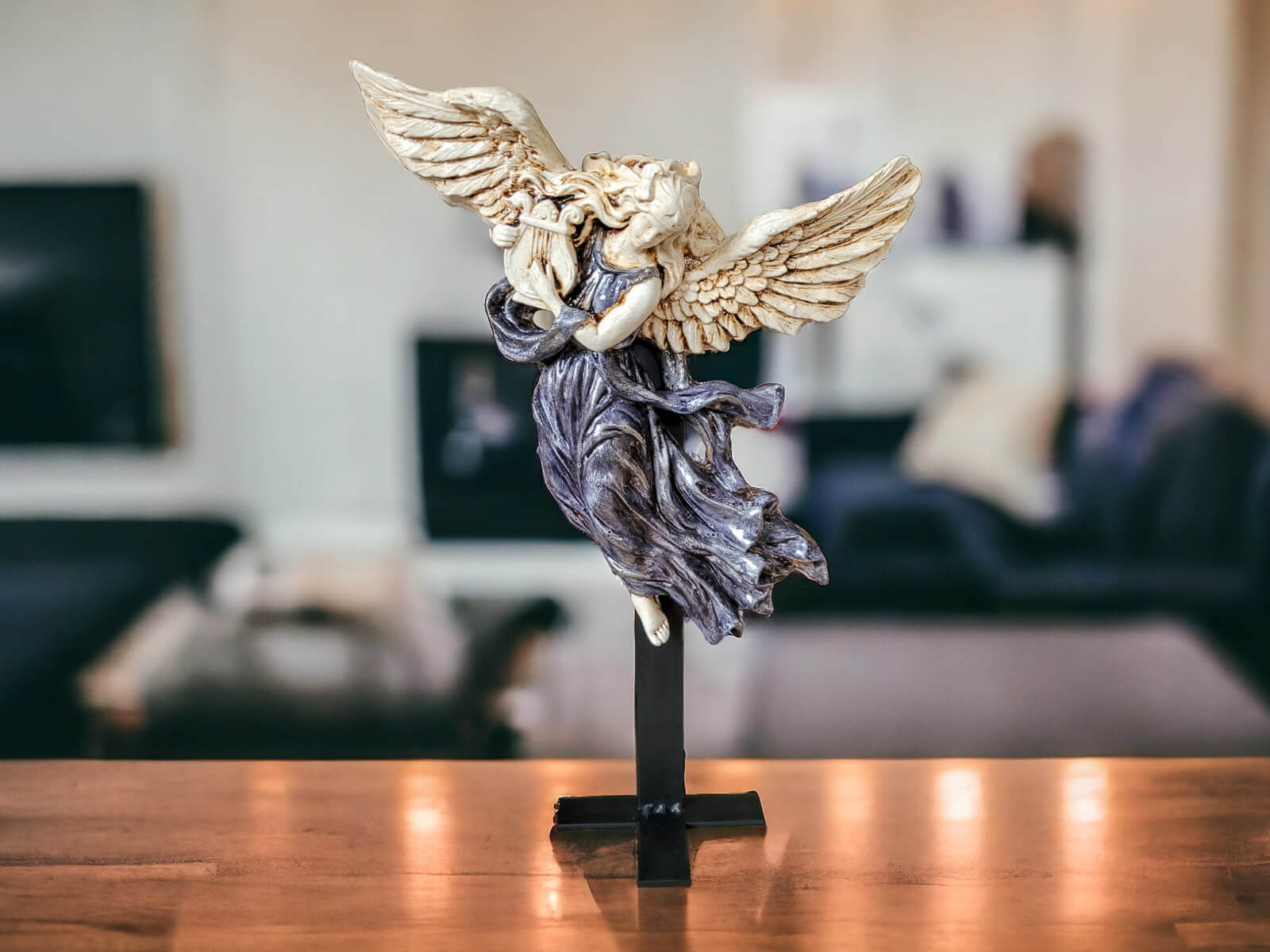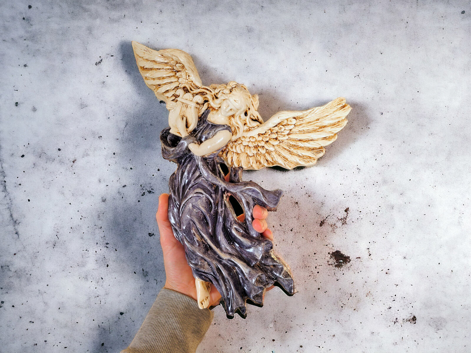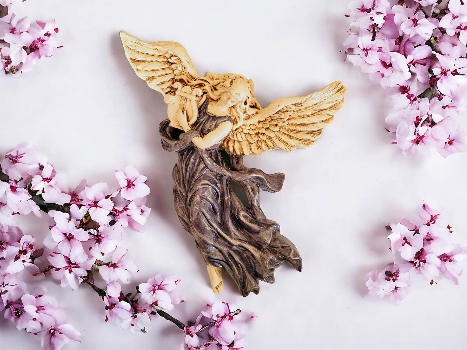 Anioł, ze swoimi rozłożystymi skrzydłami, ukazuje się jako muzykalna istota grająca na harfie. Każdy detal tej figurki został starannie ręcznie formowany, a następnie malowany, nadając postaci niepowtarzalną głębię i wyrazistość.