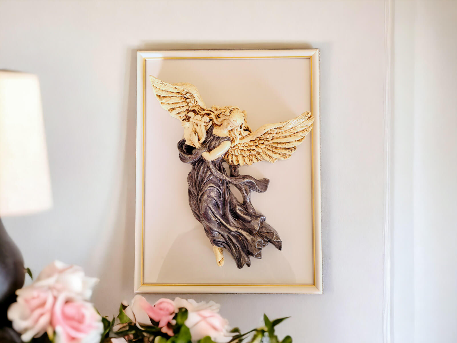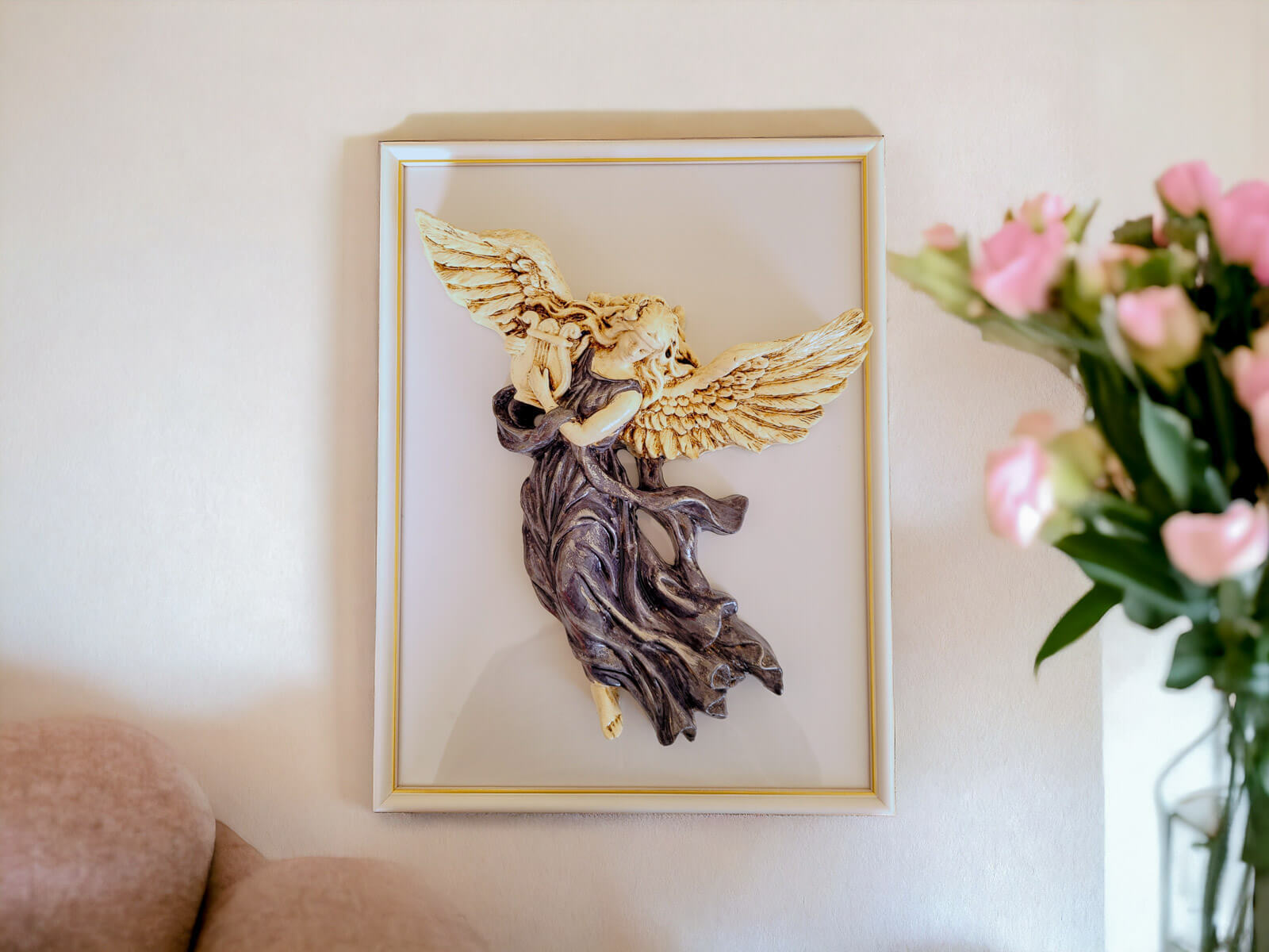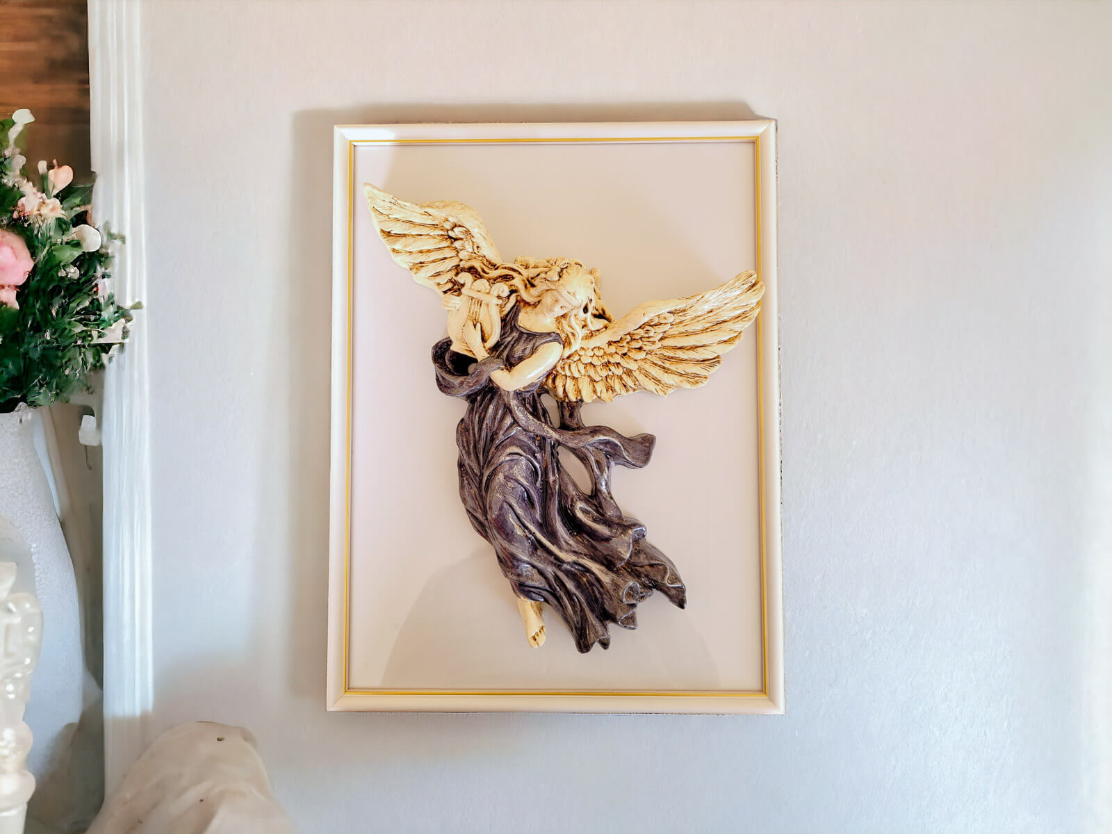 Dla dodatkowego efektu estetycznego, istnieje możliwość zakupu anioła z elegancką drewnianą ramką. Anioł jest przyklejany do szyby ramki mocnym klejem, tworząc efektowną kompozycję na ścianie.