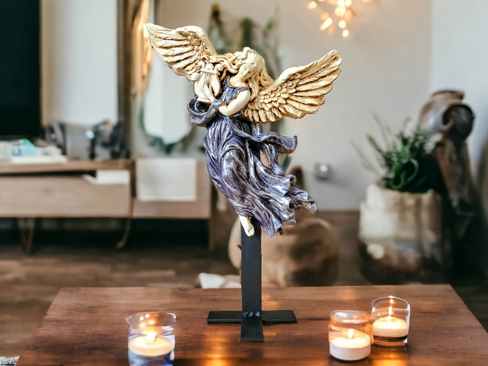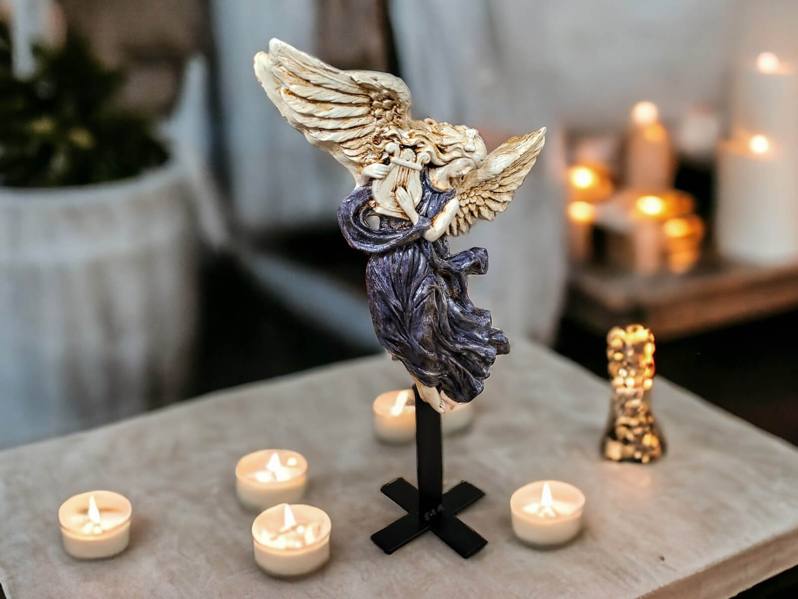 Stojak wykonany jest z grubej ciężkiej stali dzięki czemu jest stabilny, bez ryzyka łatwego przewrócenia. Dodatkowo statyw można od spodu podkleić taśmą dwustronną dzięki czemu anioł będzie jeszcze bezpieczniejszy.